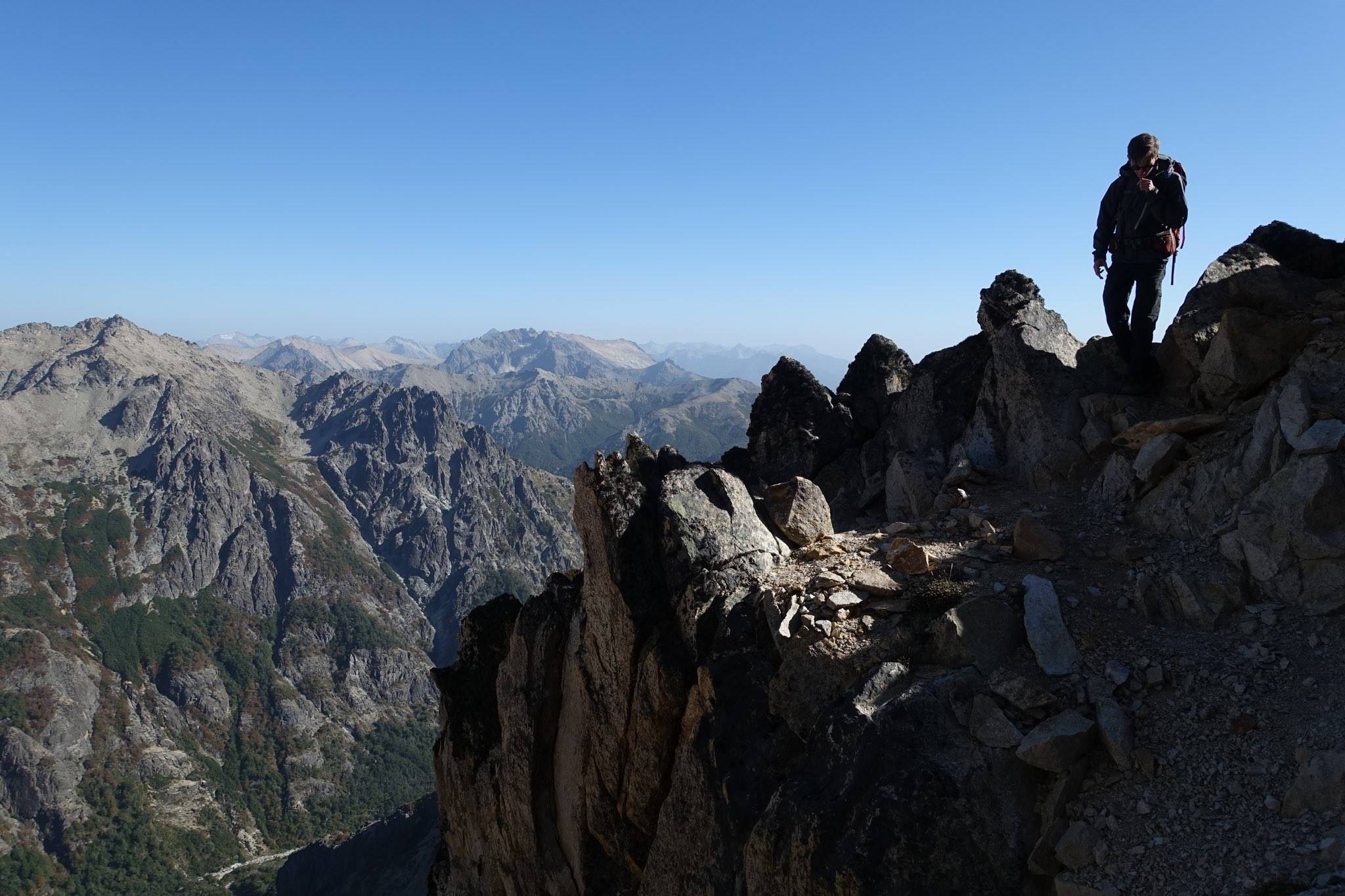 Once around the lake, we enjoyed views back west toward the lake and one ridge over, to Cerro Catedral. With some more climbing, a spectacular panorama greeted us, encompassing Cerro Negro, Laguna Club Andino Bariloche, Mount Tronador, and the spire of Volcán Puntiagudo.