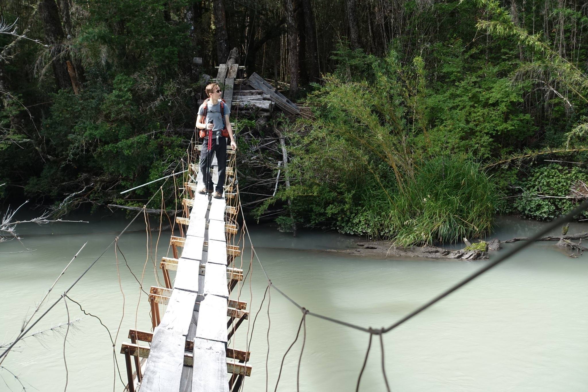 With a boat to catch, we reluctantly left this view to continue down. At the valley floor, the trail entered the woods. It was much more humid on this side than on the southern side of the pass. The trail continued along the east side of Río Frías, with occasional, broken views across to the mountains. Eventually, it crosses Río Frías on a suspension bridge, joins what appeared to be an old wagon road, and enters Puerto Frías.