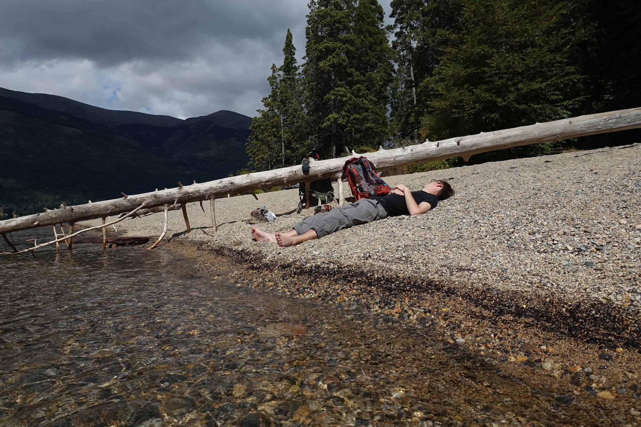 At the end of the ridge, the trail reaches another col and a junction at Cancha de Futbol. Passing through the col, we were rewarded with views of Laguna Schmoll, nested in a rocky bowl among Cerro Catedral’s jaggy spires. We descended the rocky trail to the lake, enjoying the view every step of the way. This was Kyle’s favorite spot on the hike, if not on the entire trip.