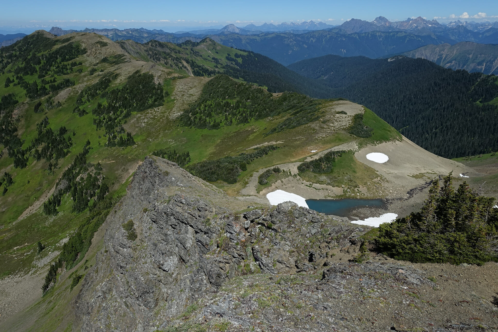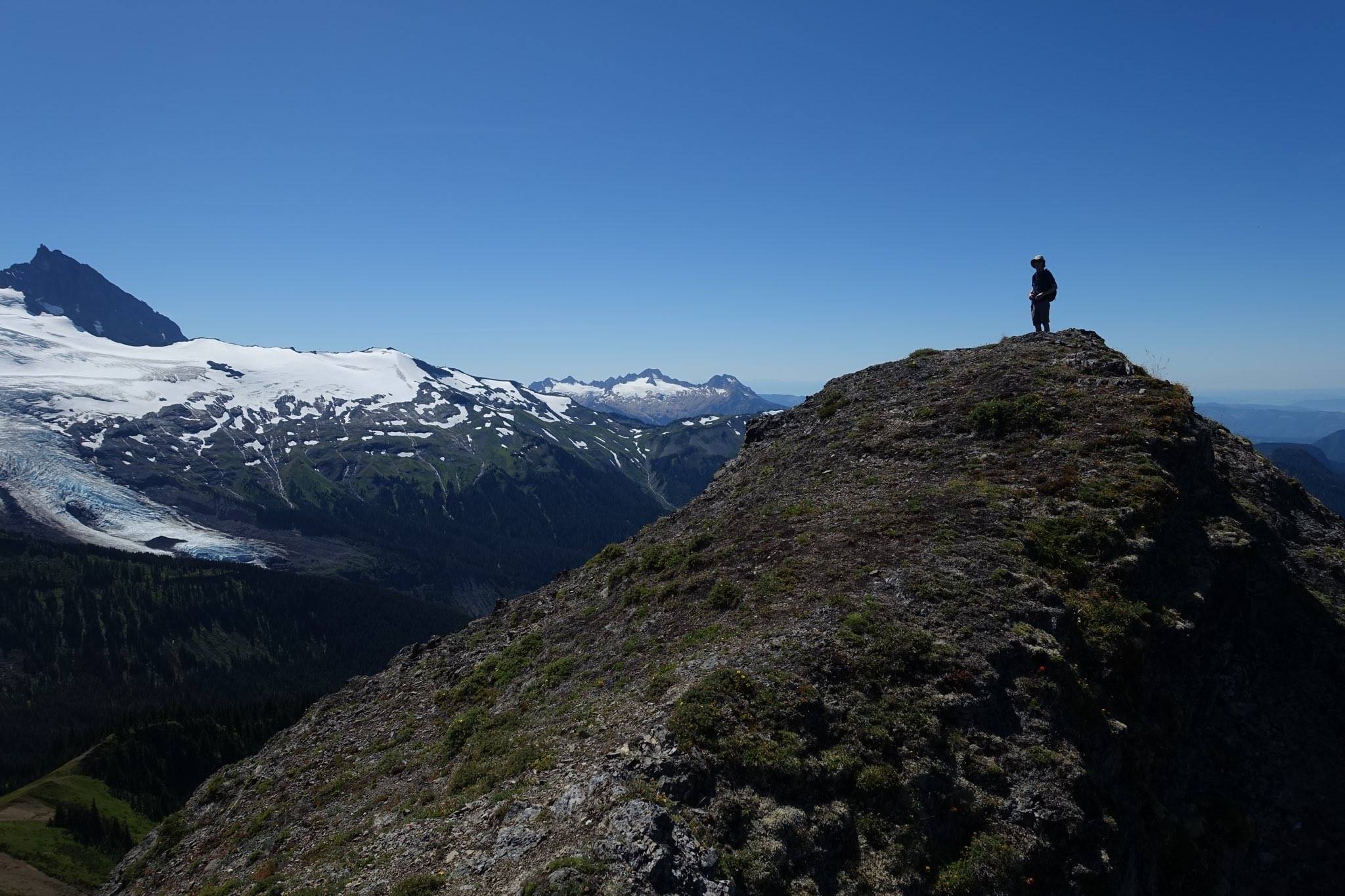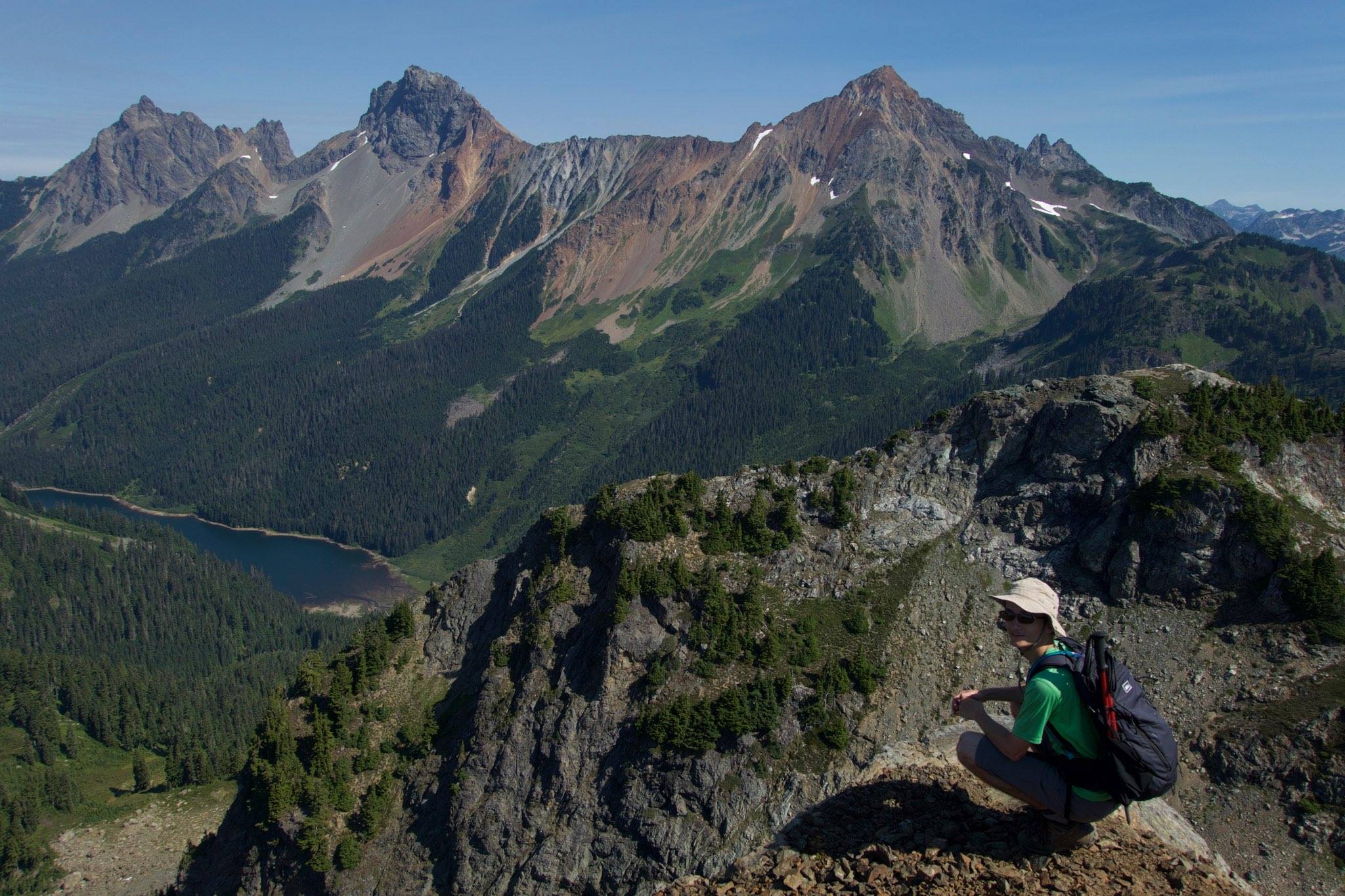 At the summit, we enjoyed 360º views — though you have to walk to see them. There’s a small island of trees right at the summit, but the views from all sides of it are breathtaking. To the south, Ruth and Shuksan rise, along with Mount Baker and the Nooksack Ridge. Various Canadian peaks dot the horizon to the north, with Copper Ridge to the east and Goat Mountain, Yellow Aster Butte, and a myriad of other summits to the west.