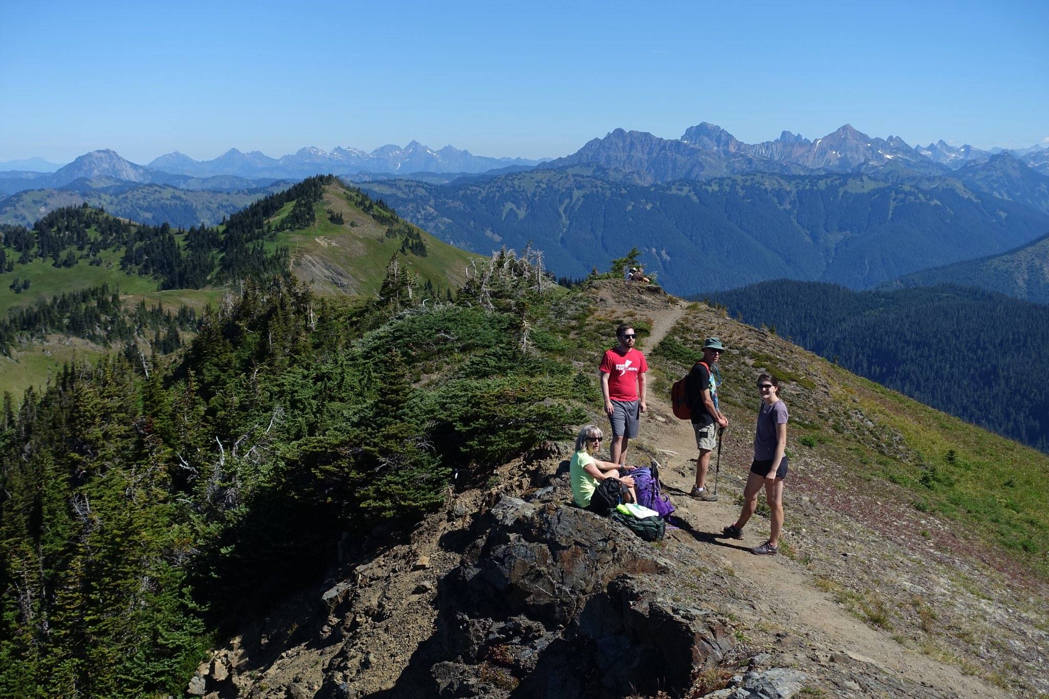 For our first hike, we chose Skyline Divide, which WTA describes as a 9-mile route with a moderate 2500′ of elevation gain. The ride to the trailhead was doable in our cars, though it required some maneuvering around deep pot holes and accepting there were some we could not maneuver around. From the parking lot, we covered the first 1500′ of elevation gain in two wooded miles, before emerging on the ridge line to great views.