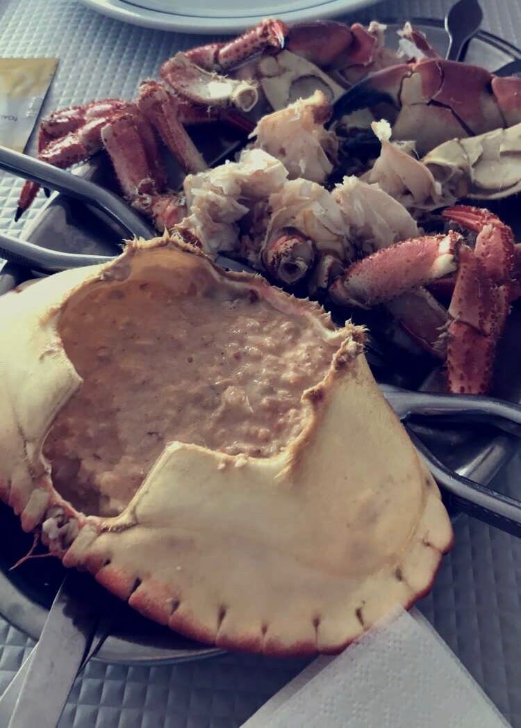 The highlight of this day was definitely our lunch stop at the delicious Restaurante a Azenha do Mar, perched atop a coastal cliff and only steps from the walking route. We arrived in the midst of the weekday lunch rush, but were able to stash our backpacks by the entrance and squeeze into one of the few remaining tables. We enjoyed healthy portions of fried prawns and Sapateira (from the tank behind us). This brown crab was notably cheaper (and markedly more fresh) here than in previous villages. Local toasts and a wonderful vino verde rounded out this memorable lunch.