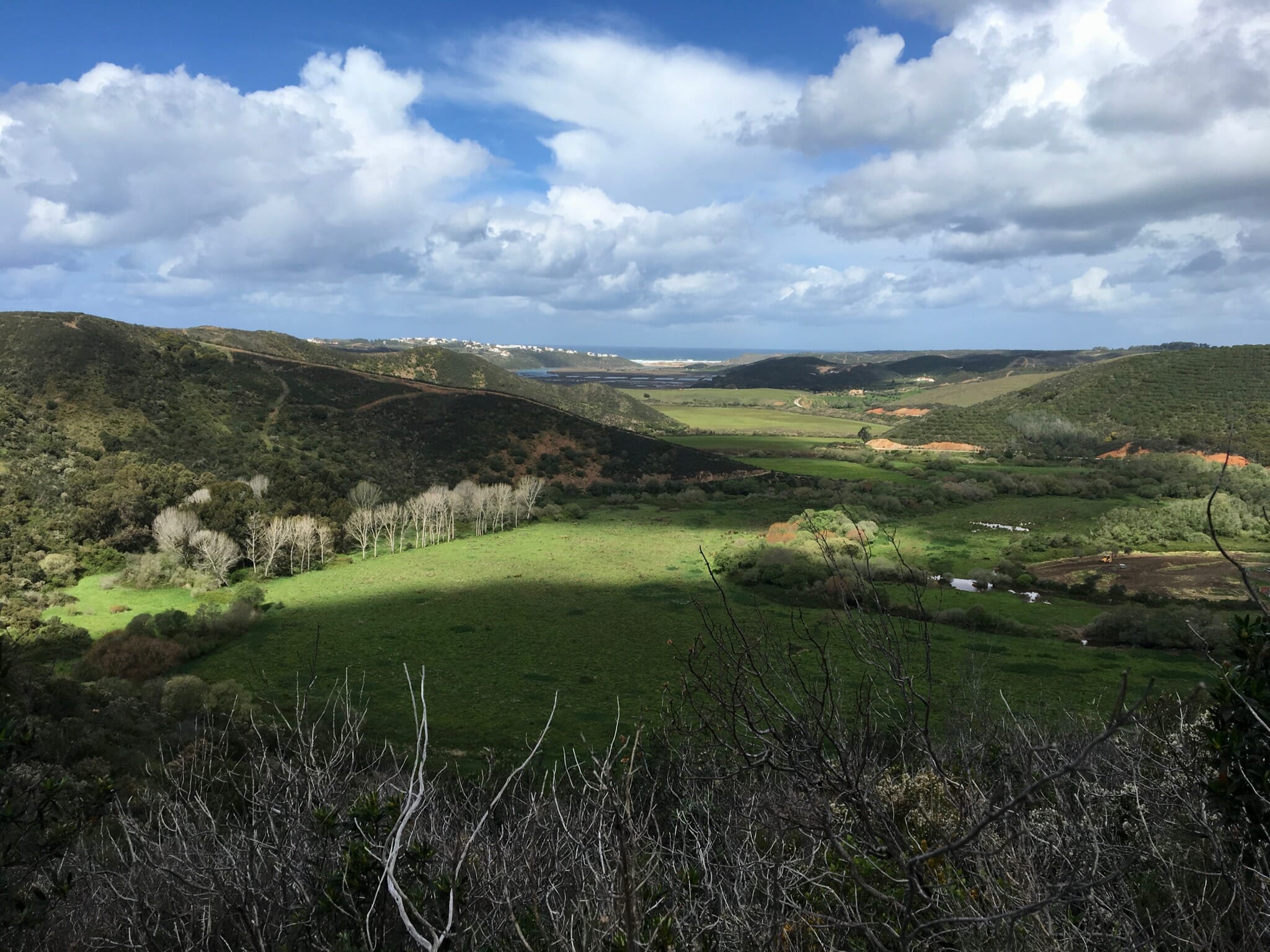 Thankfully, the inland stretch beyond Praia do Canal routes you through varied, lush landscapes that, while not as impressive as their coastal counterparts, are nonetheless beautiful. We especially enjoyed the vast green pastures of a local farm before Bordeira, complete with old farmhouses in varying states of decay, cattle, chickens, goats, herding dogs, and a lone rancher–who, in retrospect, did not seem very keen on having random hikers passing through his stock.