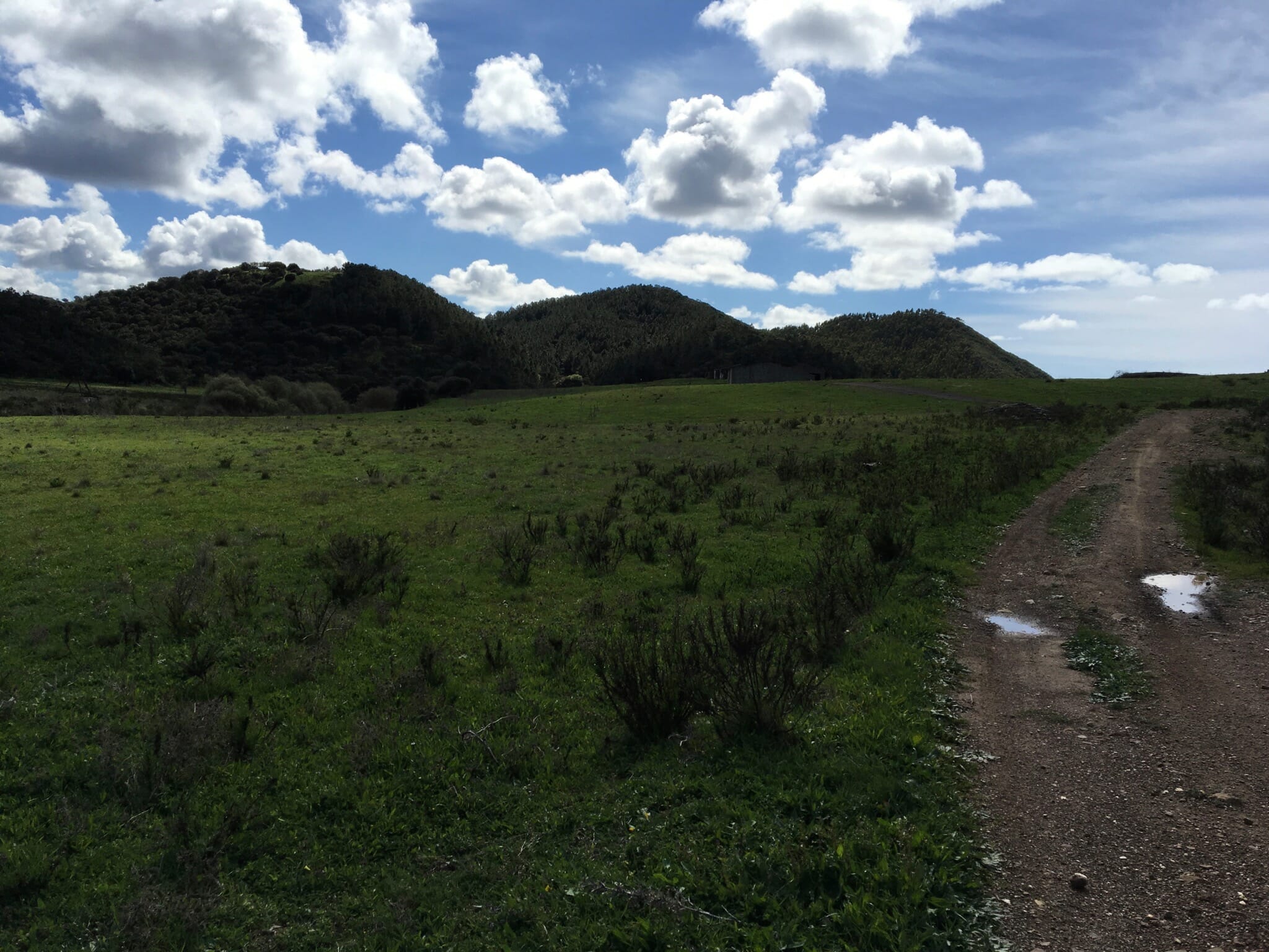 As we neared the end of the coastal section of this circuit, I knew we would soon rejoin the Historical Way near Monte João Roupeiro, but that the trail would progress southward along the (let’s be honest, uninteresting) irrigation channel. Fortunately, the increasing clouds in the forecast rolled in only after we made it to the irrigation channel, and cast the interior landscape in a myriad of grays. Walking along the channel was rather mundane, but we made excellent time despite the intermittent light rain.