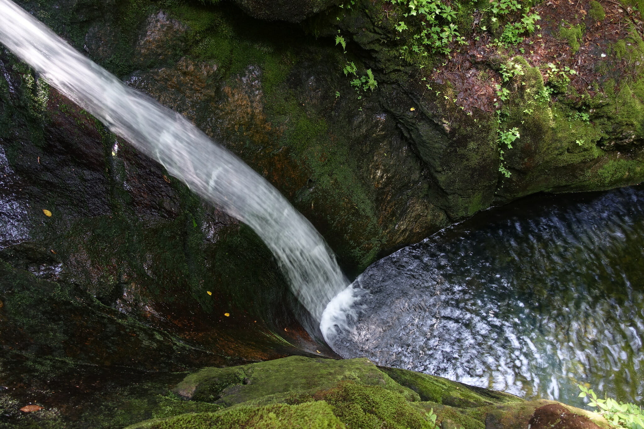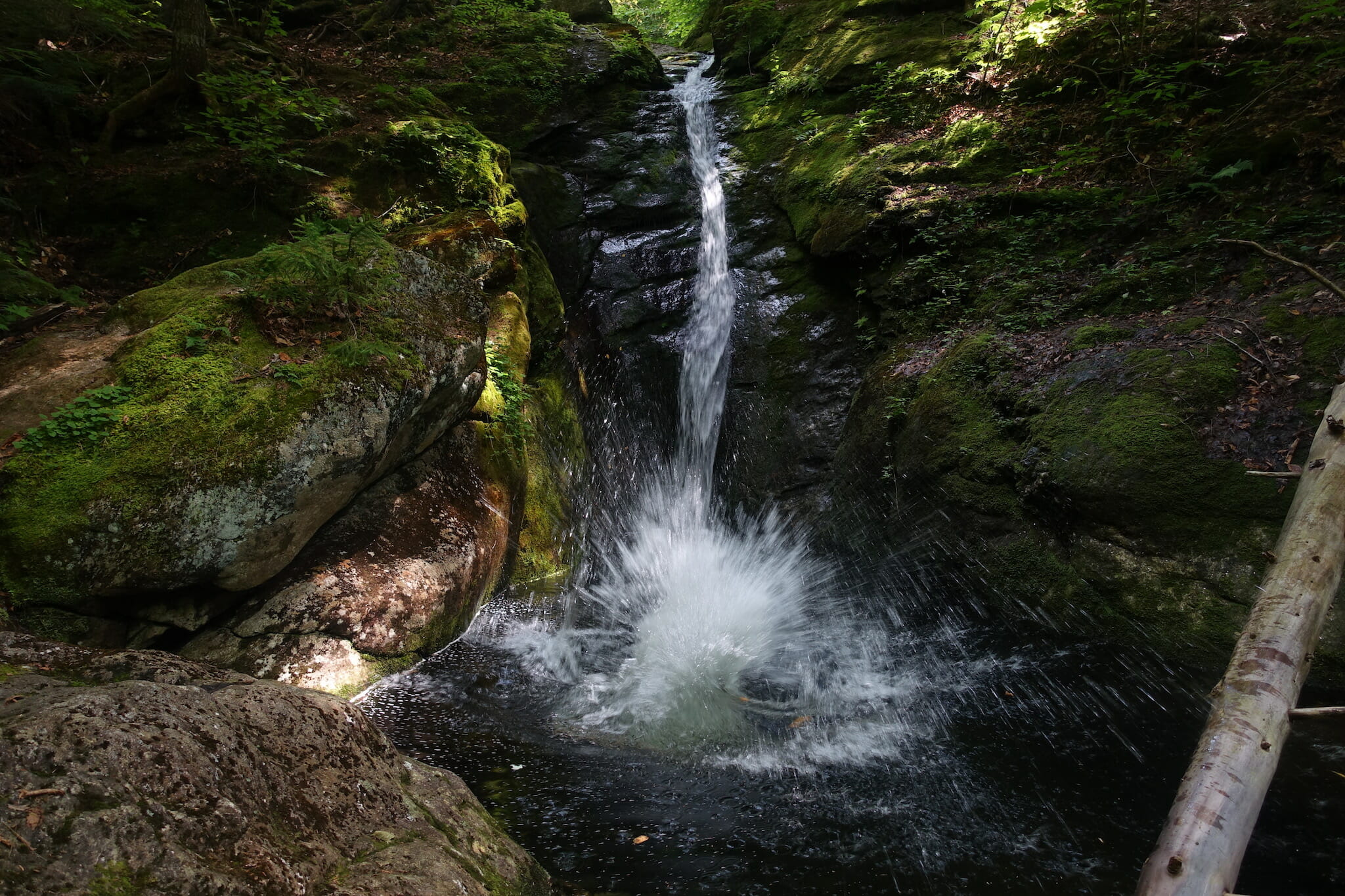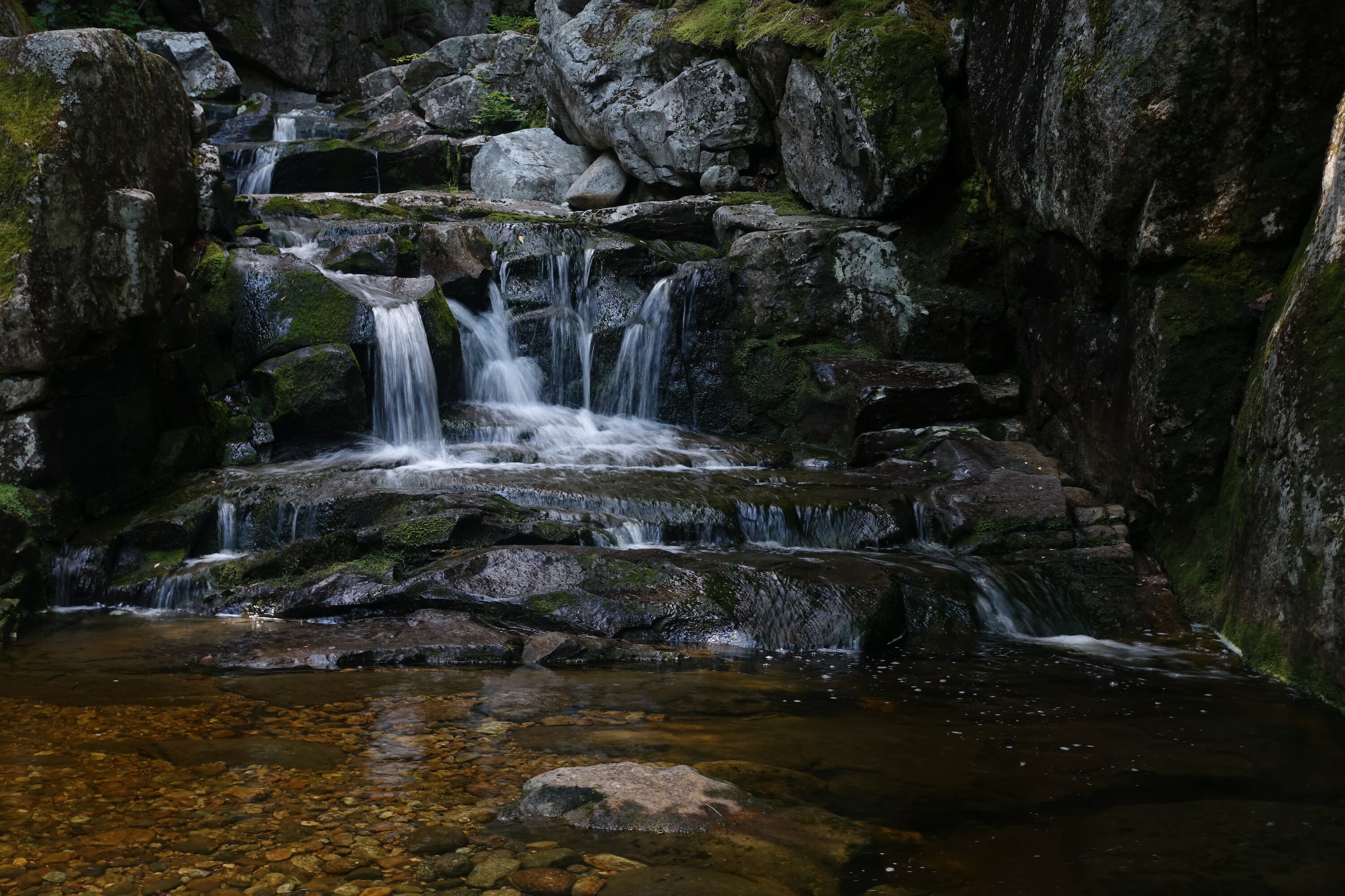Once across the brook, the trail continues to follow it, climbing a bit more. Several social paths lead down to the brook, offering places to stop in small pools or on granite slides. Moss and fallen leaves can be slippery, so use caution if you venture down; I skinned many knees on these rocks as a child.