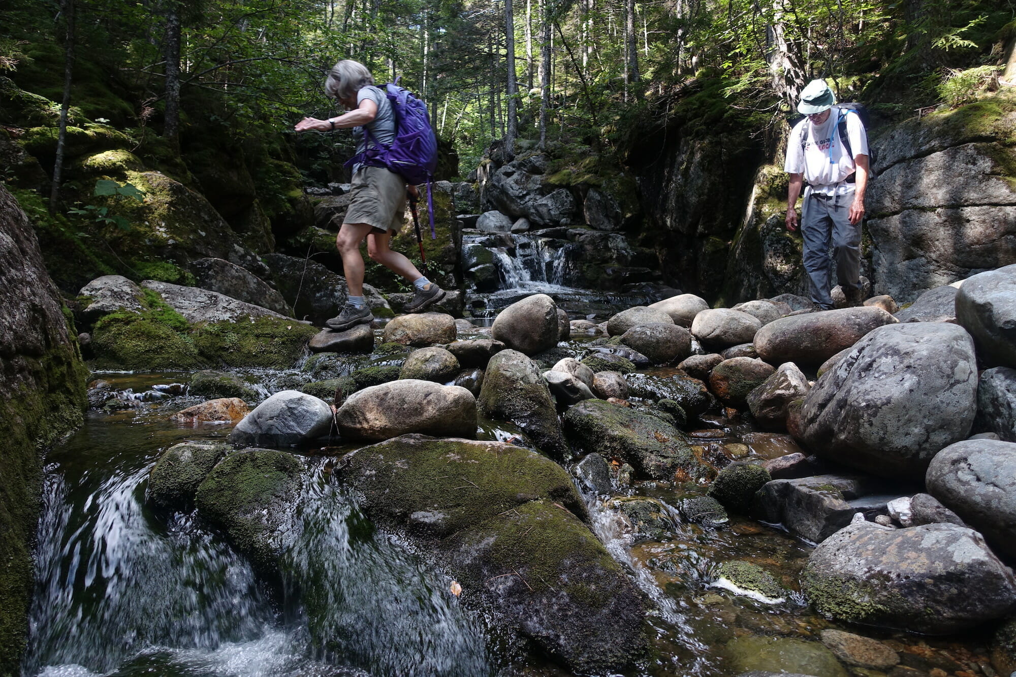 For days with questionable weather, we often head to Basin Rim. The hike is almost entirely in in the trees, providing shelter from rain. The route offers both lovely brooks and a viewpoint at the end, and trails offer good options for some hikers to walk back to Cold River Camp if the weather clears up.