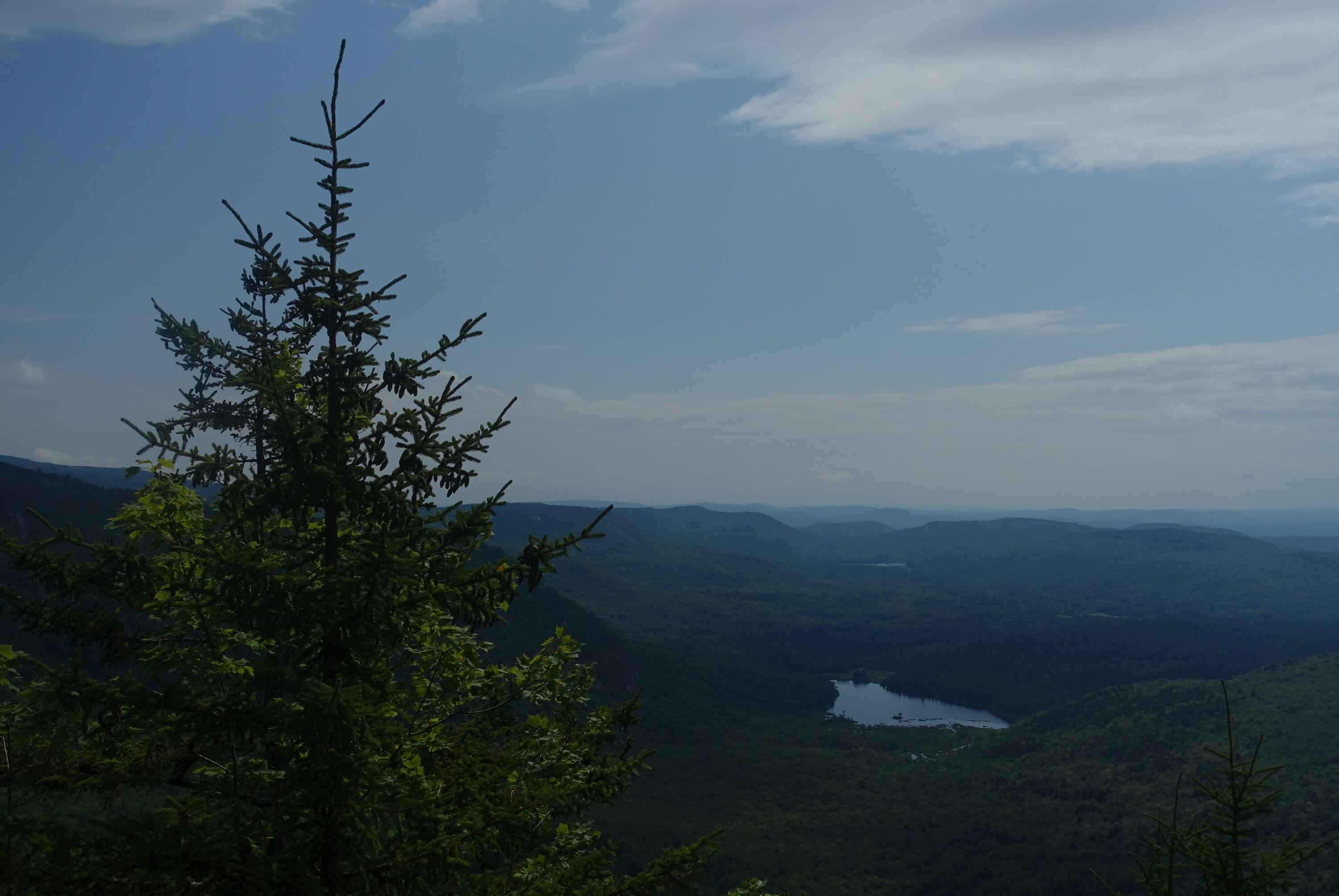 From rim junction, head north a few hundred yards to a side trail on your right. This leads out to a ledge and cliff overlooking Basin Pond, with views of Basin and across to Speckled-Blueberry.