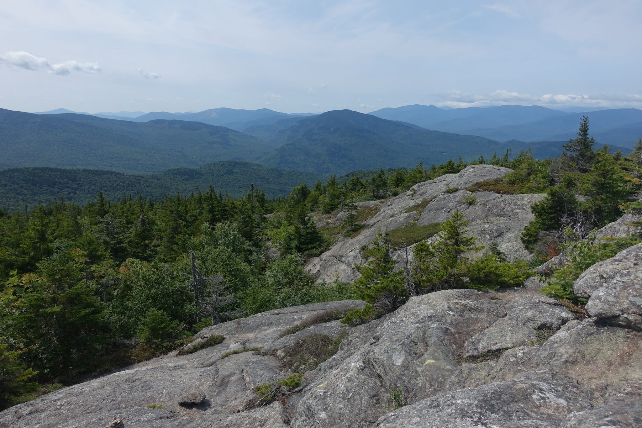 From the summit of South Baldface, a completely exposed (other than blueberry bushes) trail leads down to Baldface Knob. To the right, a trail leads toward Mount Eastman (views mostly obscured by trees) and the Slippery Brook trail. If the weather is good, descend to the left, on the ledges. These granite ledges are steep and exposed, offering excellent views of the Evans Notch area and Maine for the entire descent. Again, blueberries here are usually quite good and often excellent. Do not, however, attempt the ledges if they are wet or the weather is bad — instead, choose the forested route down via Slippery Brook (which is much less slippery).