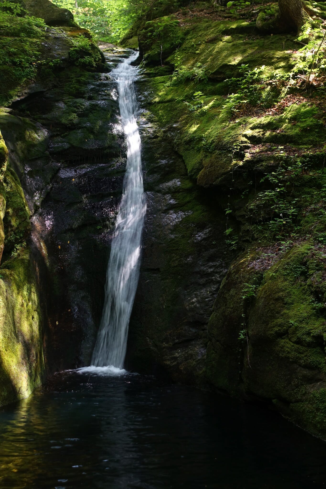 From the junction (at 3.9 miles), take the left fork along the Caribou Trail. About a mile from the junction, you will reach a small stream crossing. Look below at the 25′ is Kees Falls. A side trail leads to the base of the waterfall, with a view and a swimming hole that is typically pleasant but chilly. Whether or not you swim, and whether or not you go to the base of the falls this is a good spot for a break.