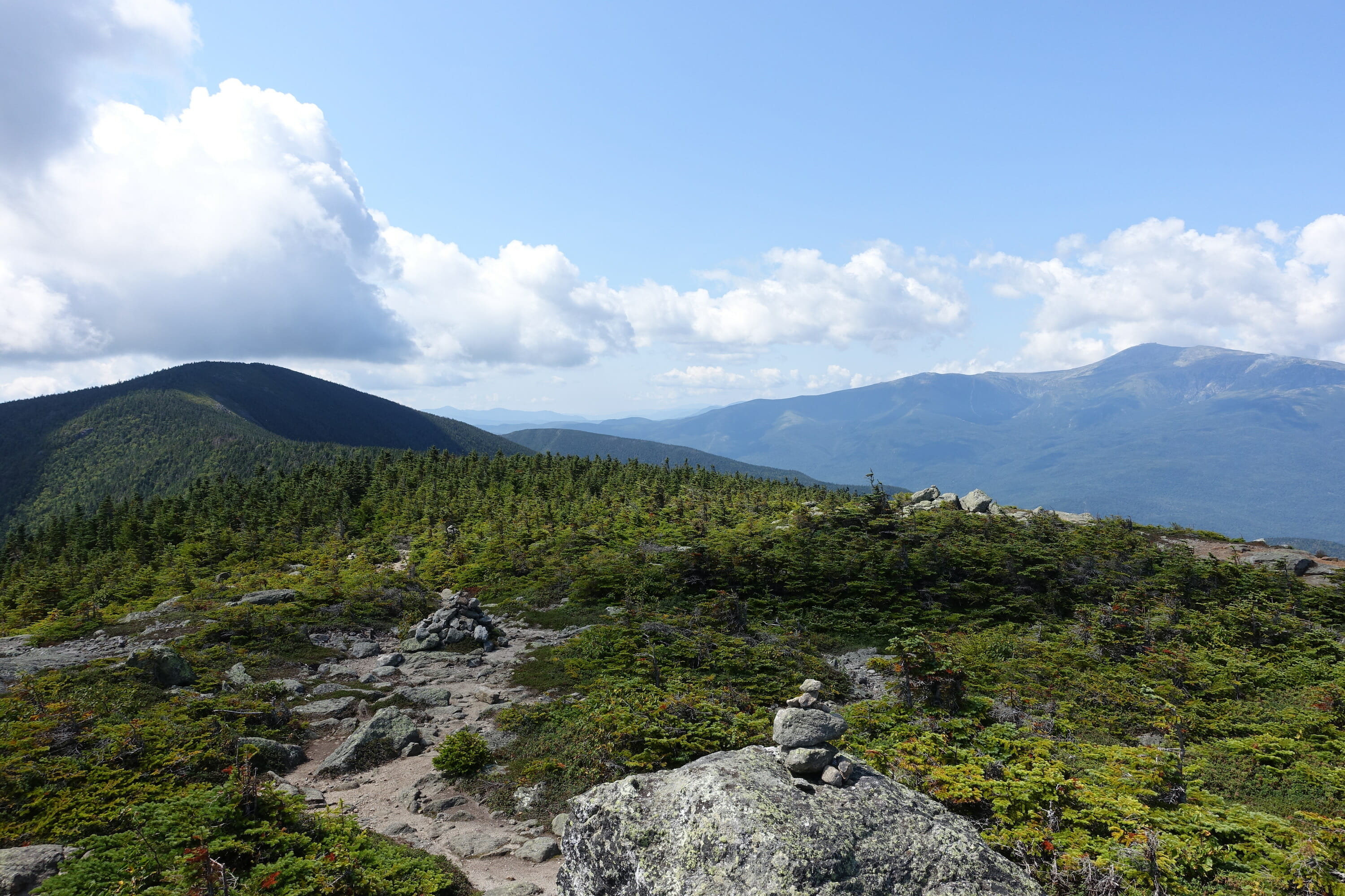 At the summit, still bare from a 1903 fire, take a break. Before you lay the best views from the Carter-Moriah range. Mount Madison, Mount Adams, Mount Jefferson, and Mount Washington, with the Great Gulf between them, are to the west. To the east, the roadless Wild River Valley separates you from the Baldfaces, Mount Meader, and the Royces.