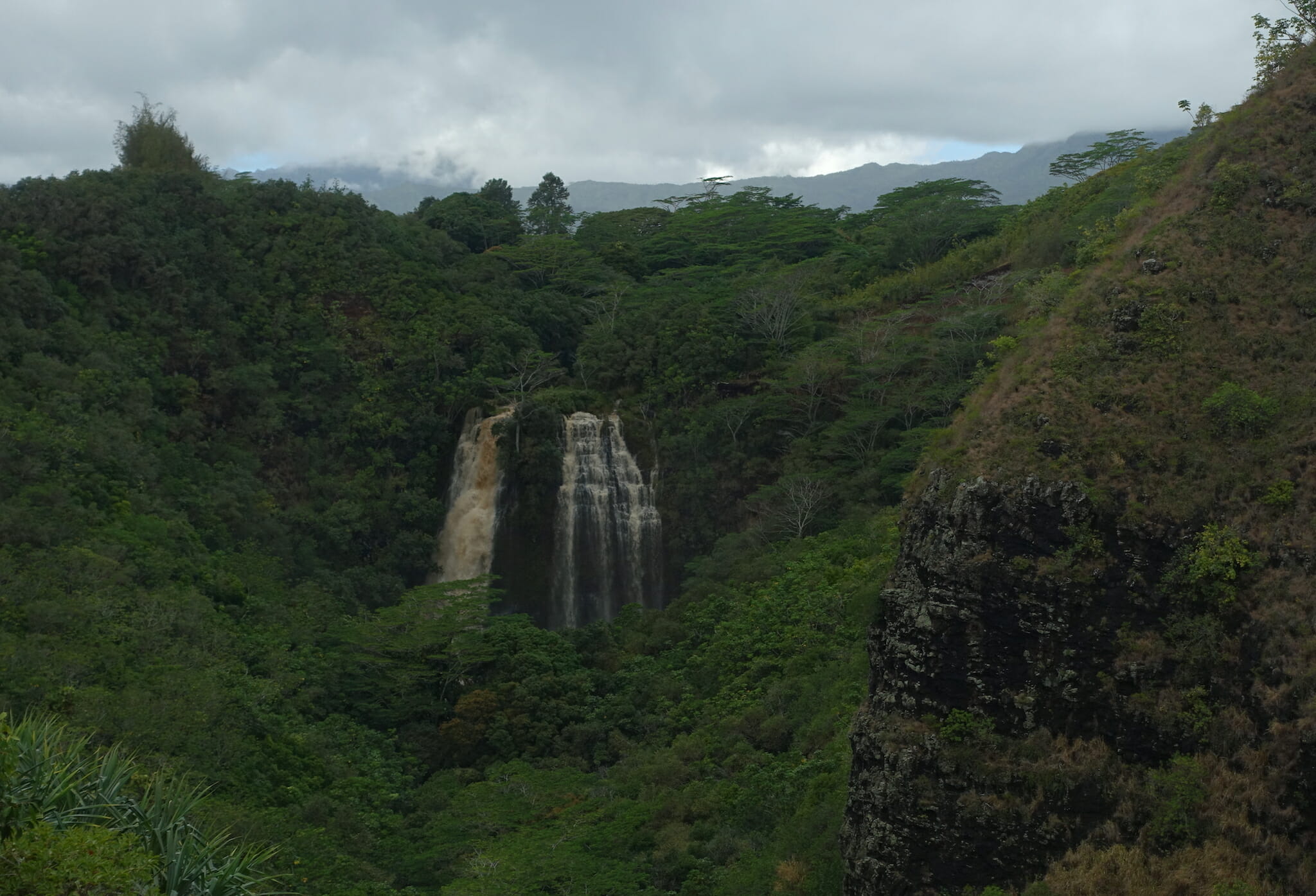 Despite the temptation to wander to the beach and slip into a food coma, we decided to continue on around the island. Opaek’a Falls — seen in the distance from a roadside viewpoint — made for our next stop. We also visited Poliahu Heiau, just across the street.