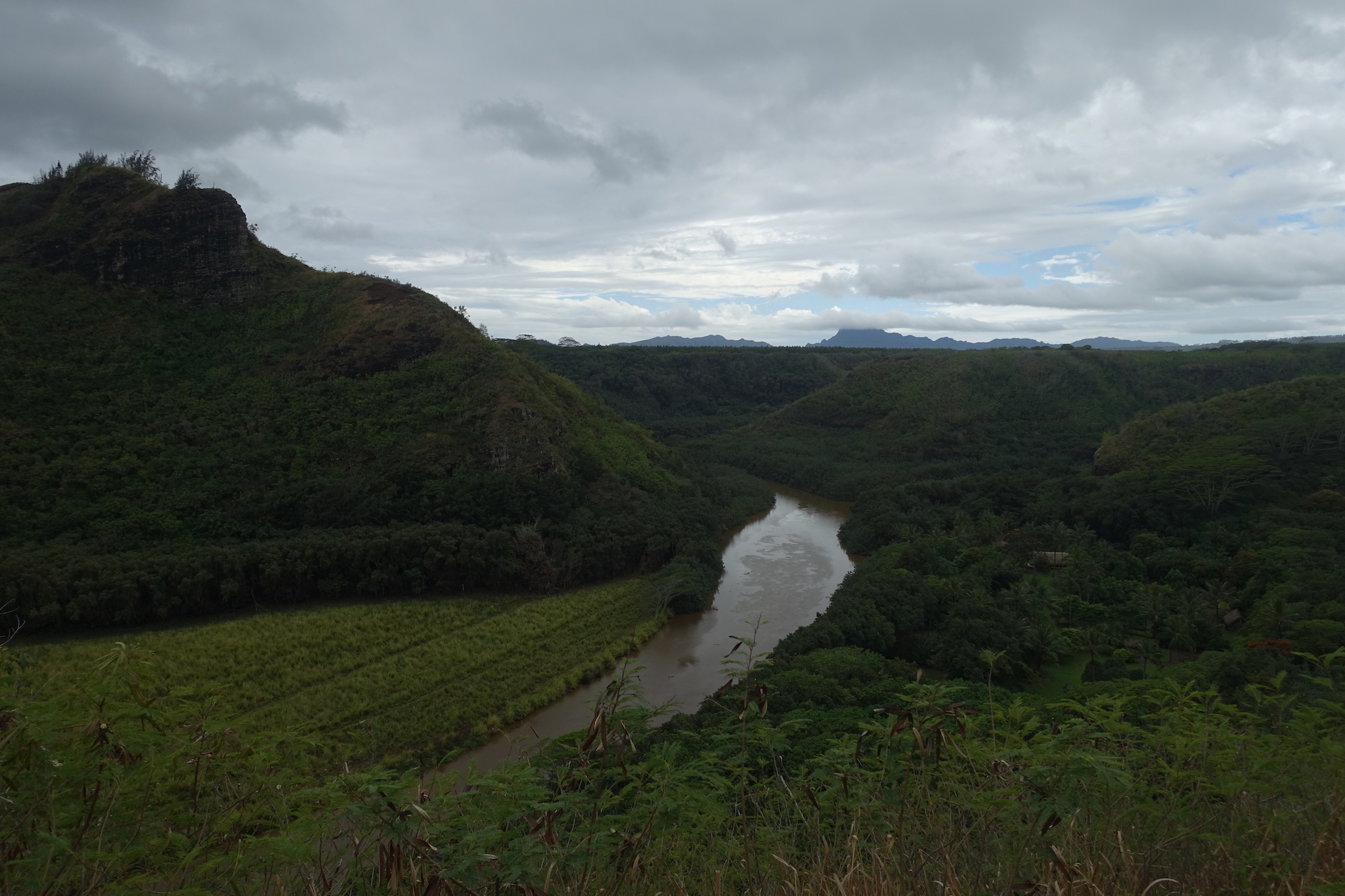 Eventually, we reached what appeared to be a high point and maybe the end of the line. While perhaps a scant trail continued it, it would clearly be difficult going and the clouds had grown darker. We enjoyed views of the Kalihiwai River and headed down.