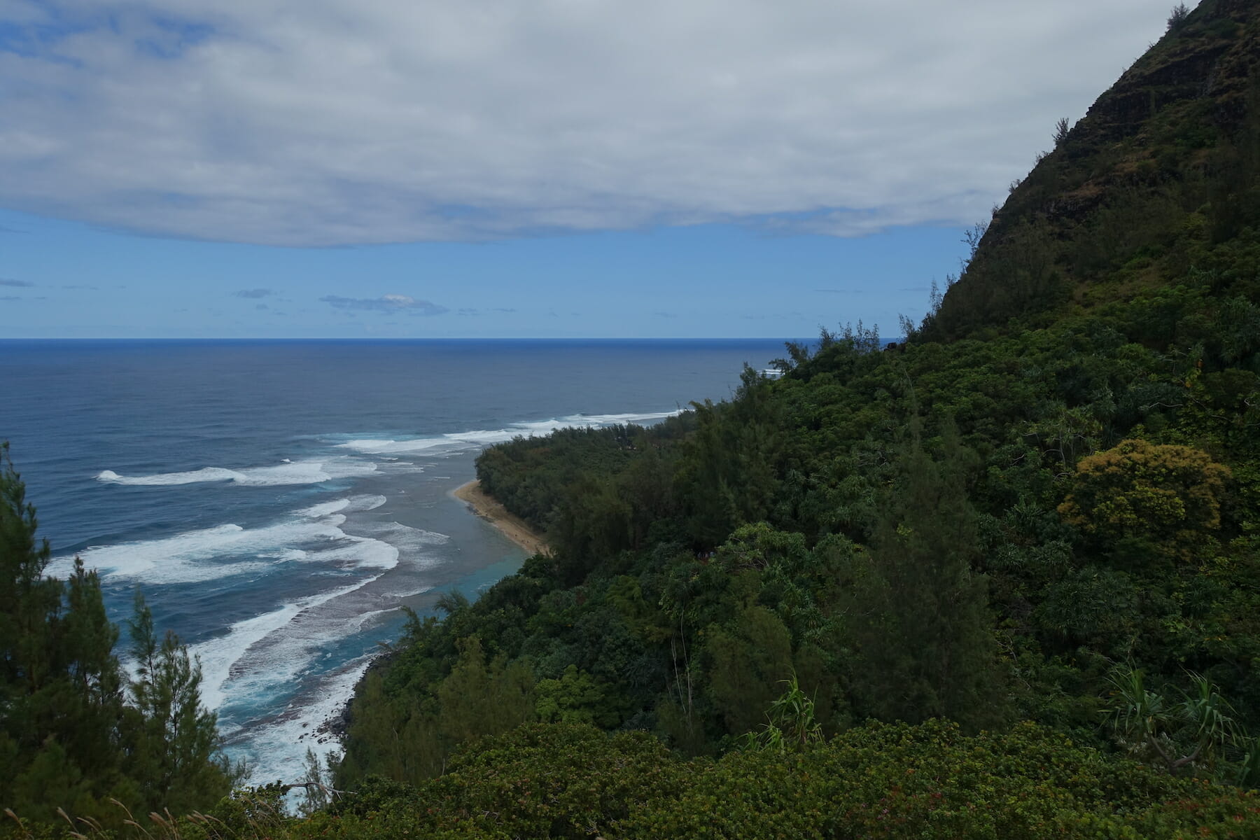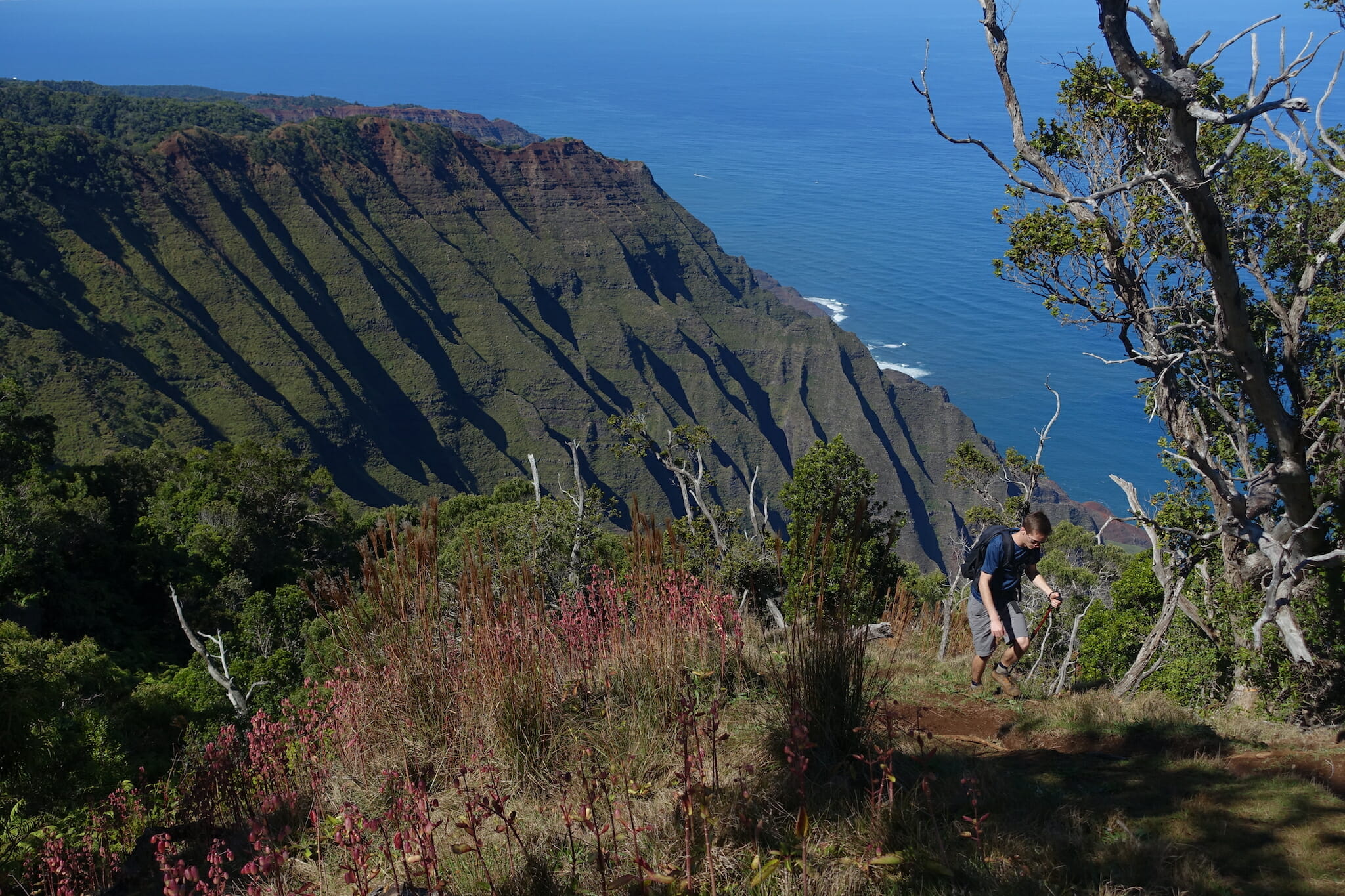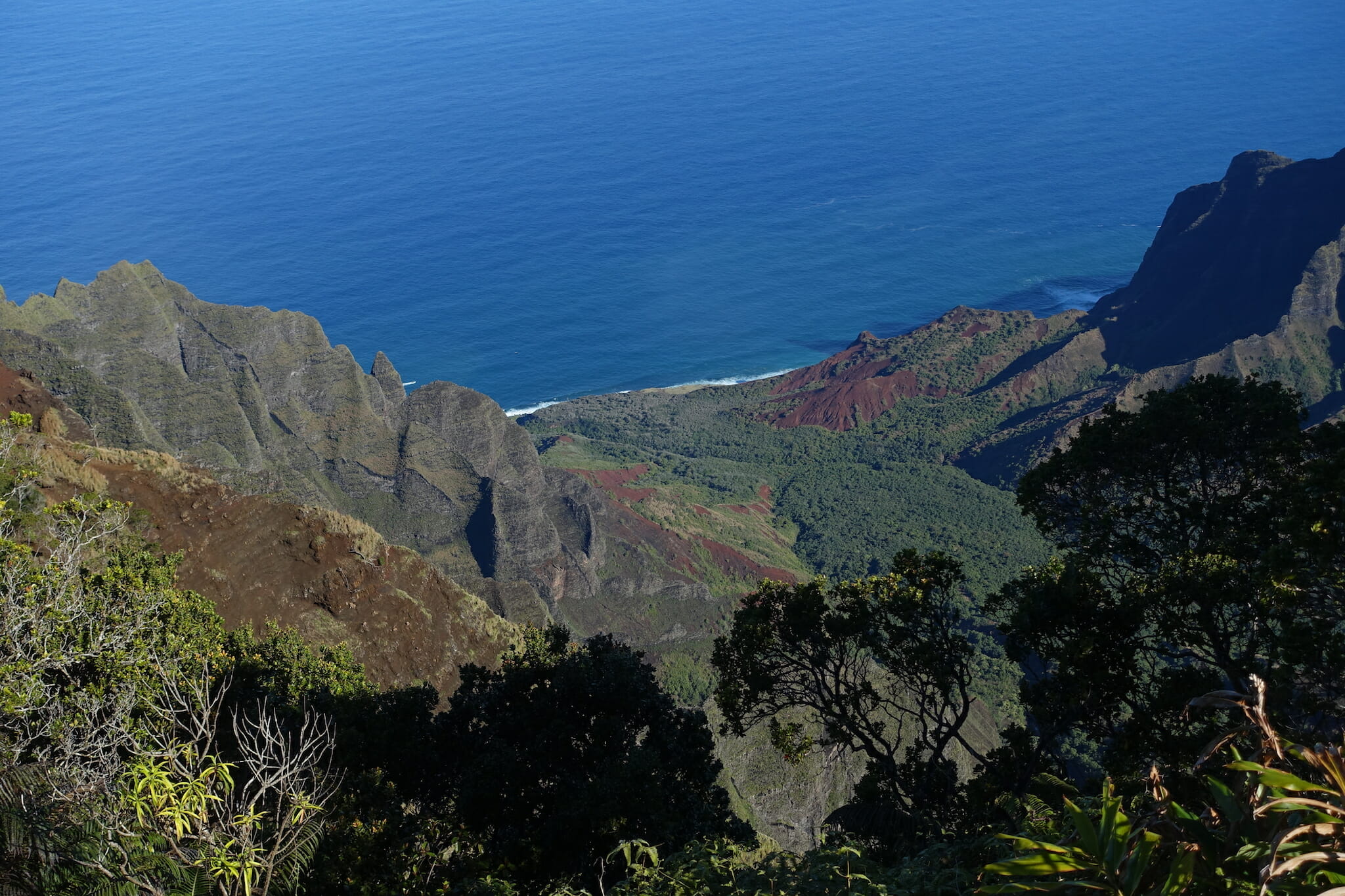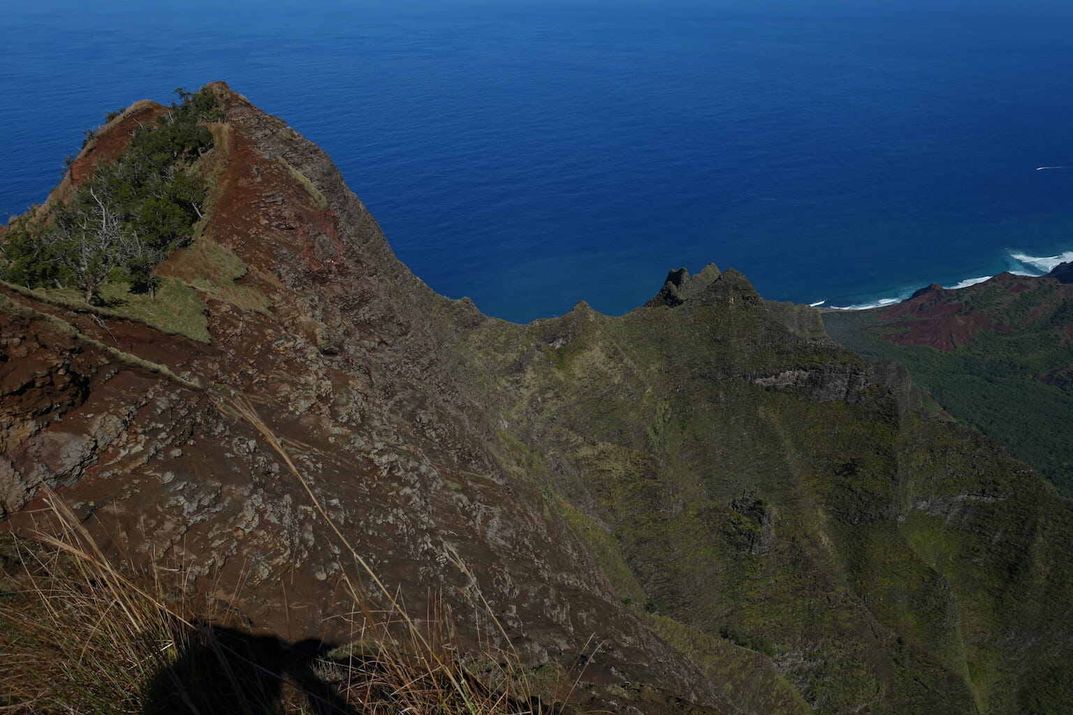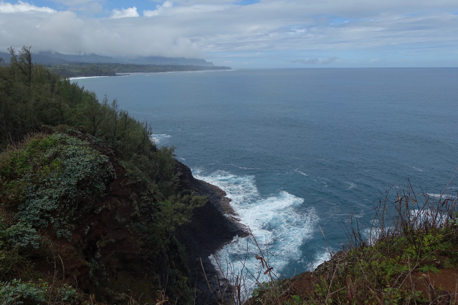 The trail descended through the forest, often on slippery mud, before reaching an open crest of the ridge. From here, there are peak-a-boo views of Honopu Valley to the west, and extensive views of the Kalalau Valley to the east.