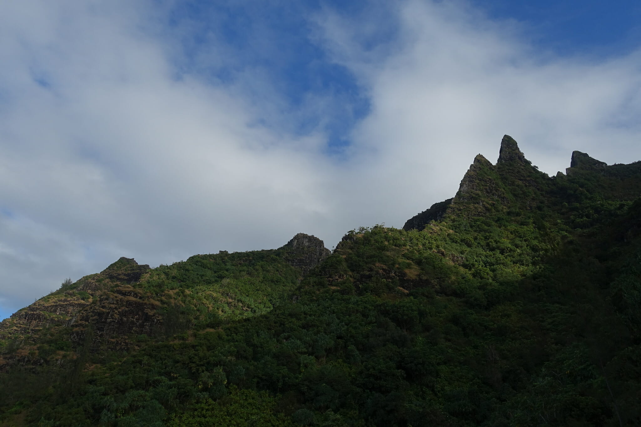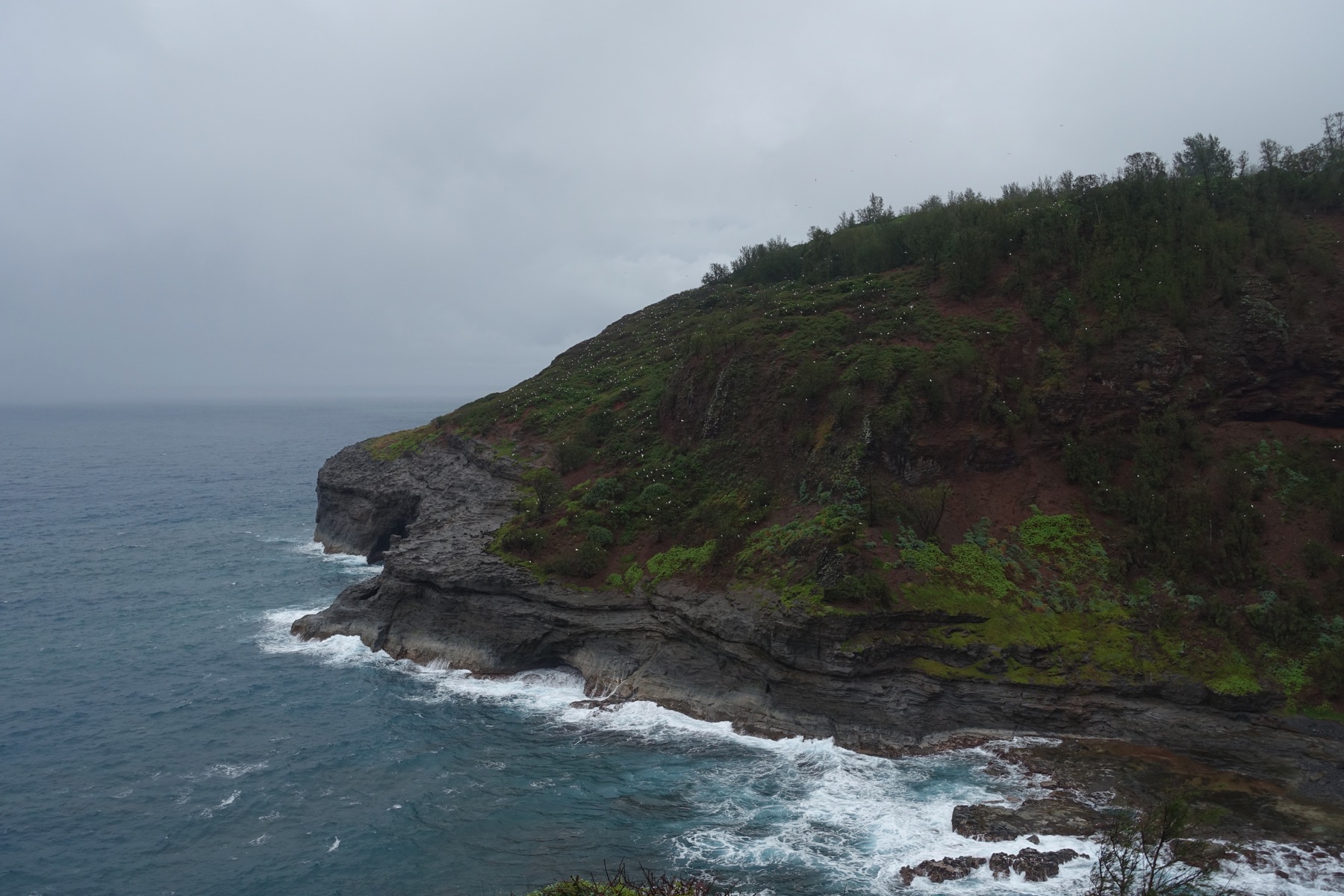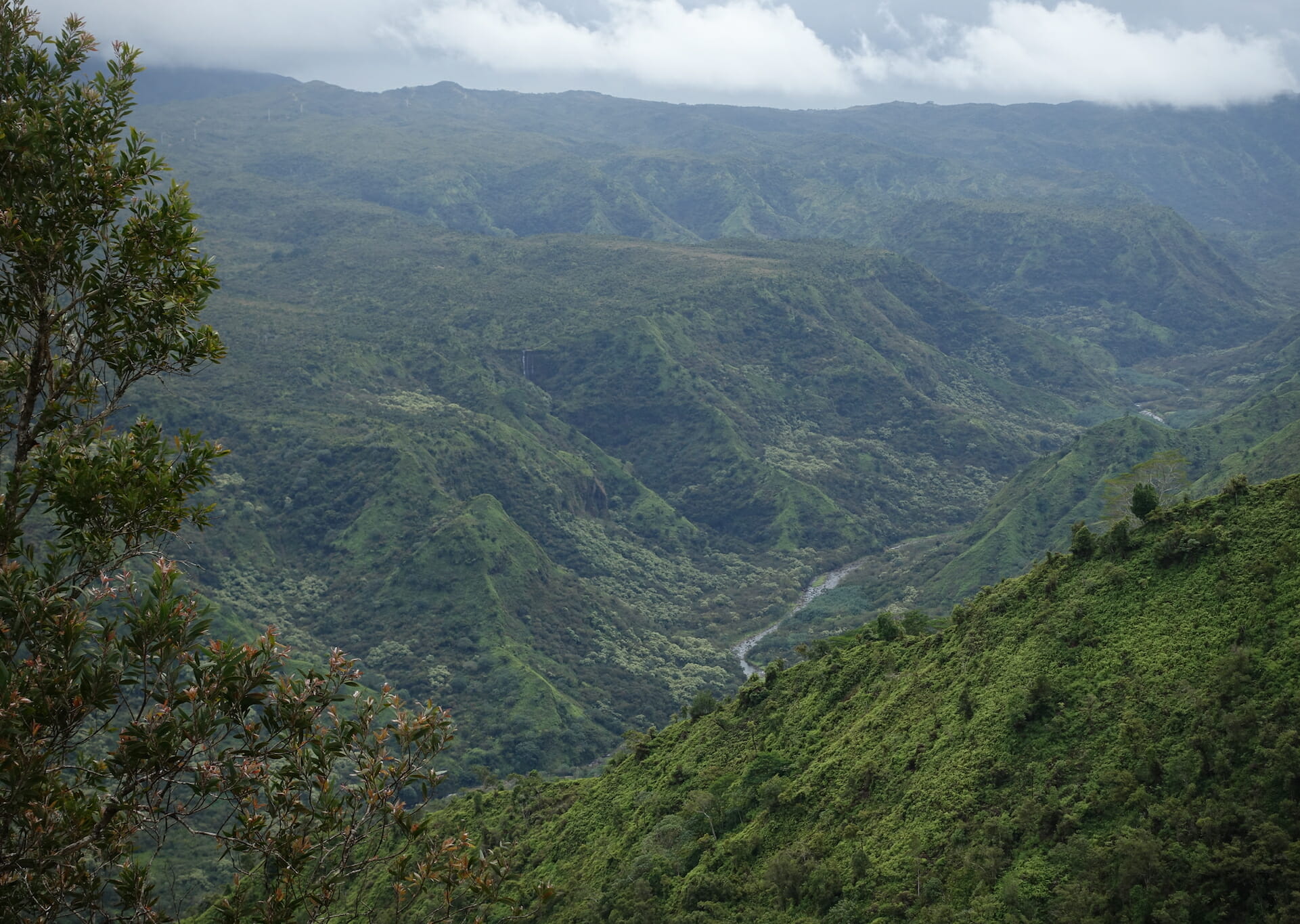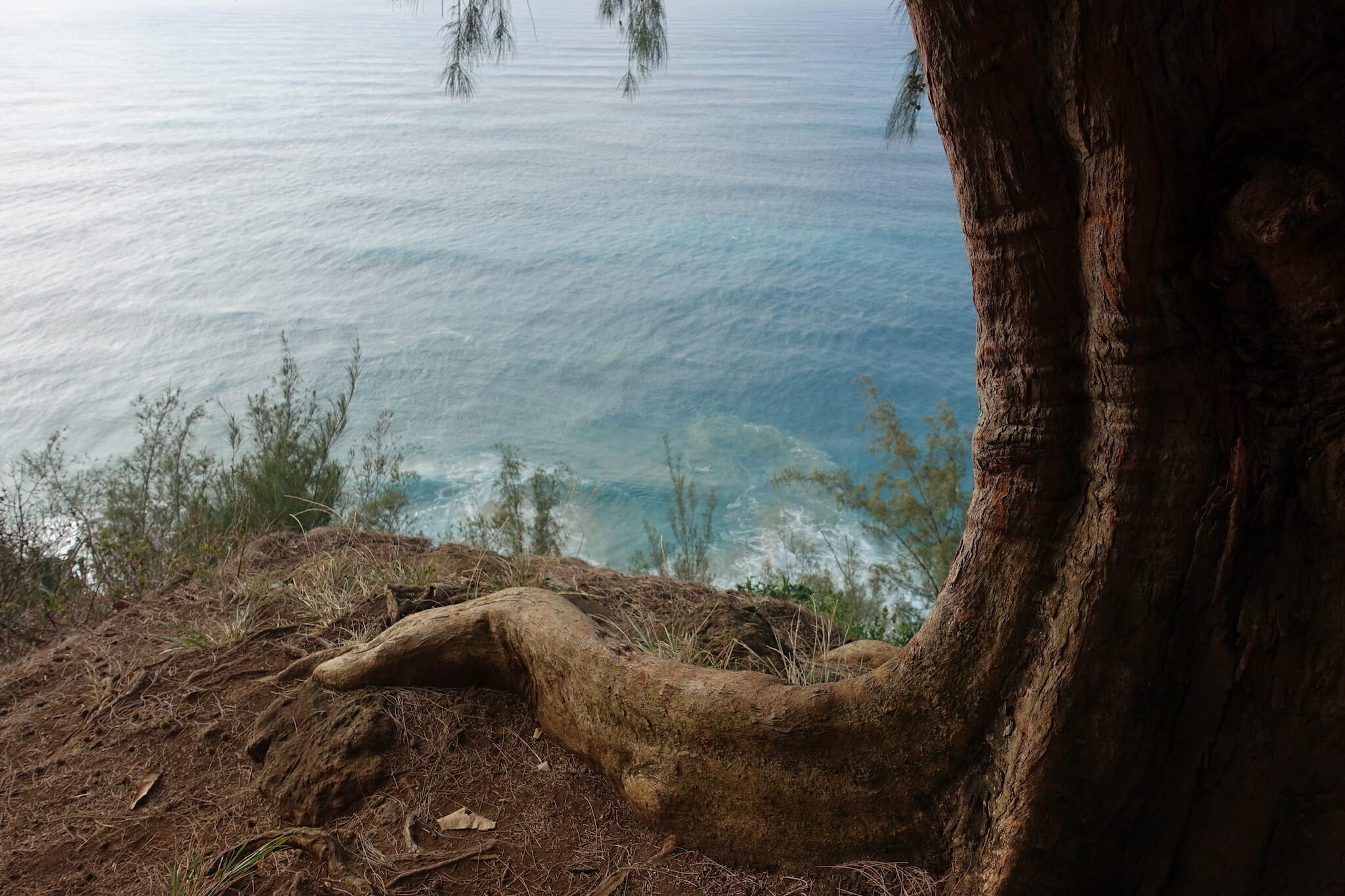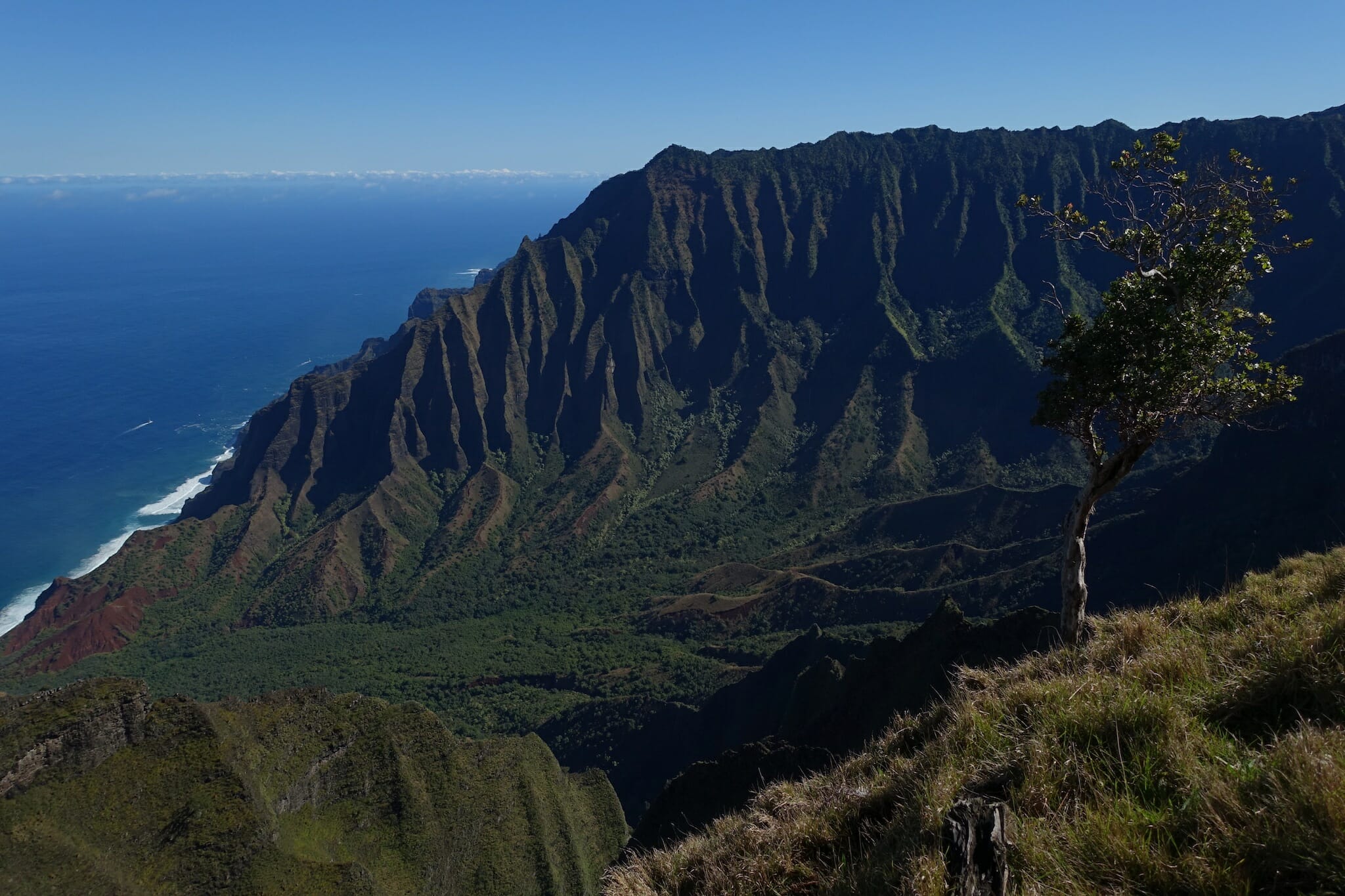The trail descended through the forest, often on slippery mud, before reaching an open crest of the ridge. From here, there are peak-a-boo views of Honopu Valley to the west, and extensive views of the Kalalau Valley to the east.