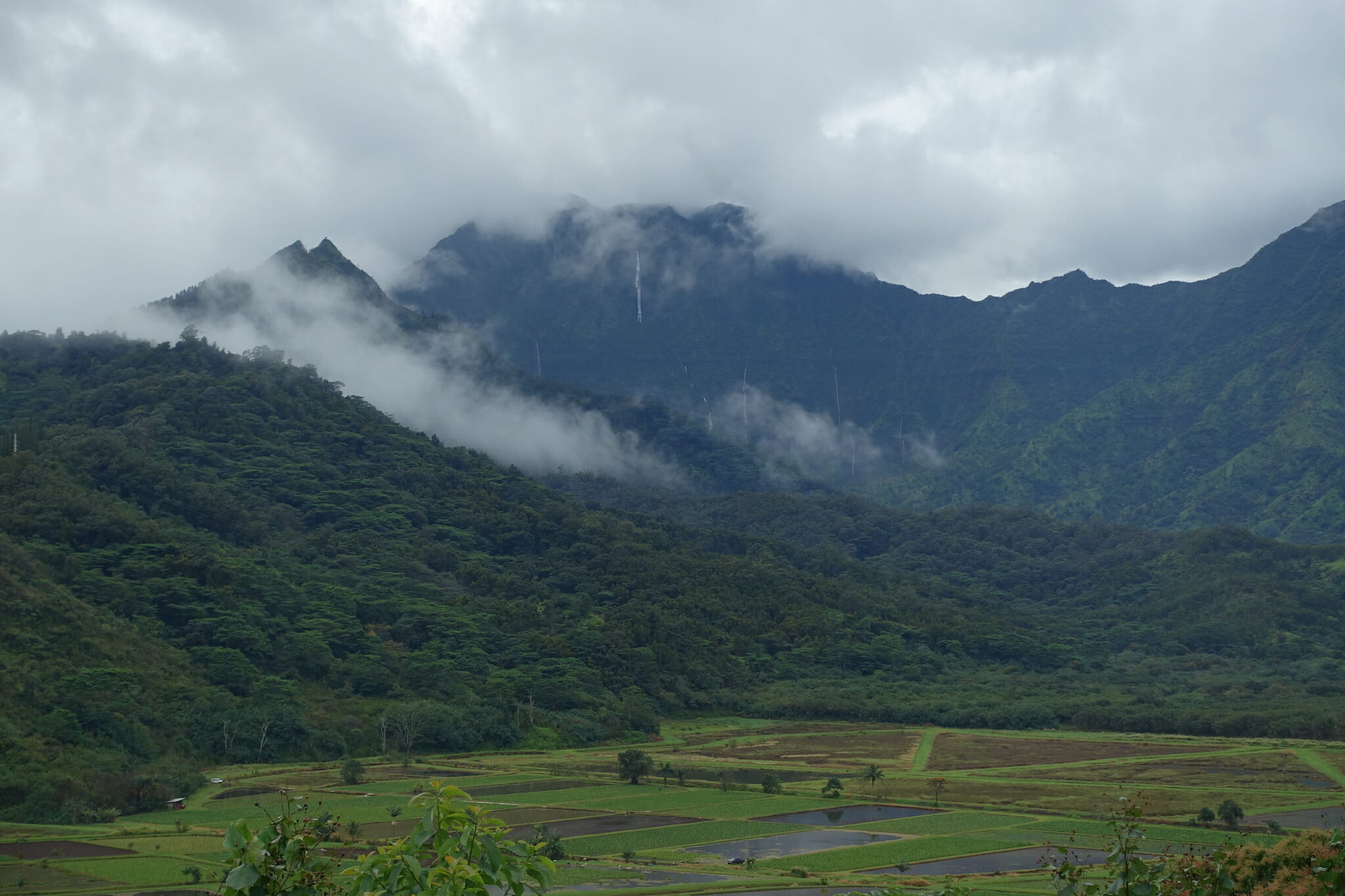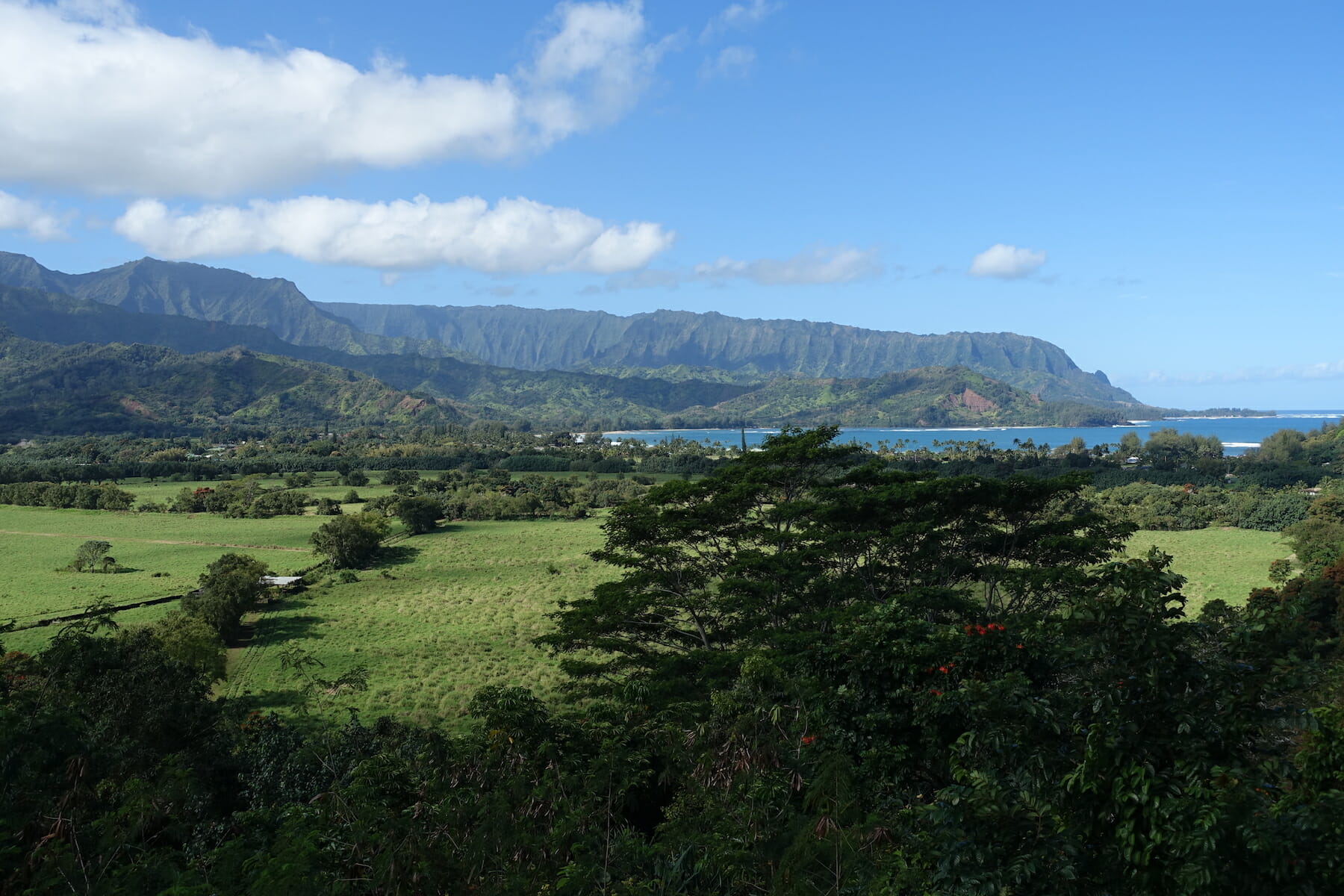 With rain the the forecast, we did not dawdle. We set out for the Okolehao Trail. Located in the Hanalei National Wildlife Refuge, the trail gradually switchbacks up a hill, before reaching views of Hanalei and the Nā Pali Coast. A power line cut offers views part way up.