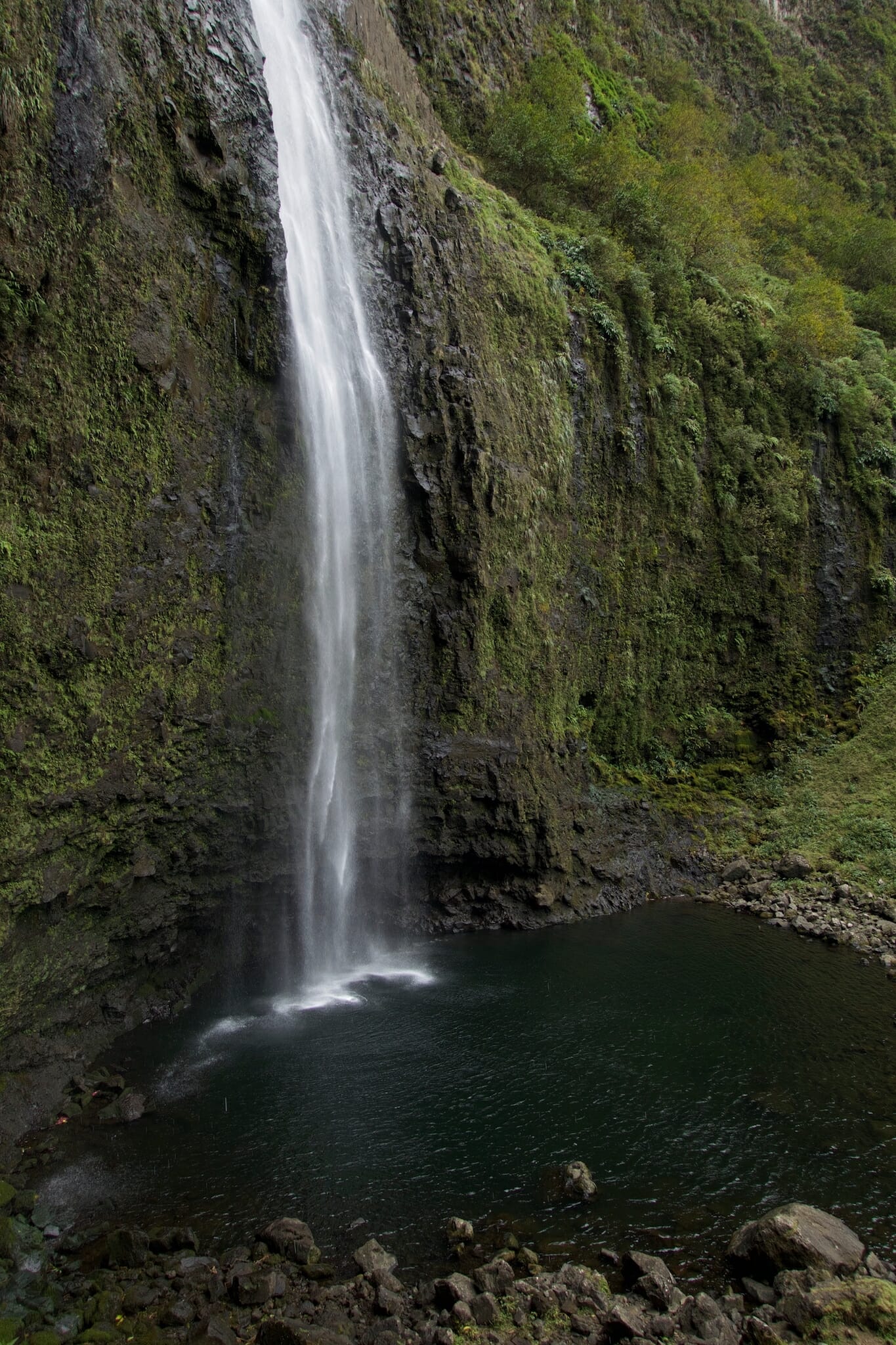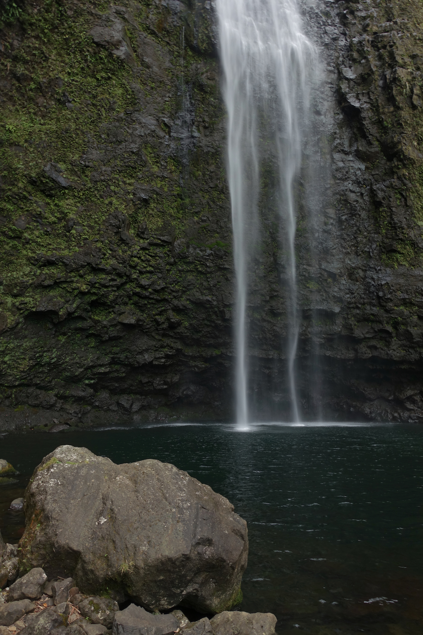 After two miles on the trail, we reached the rocky Hanakapiai Beach. From here, a spur trail leaves the Kalalau trail and follows the stream a mile and a half inland to Hanakapiai Falls. At the first stream crossing, it took us a while to find a dry crossing. Other than that, it was a well-graded, occasionally muddy, walk.