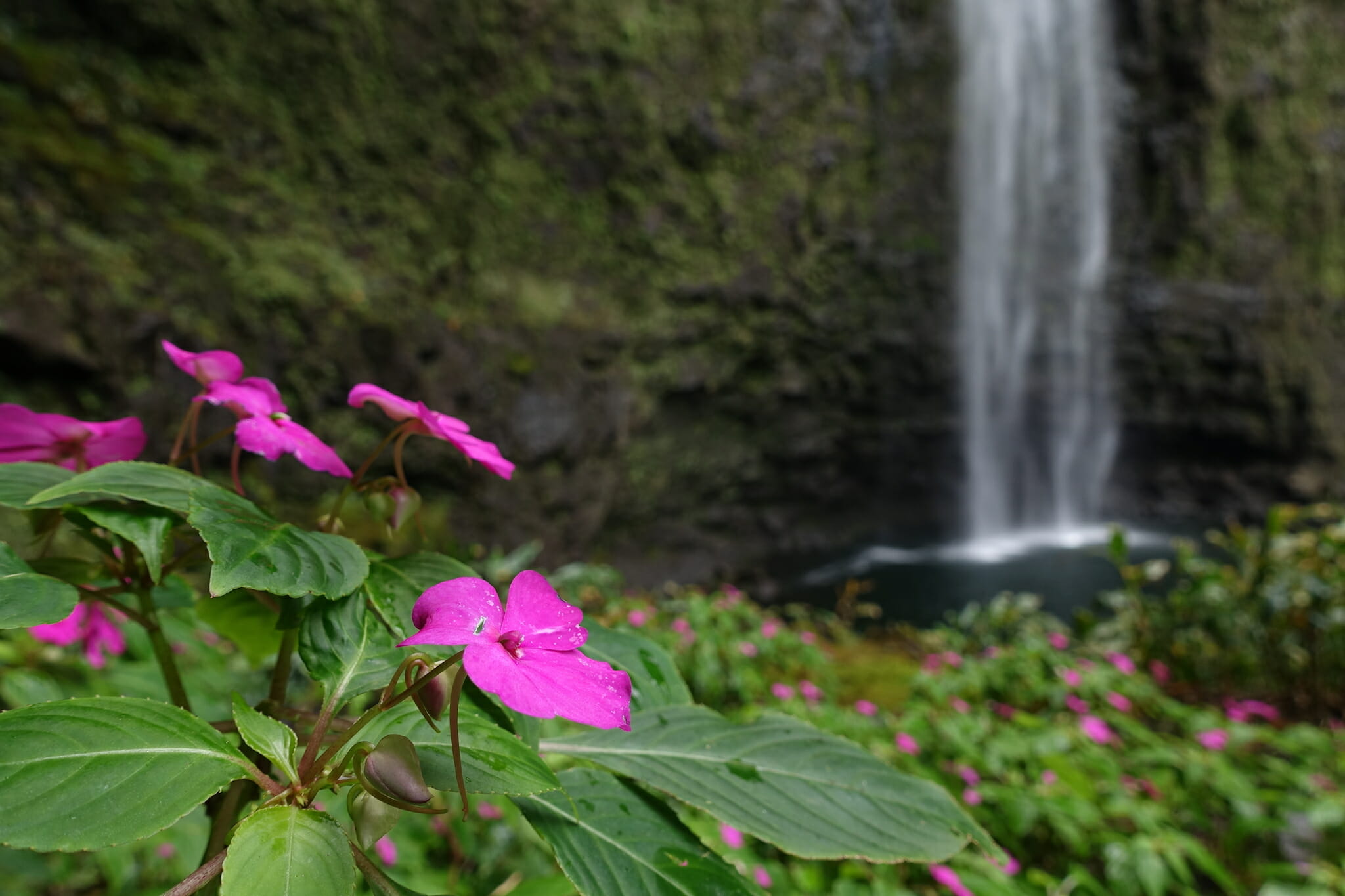 At the falls, we stopped to enjoy our lunches. We also explored above, finding a dense patch of impatients that added splashes of pink to the greens and greys of the falls.