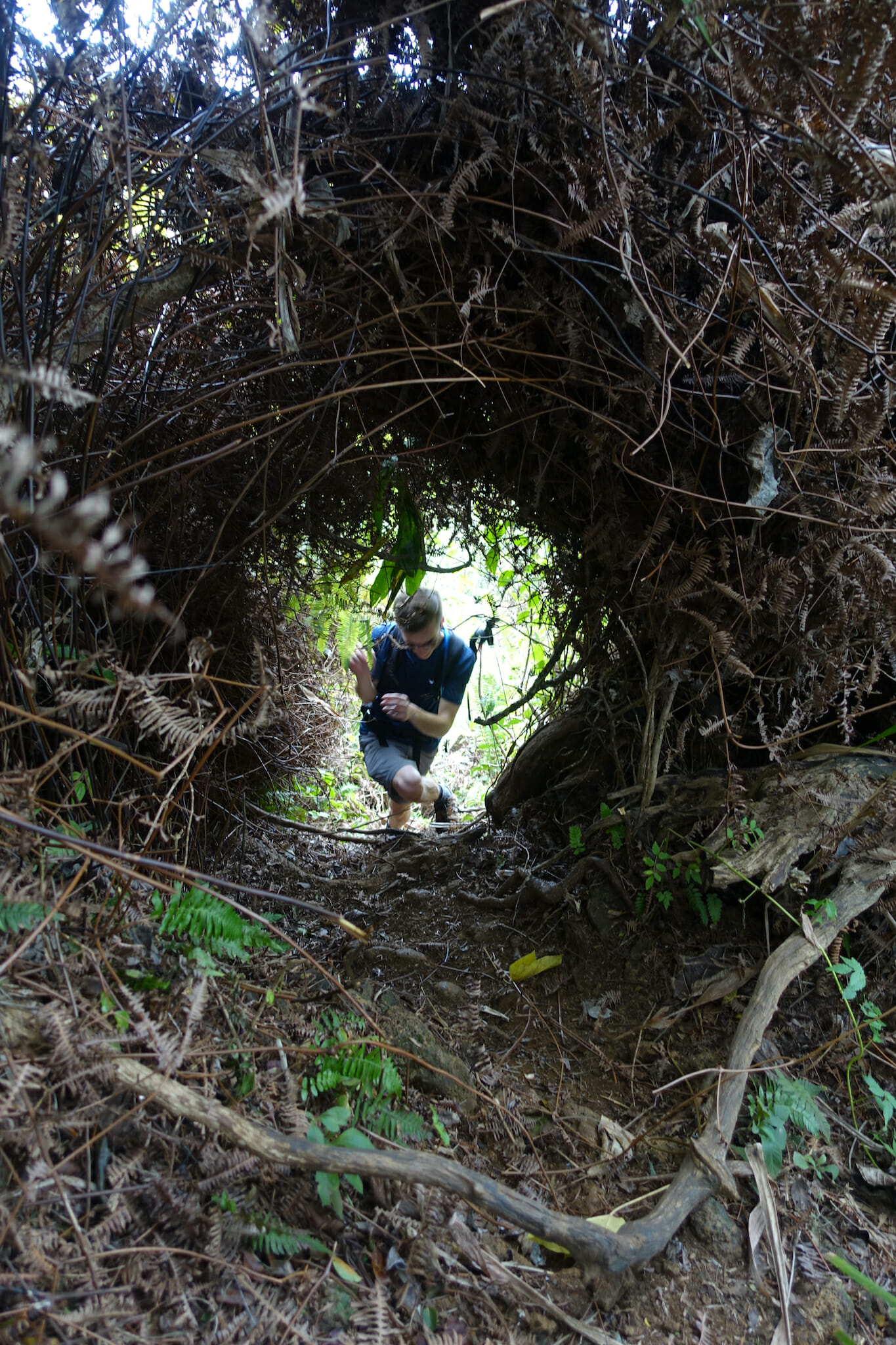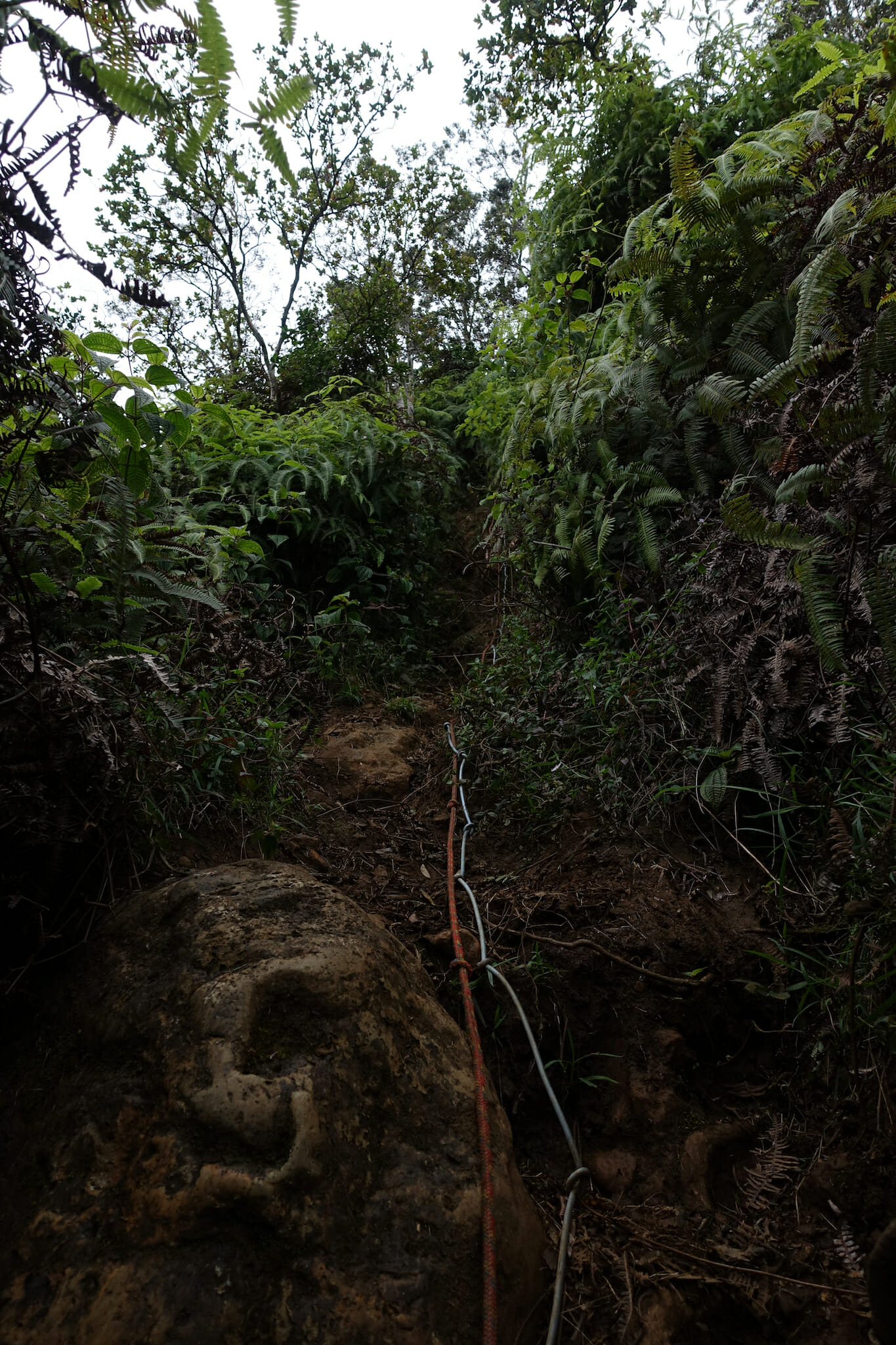 After 2/3 of a mile, the easy section ends. From here, the trail grows muddier, narrower, and steeper as it undulates along Hihimanu Ridge. In several places, ropes have been placed to offer assistance. At one point, we passed through a tunnel cut in the thick brush.