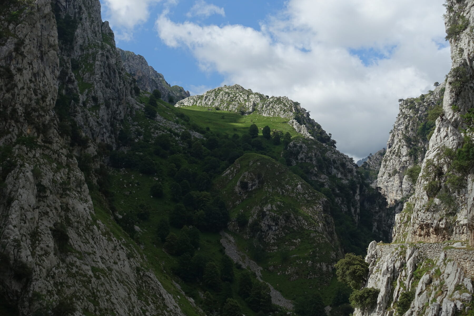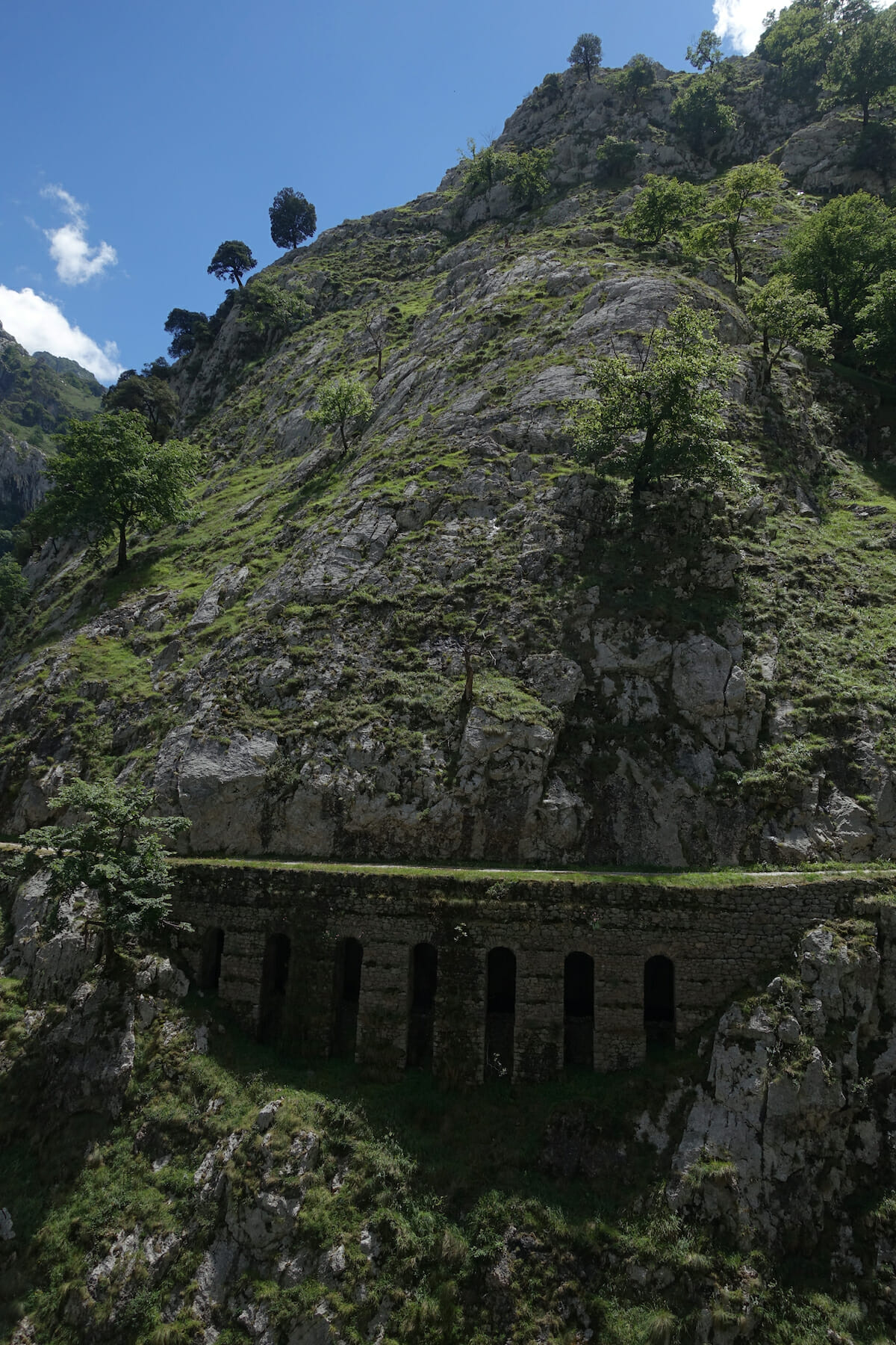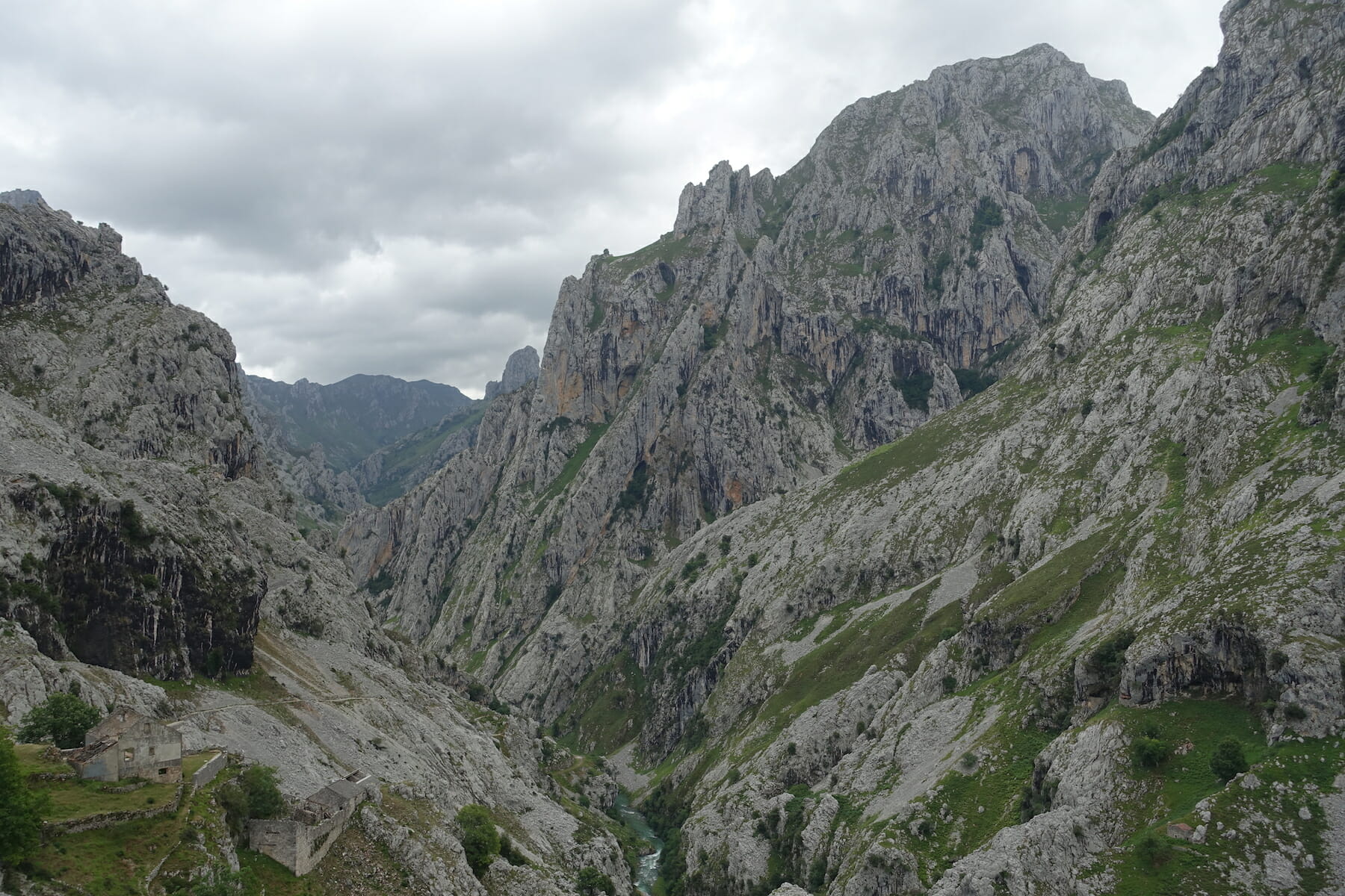 The sky was cloudy and the morning cool when we started. Limestone walls of the central and western massif loomed above us, the Cares River far below. The trail was constructed between 1916 and 1921 to support the hydroelectric plant in Camarmeña – Poncebos, with later improvements between 1945 and 1950. All of this engineering pays off. From Poncebos, the trail climbs steadily to some ruins and then descends, before settling into a nearly level grade.