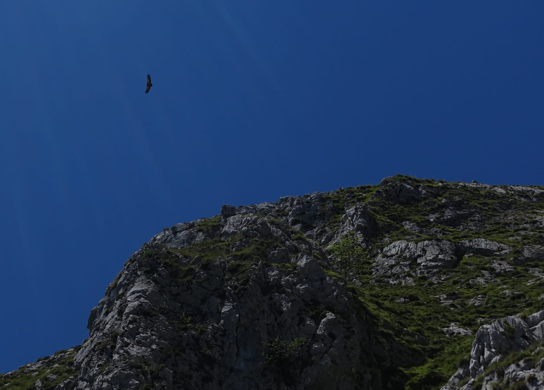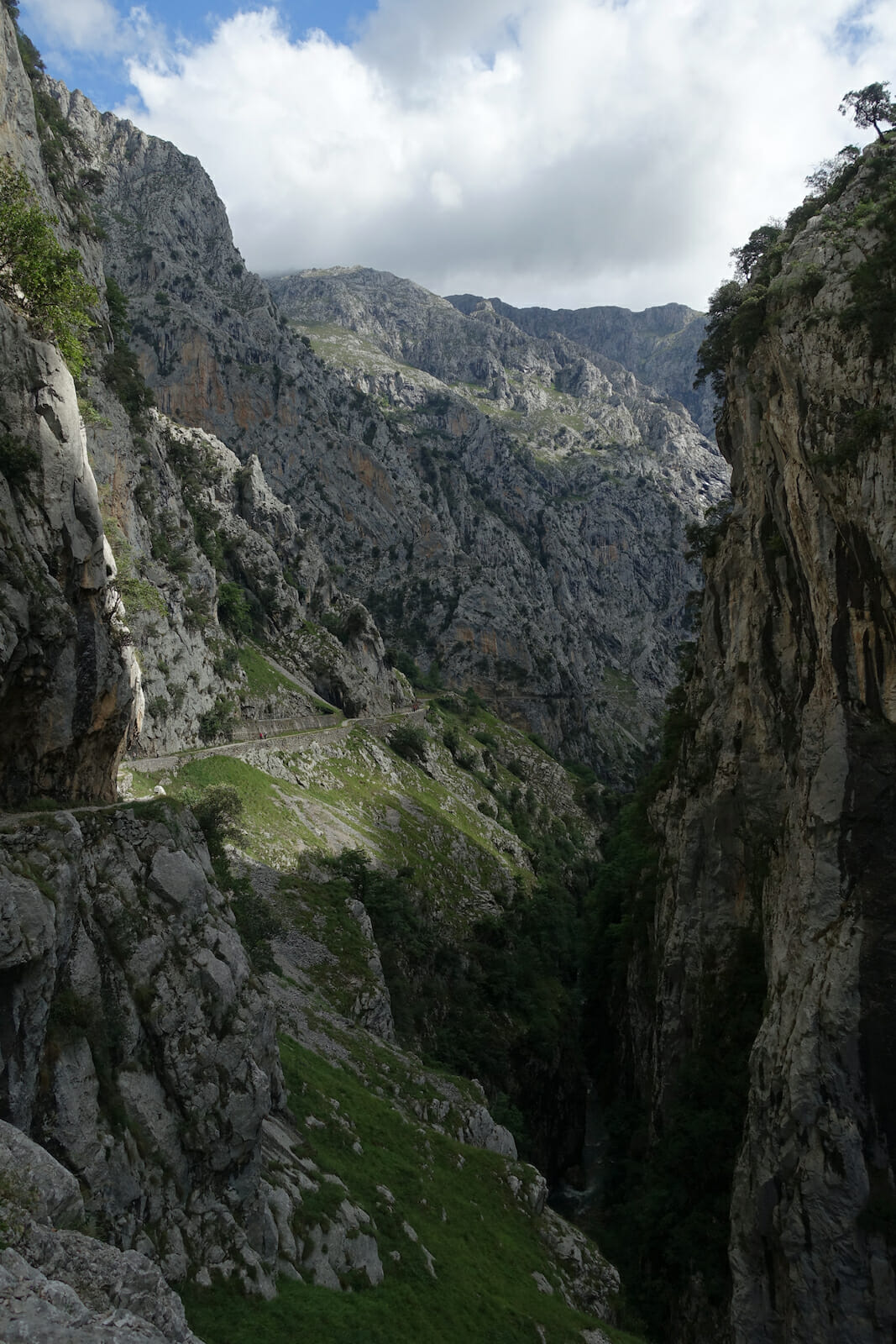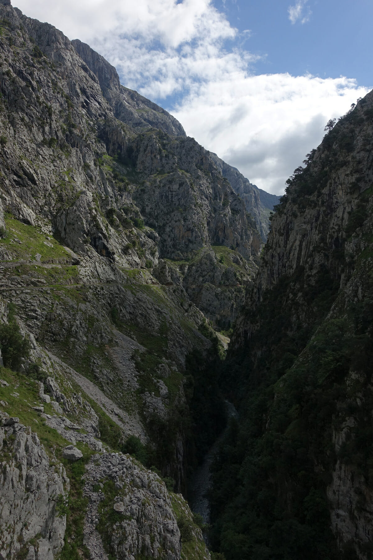The sky was cloudy and the morning cool when we started. Limestone walls of the central and western massif loomed above us, the Cares River far below. The trail was constructed between 1916 and 1921 to support the hydroelectric plant in Camarmeña – Poncebos, with later improvements between 1945 and 1950. All of this engineering pays off. From Poncebos, the trail climbs steadily to some ruins and then descends, before settling into a nearly level grade.