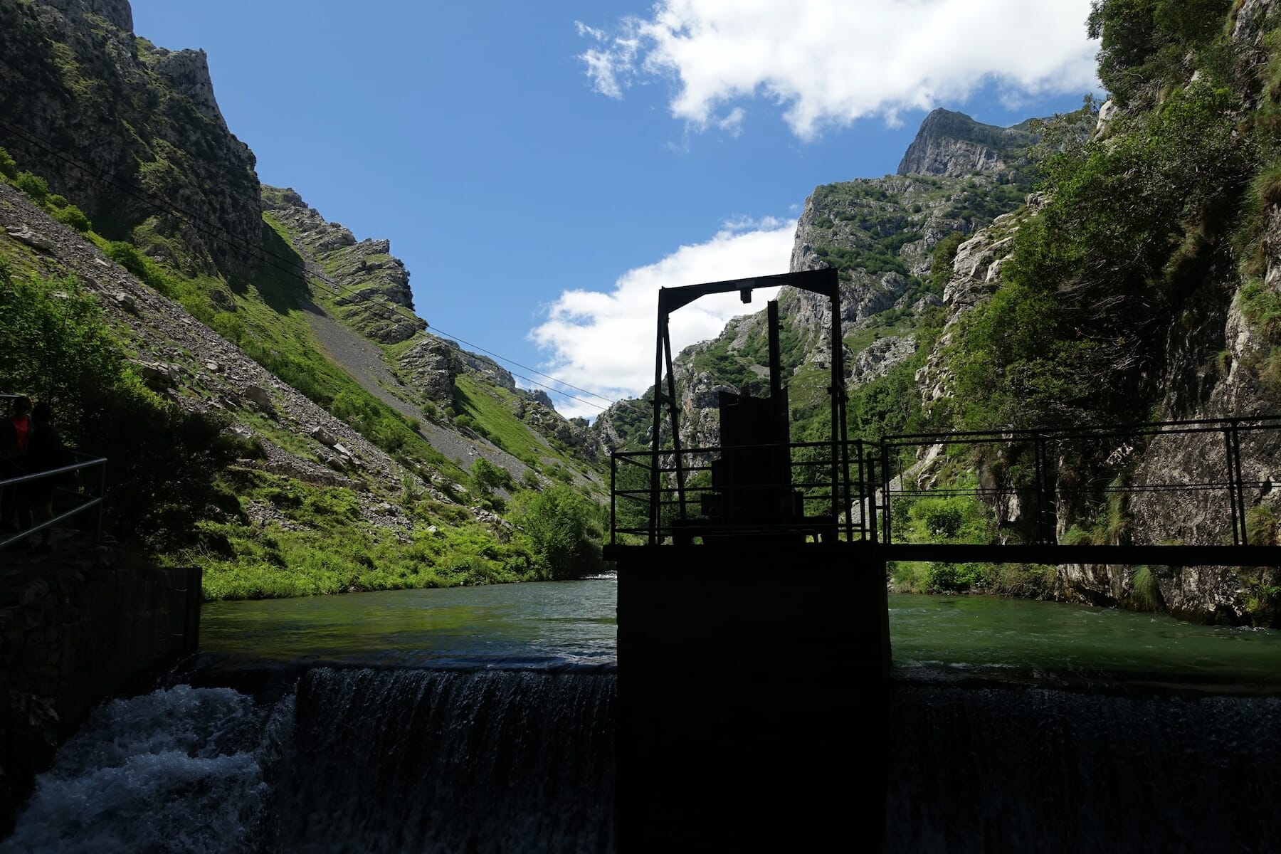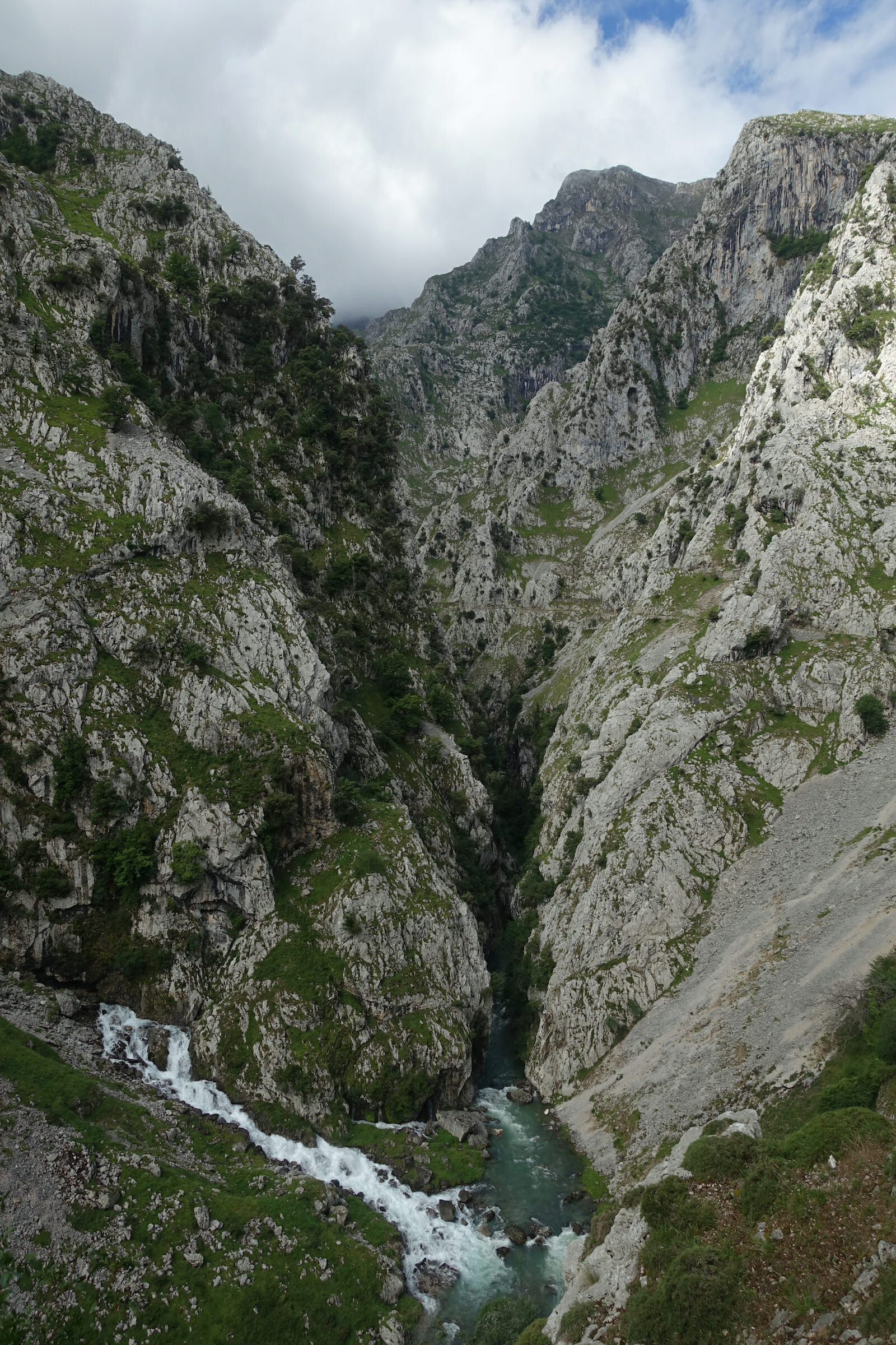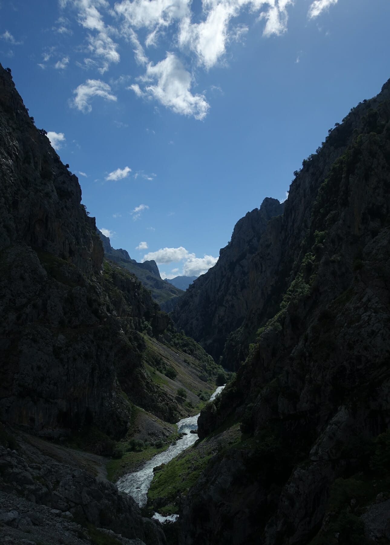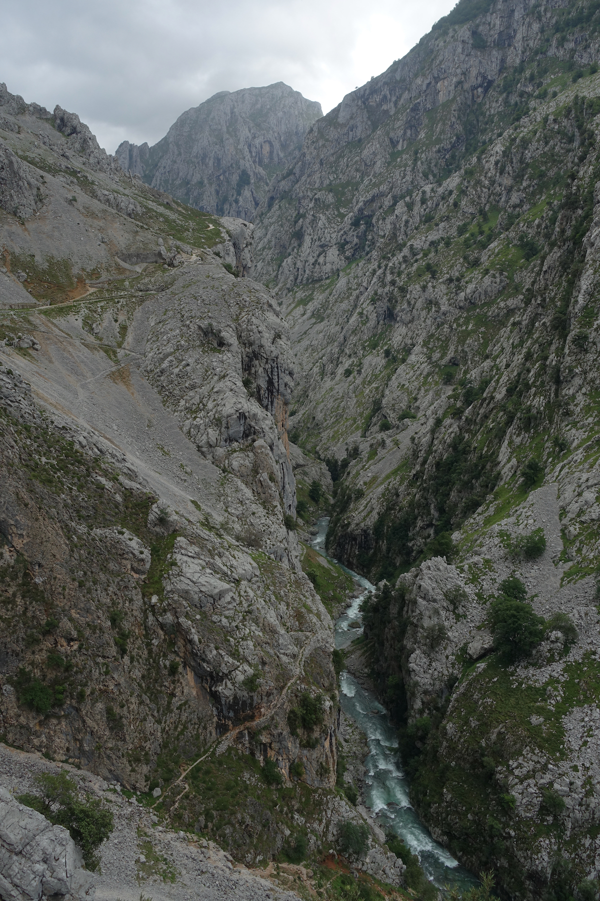 From here, rather than returning to Bulnes and the funicular, we turned to descend the trail following Canal del Texu. With its steep sides, dusk had already arrived in the base of this gorge. We stopped at places to enjoy the blue waters of the stream, and again when crossing the Cares River at the bottom.
