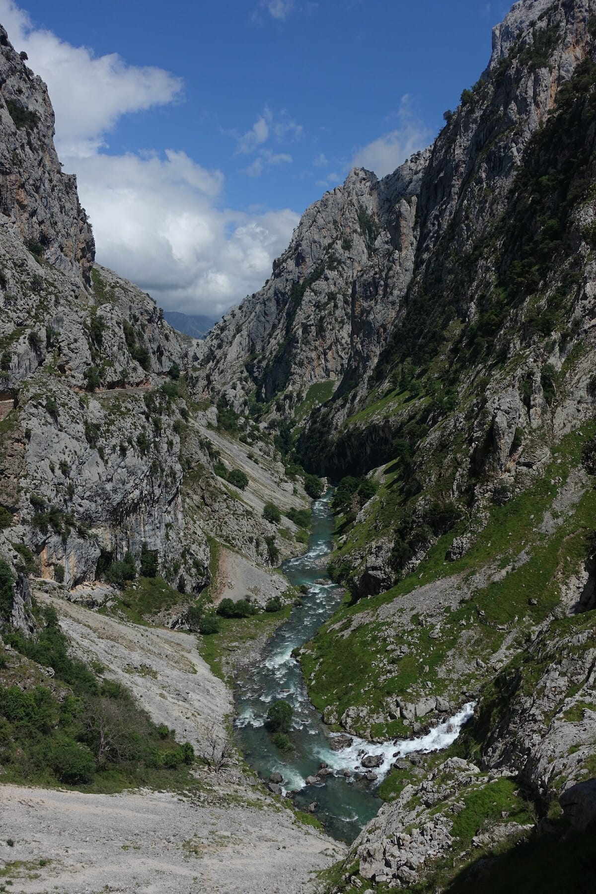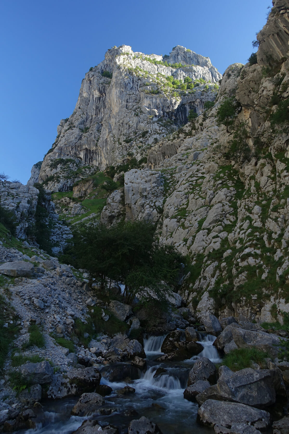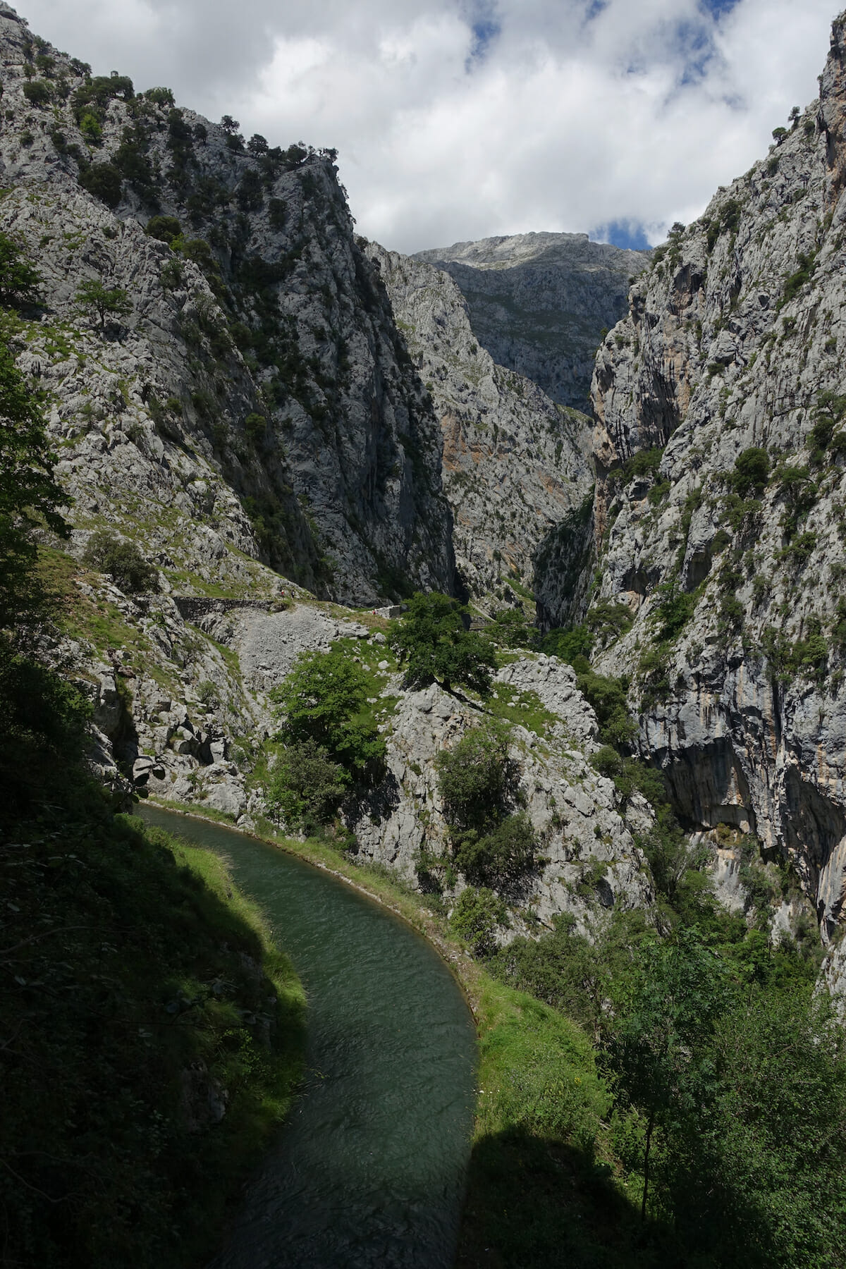 From here, rather than returning to Bulnes and the funicular, we turned to descend the trail following Canal del Texu. With its steep sides, dusk had already arrived in the base of this gorge. We stopped at places to enjoy the blue waters of the stream, and again when crossing the Cares River at the bottom.