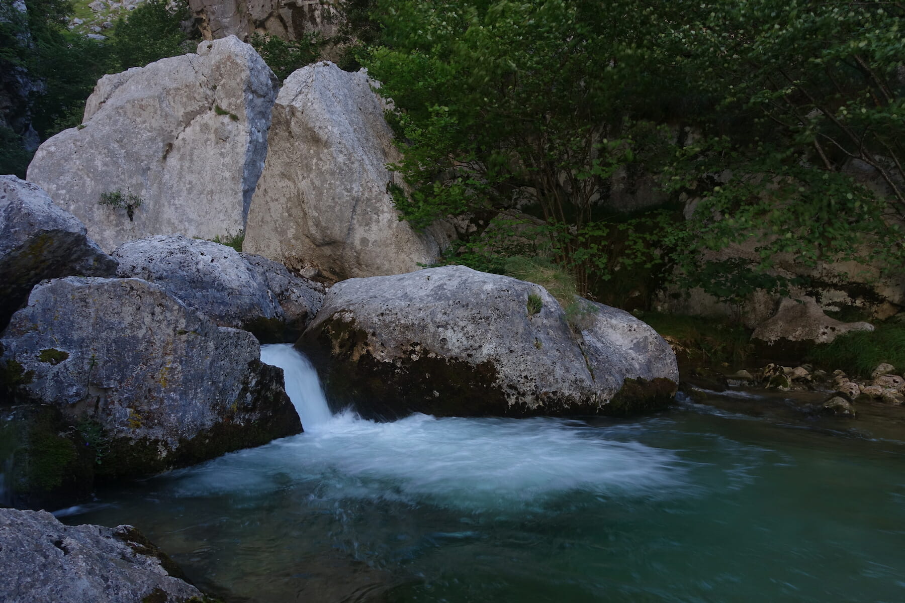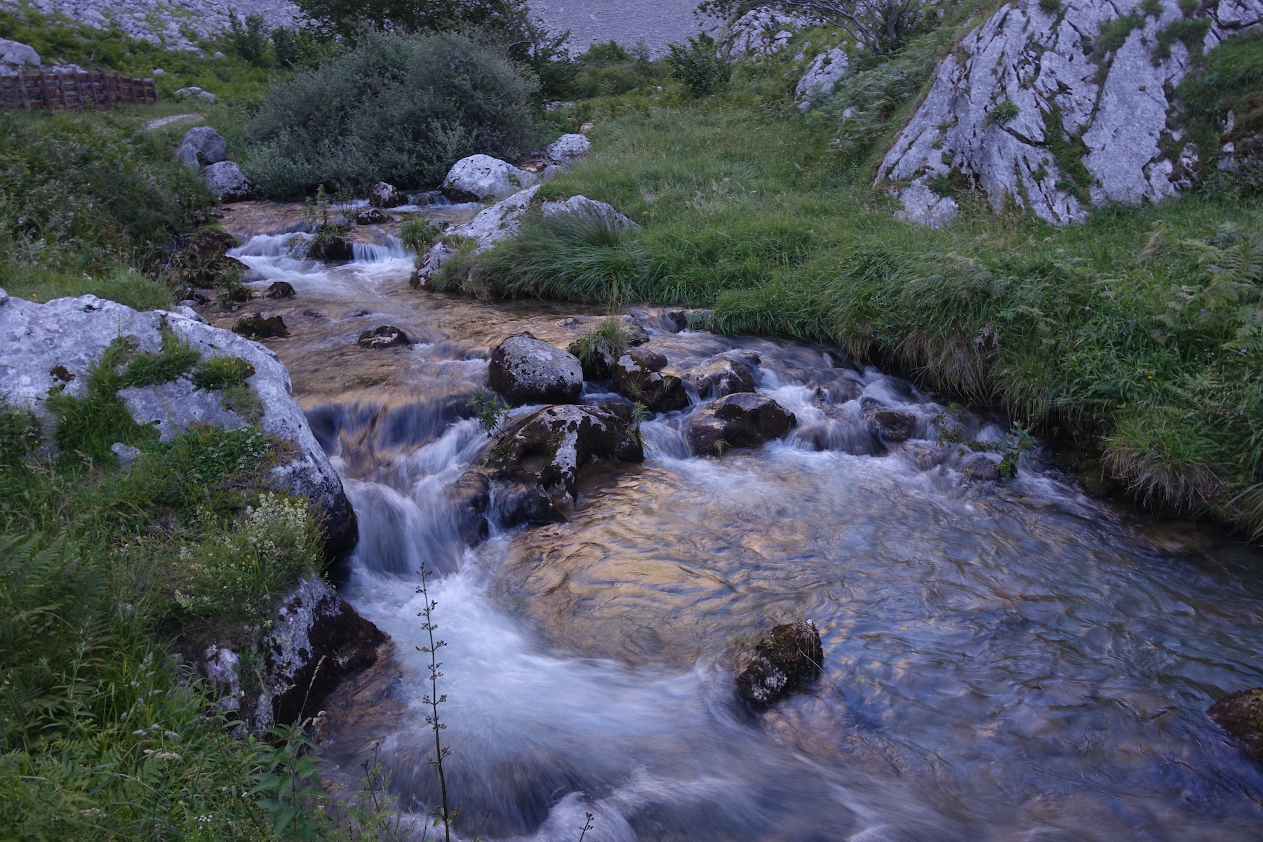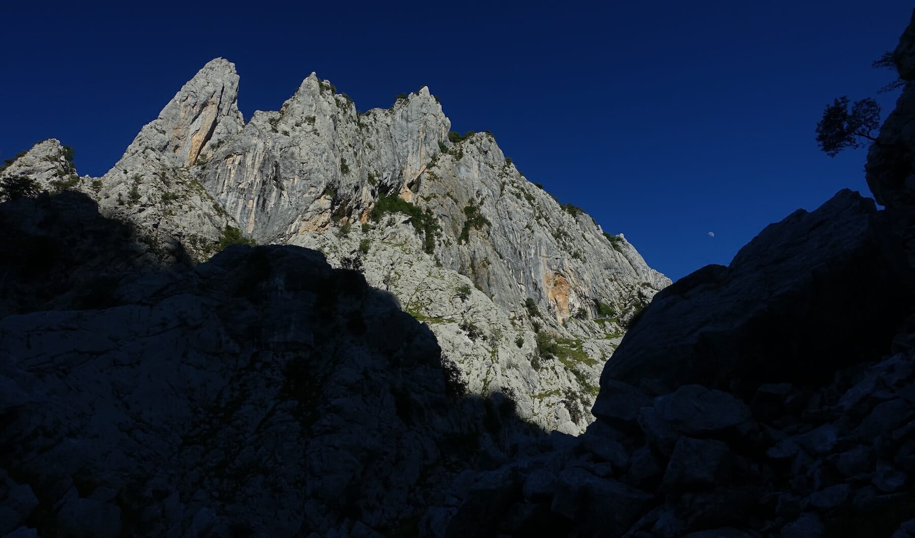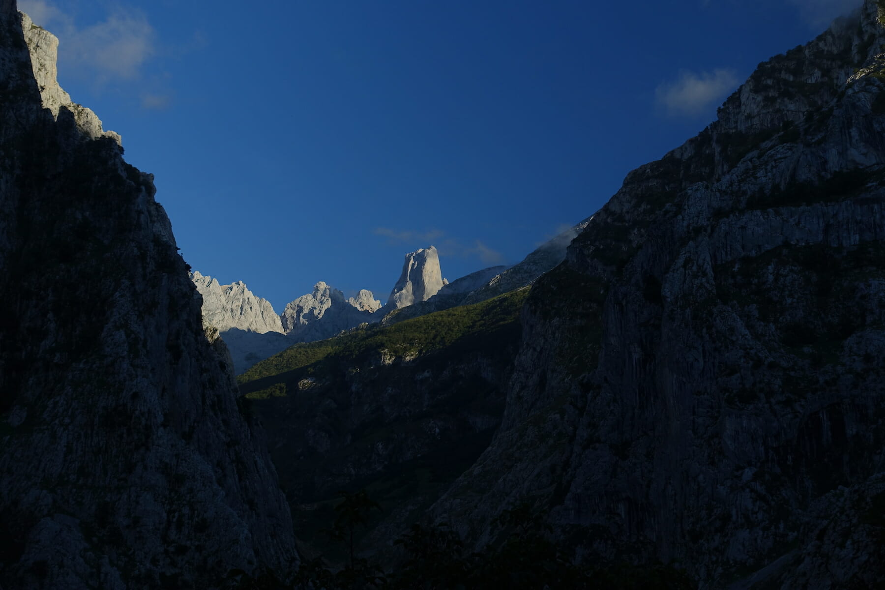 From here, rather than returning to Bulnes and the funicular, we turned to descend the trail following Canal del Texu. With its steep sides, dusk had already arrived in the base of this gorge. We stopped at places to enjoy the blue waters of the stream, and again when crossing the Cares River at the bottom.