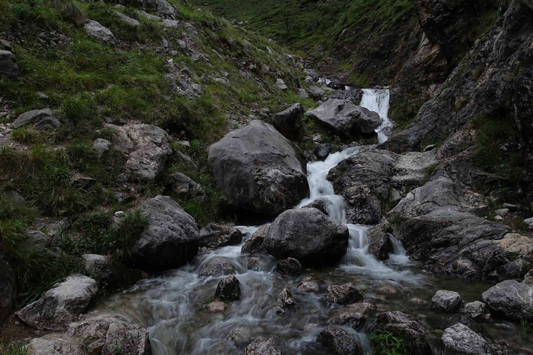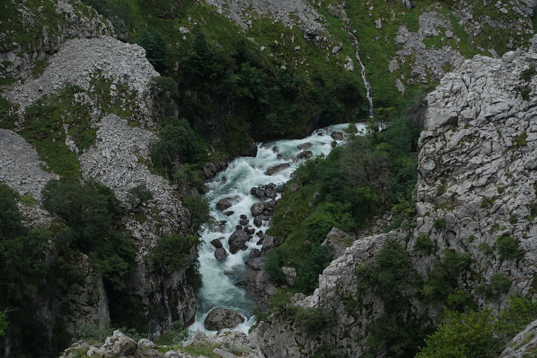 After maybe an hour, the clouds started to break and we got some sun. Cascades flowed under the trail from streams. We passed high above a place where a torrent of water emptied from the cliff into the Cares River.