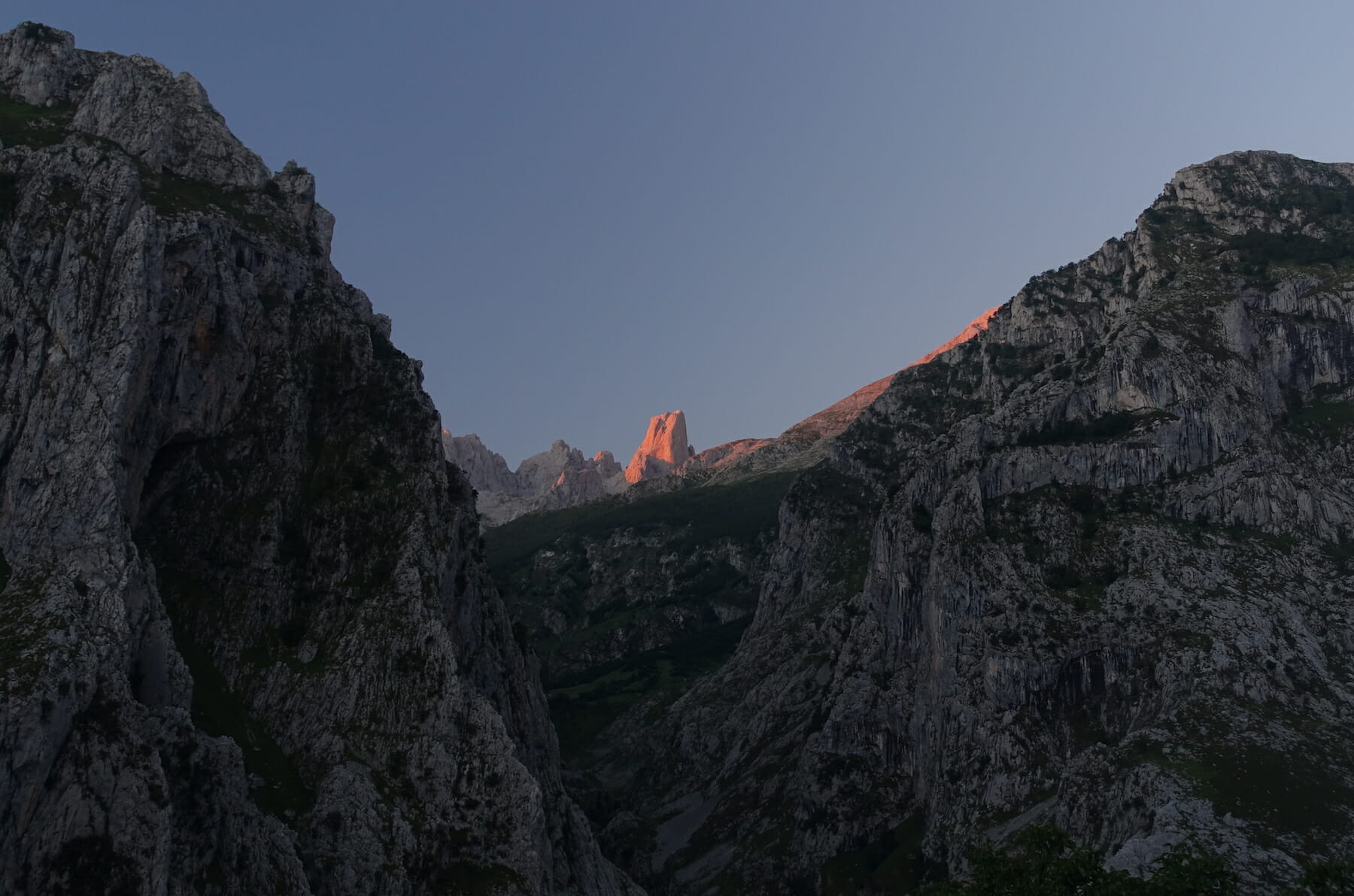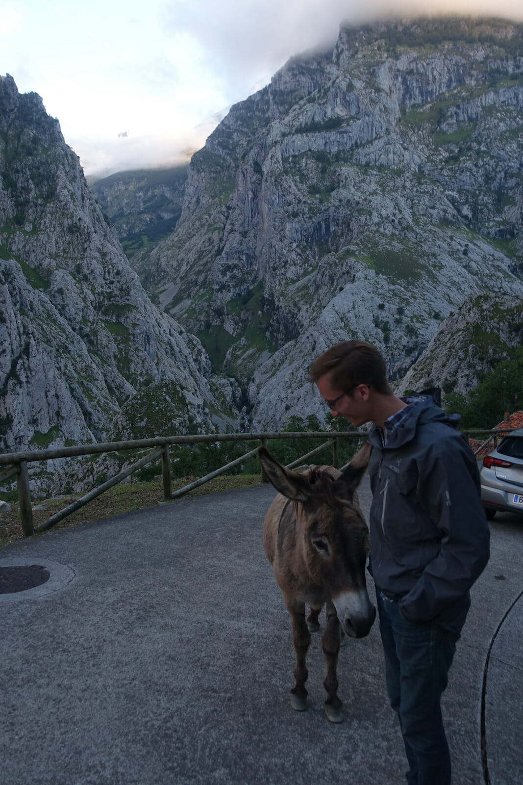 We cleaned up, relaxed for a bit, and then went to the restaurant in Camarmeña for dinner. At the restaurant, we were the only ones dining in, and we enjoyed a leisurely, simple dinner. For a backdrop, the sunset made Naranjo de Bulnes glow almost gold. We also got to meet a burro that seems to wander the town of its own accord.