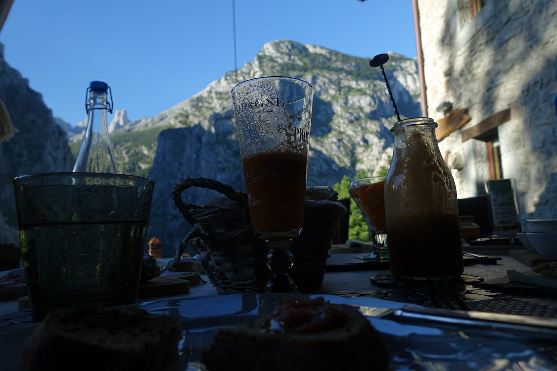 We awoke to gorgeous sunrise views of Naranjo de Bulnes from our room, and then headed downstairs for an early breakfast. Jhousy & Alberto served a lavish spread of cheese, fruit, meats, breads, and a smoothie. We ate slowly while enjoying the views from the patio. As we talked about which of the various items were our favorites, Jhousy would reappear with additional small items, saying that if we liked them, we must try these.