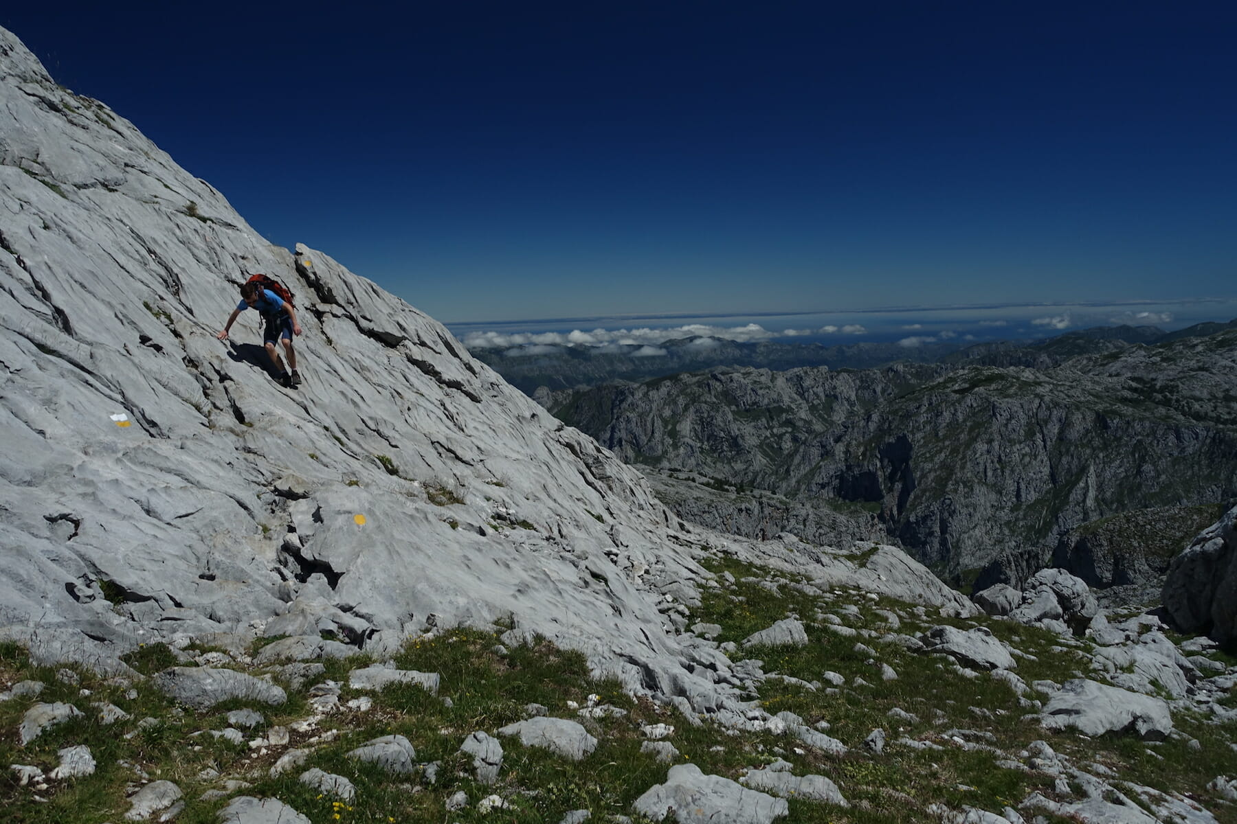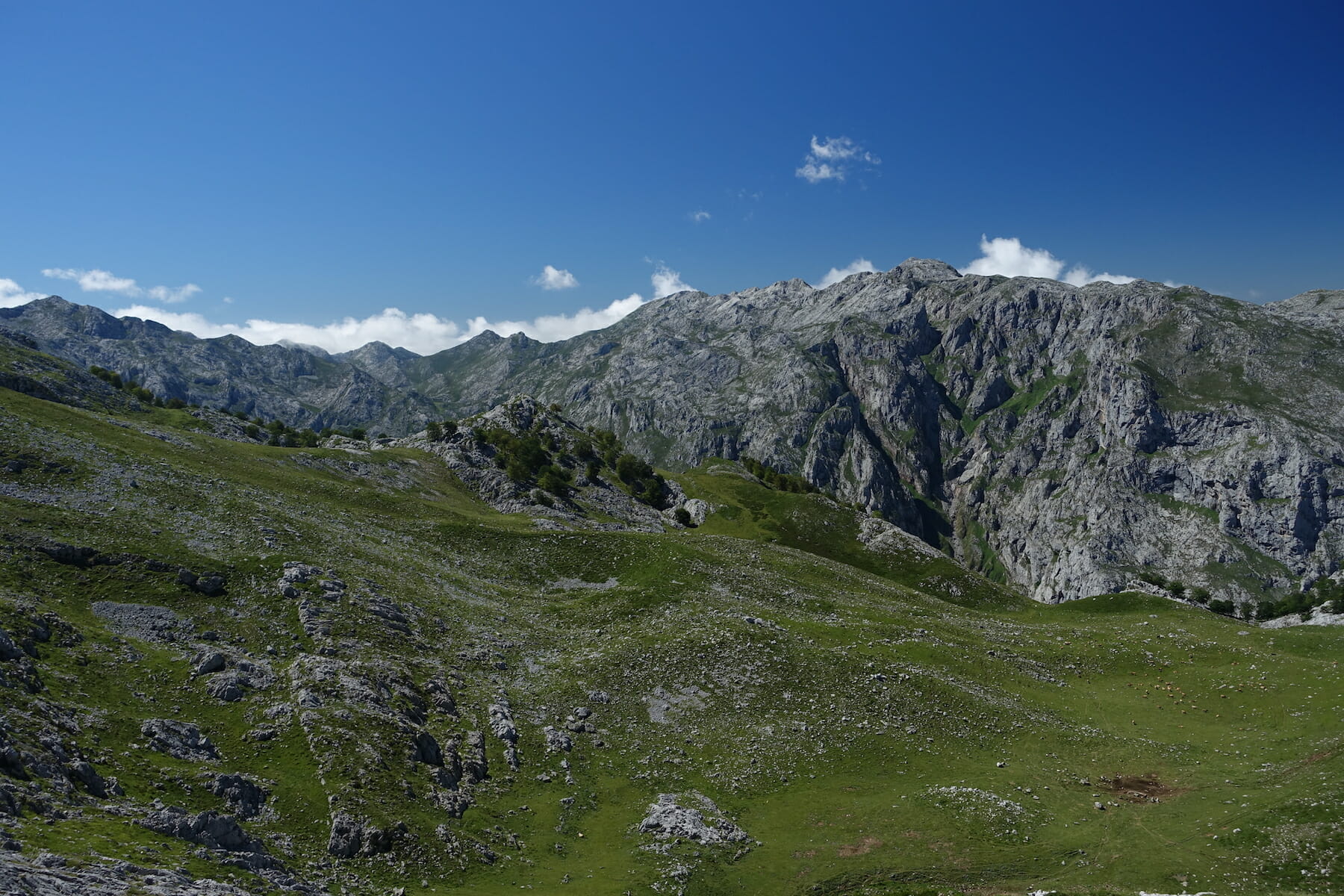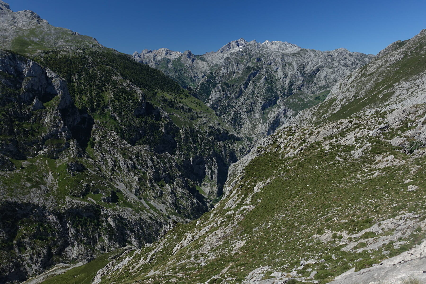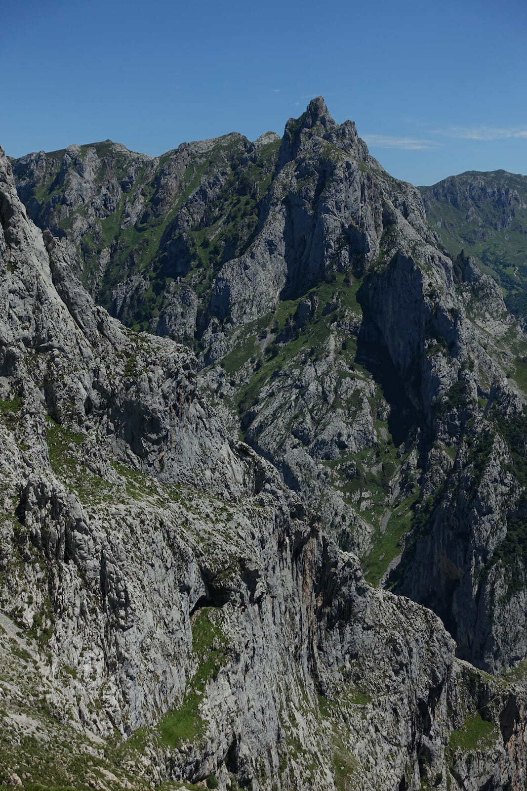 For a while, the trail followed the edge of the pasture, above steep drop offs. This offered steadily improving views with each bit of elevation we gained. Eventually, we had to descend off the pasture on a rockier route. From here, the trail skirted the base of Cuetos del Trabe (marked on other maps as Cuetos del Trave).