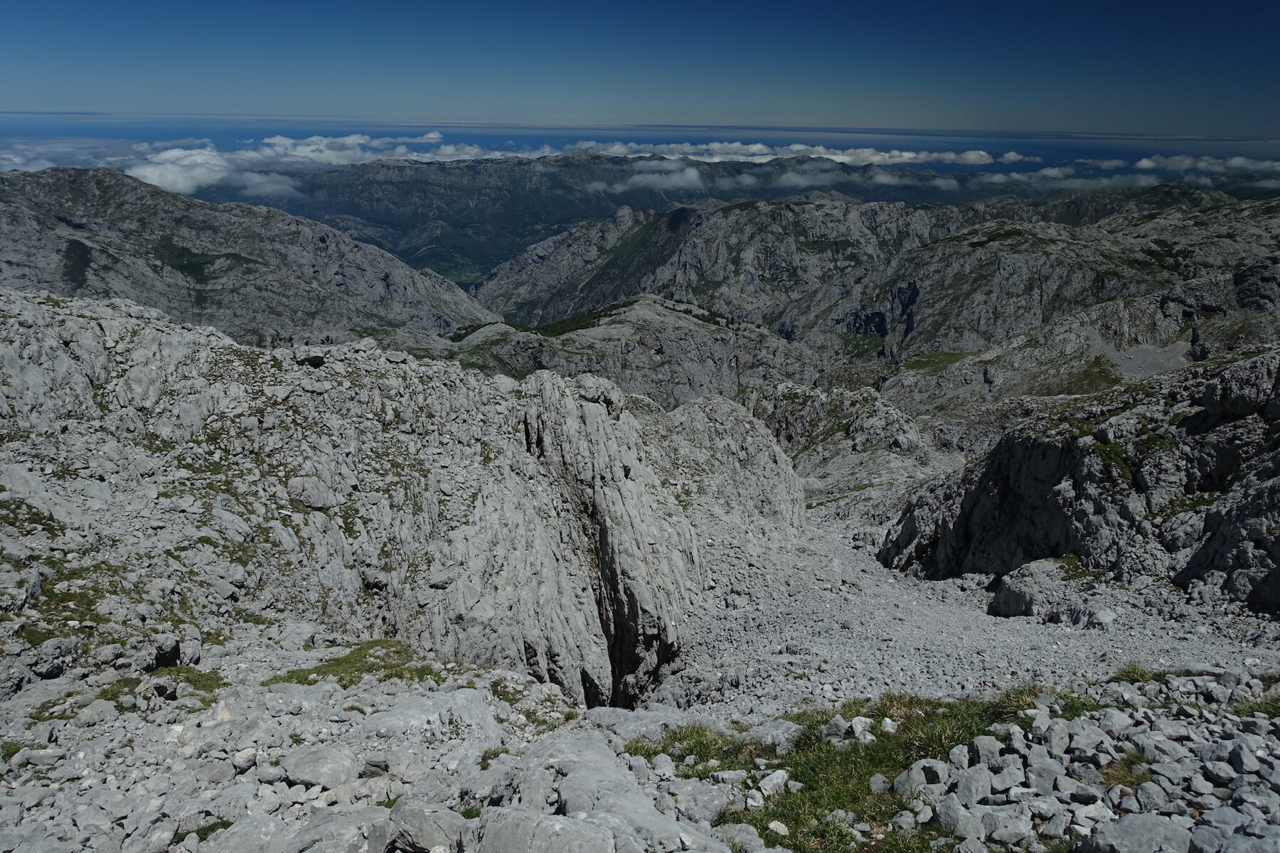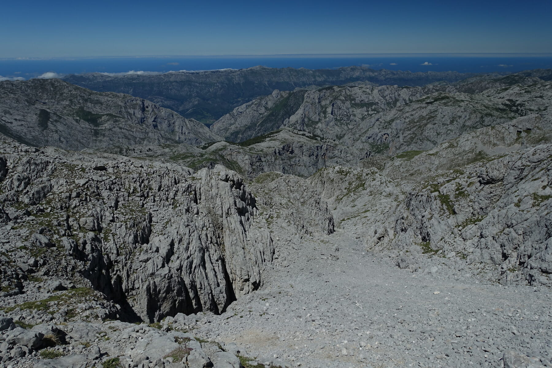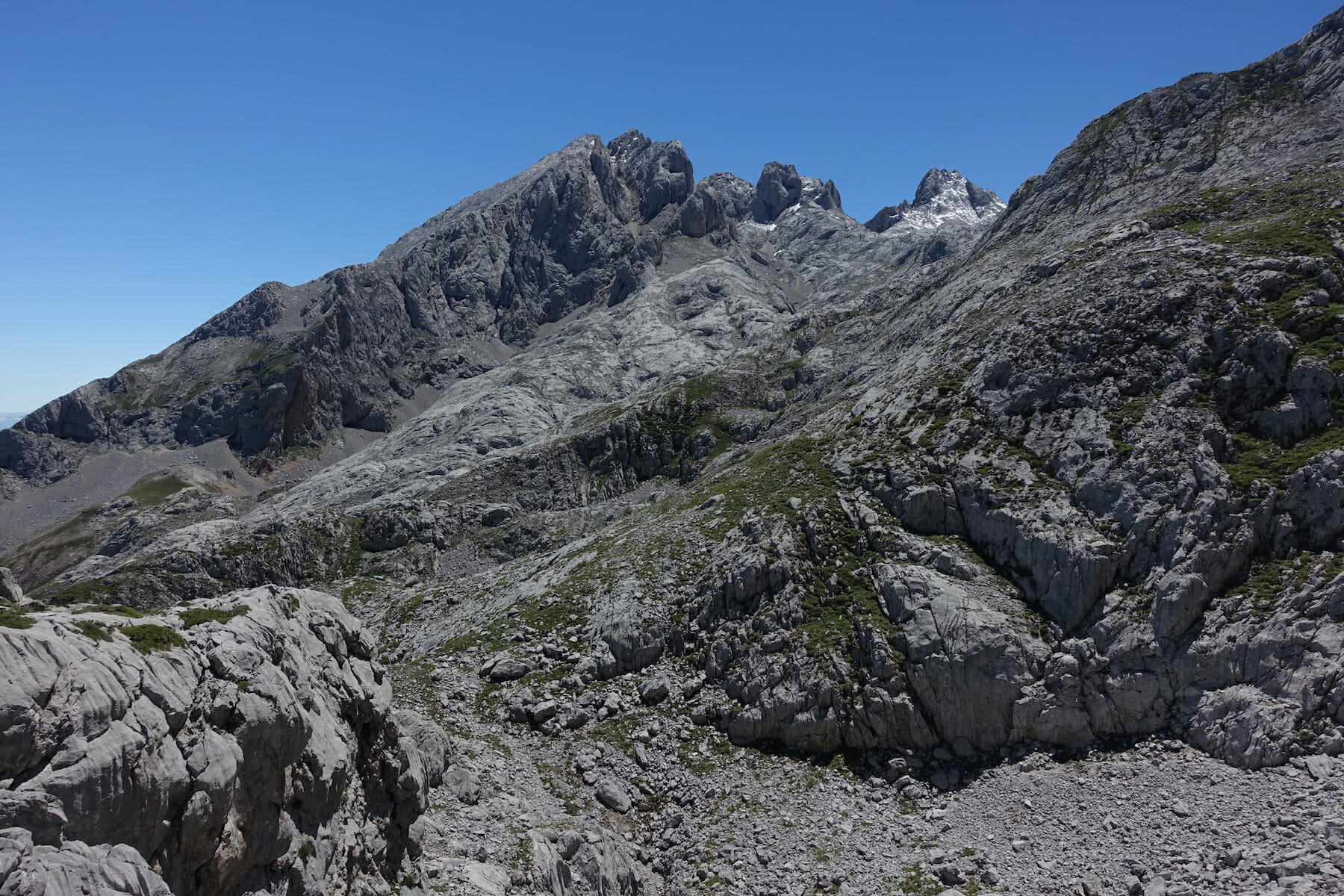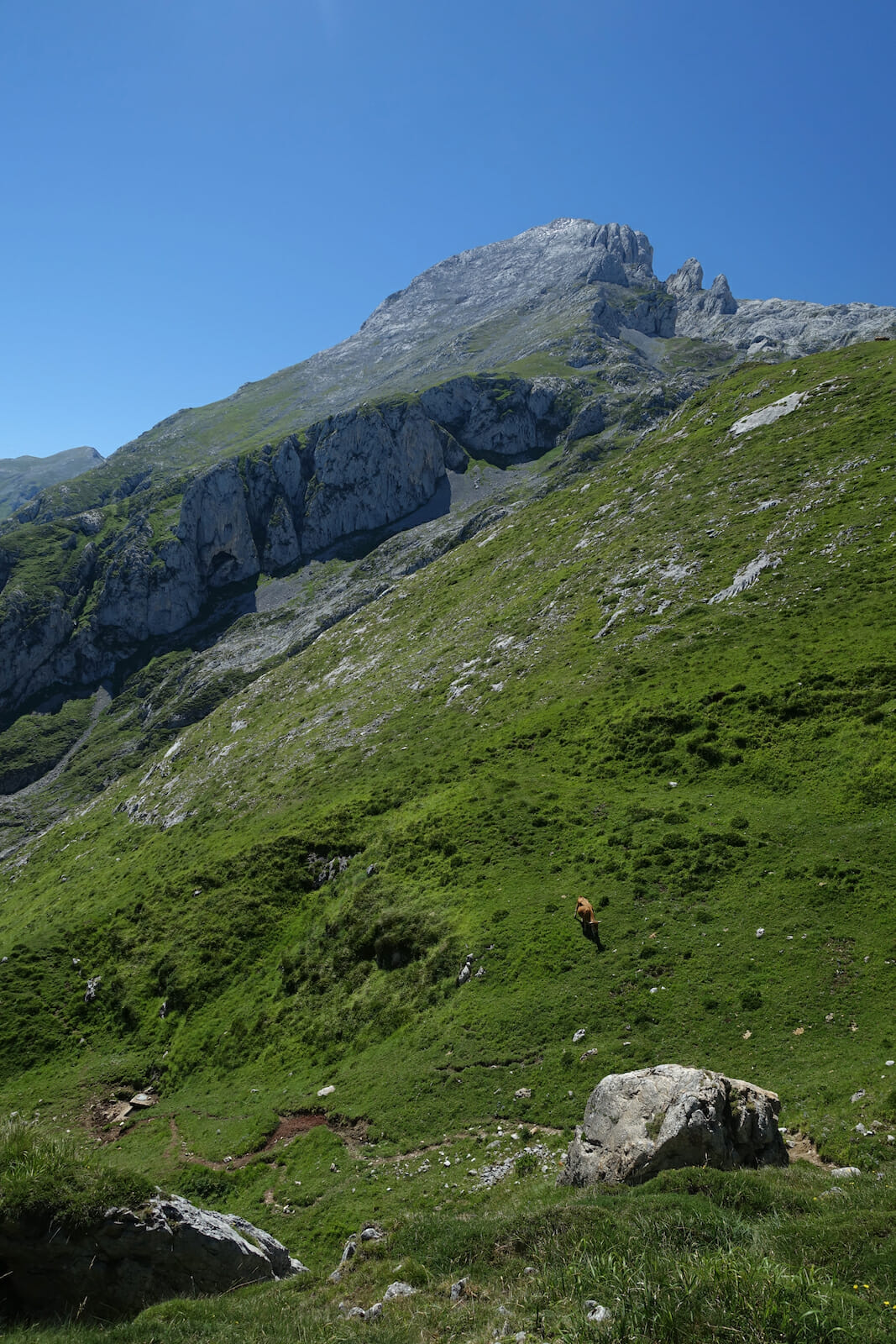 For a while, the trail followed the edge of the pasture, above steep drop offs. This offered steadily improving views with each bit of elevation we gained. Eventually, we had to descend off the pasture on a rockier route. From here, the trail skirted the base of Cuetos del Trabe (marked on other maps as Cuetos del Trave).
