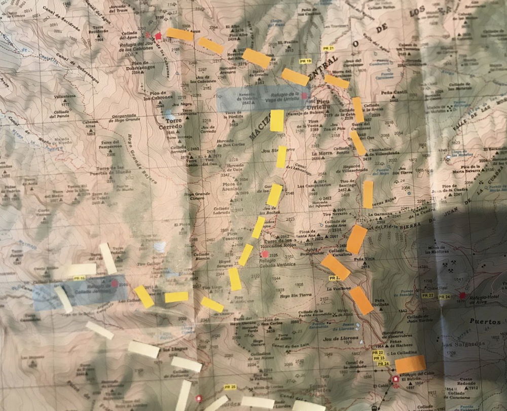 Once the topographic maps arrived, we finally started making headway on planning. Combining the background from the book we had bought and various blog posts we had read with the route information on the maps, we could mark out potential routes. Gregor Samsa’s excellent photo set and descriptions led us to focus our planning on a mix of day hikes and overnights on or around the central massif.