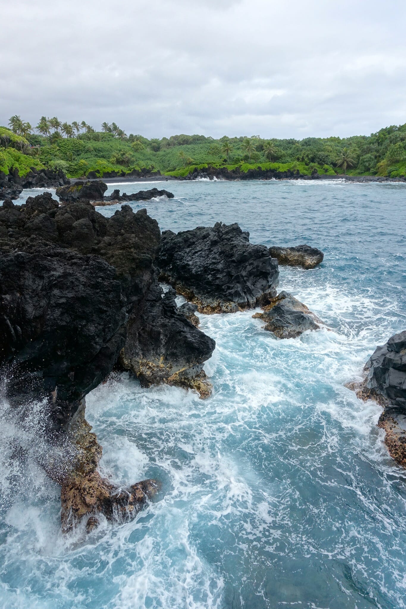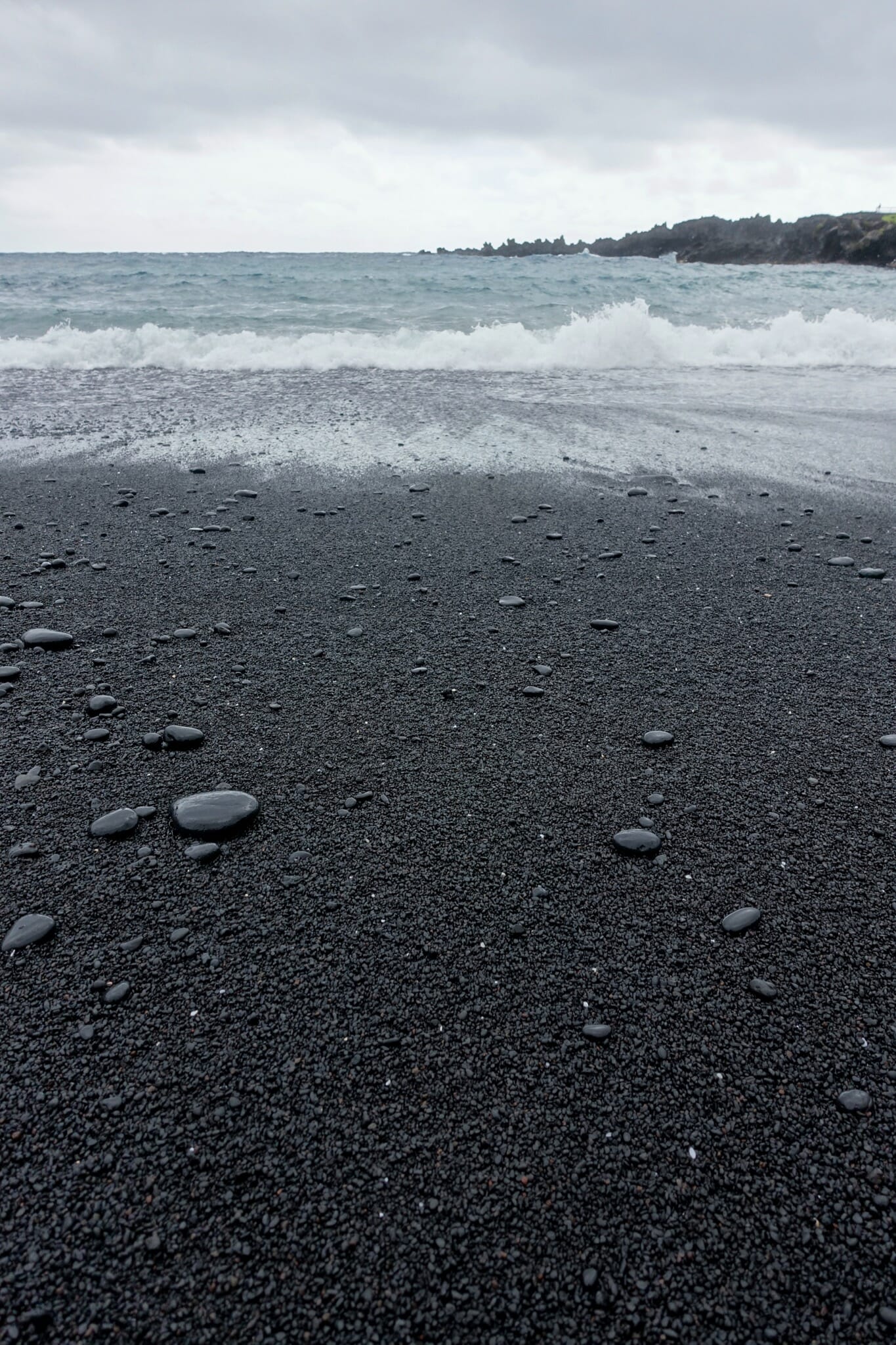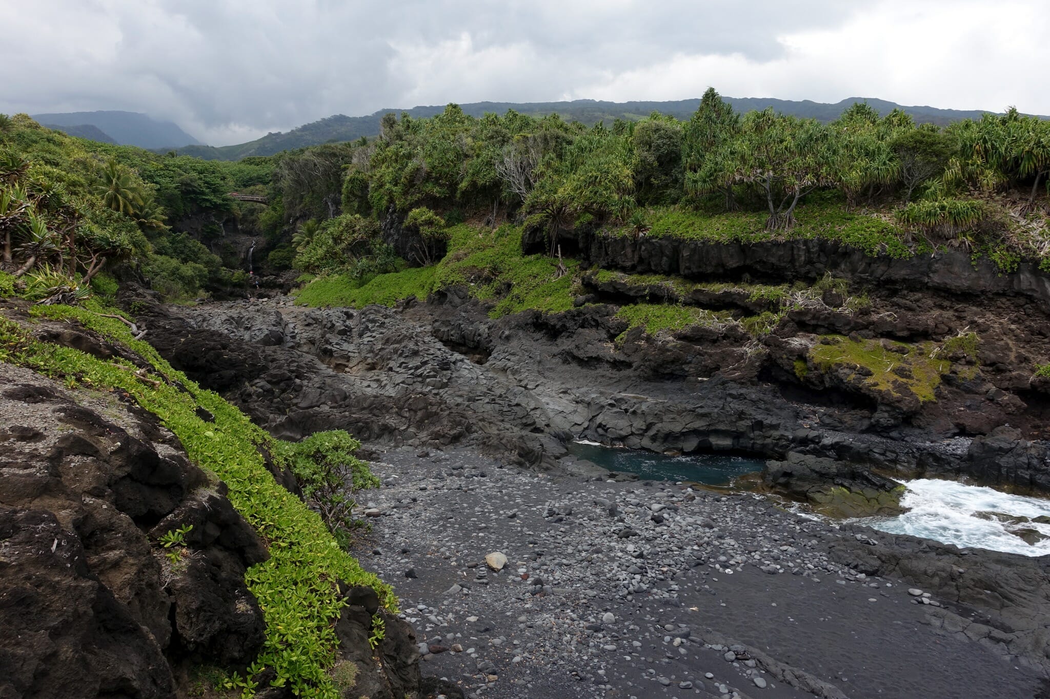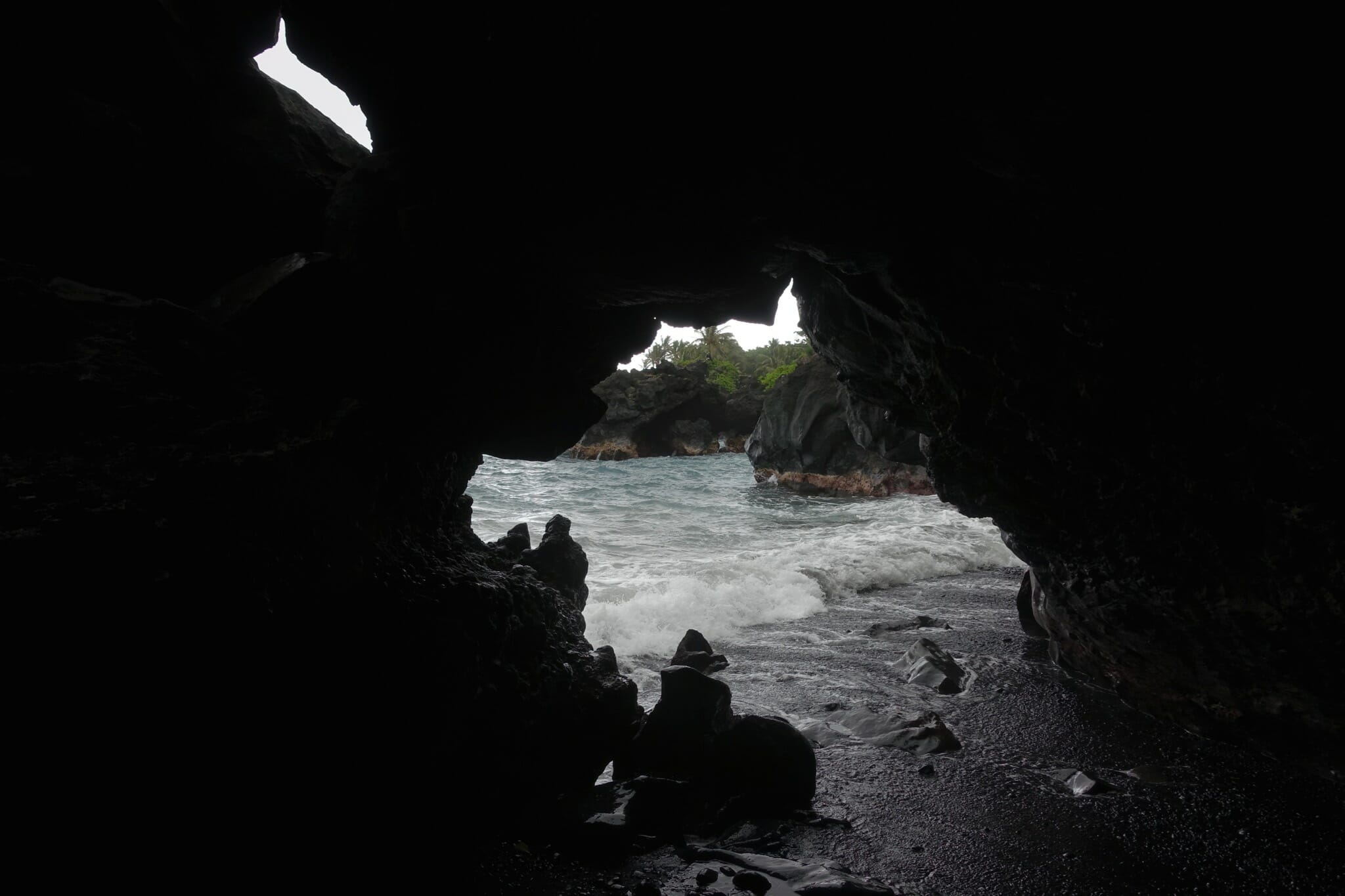 In the morning, we woke up for the return drive. We reached our first stop soon: Wai’anapanapa State Park and Pa’iloa, its black sand beach. The morning was cloudy and grey, but the water was somehow still bright and blue and the plants along the coast a verdant green. On the beach, we also stopped at a lava tube that ran into the ocean. From the beach, we followed a trial inland to two freshwater caves.