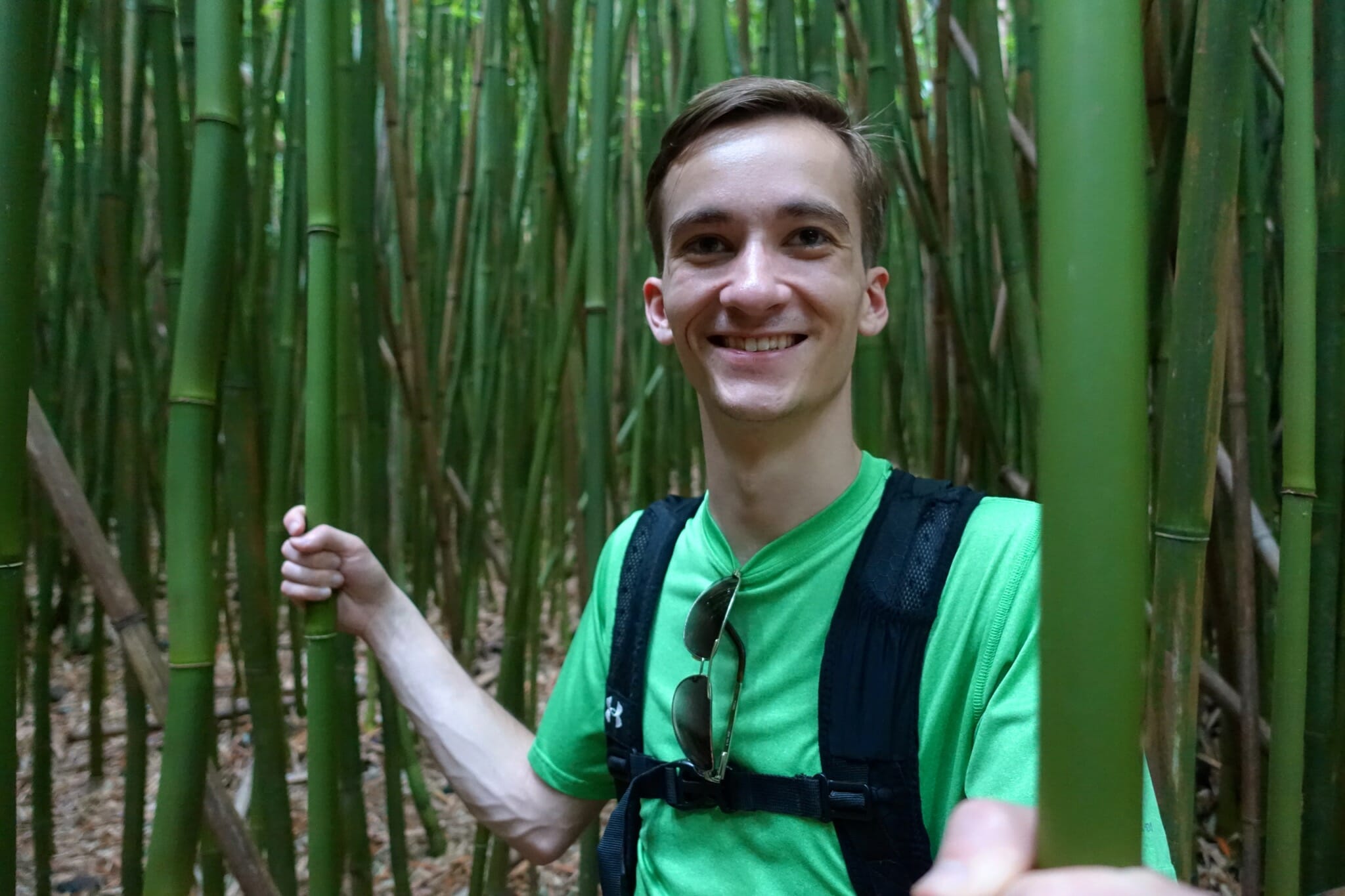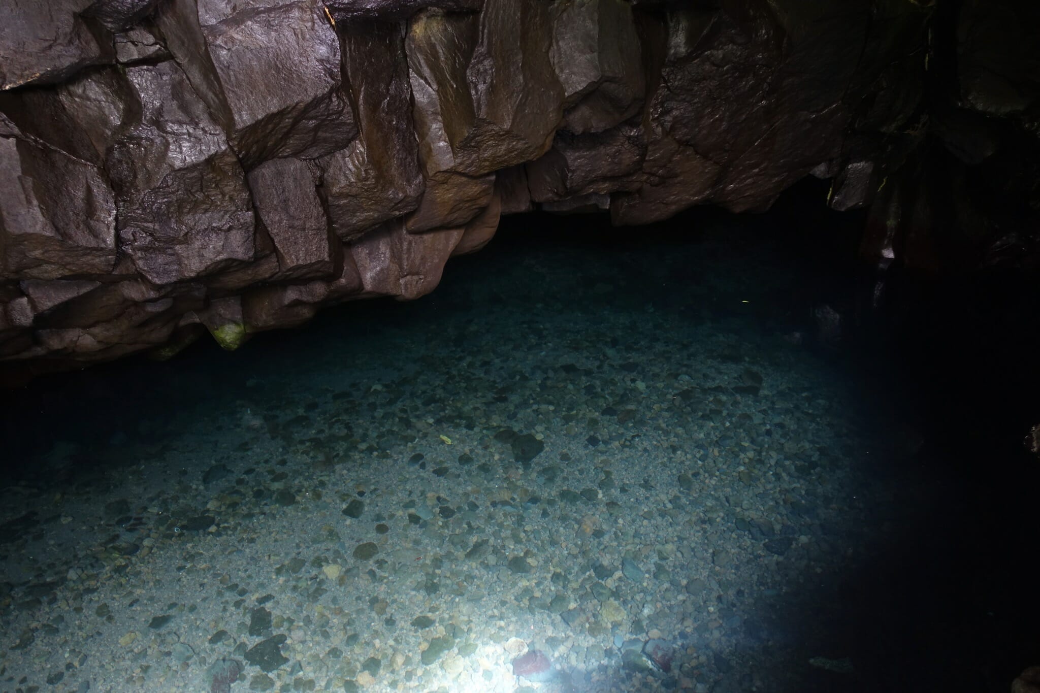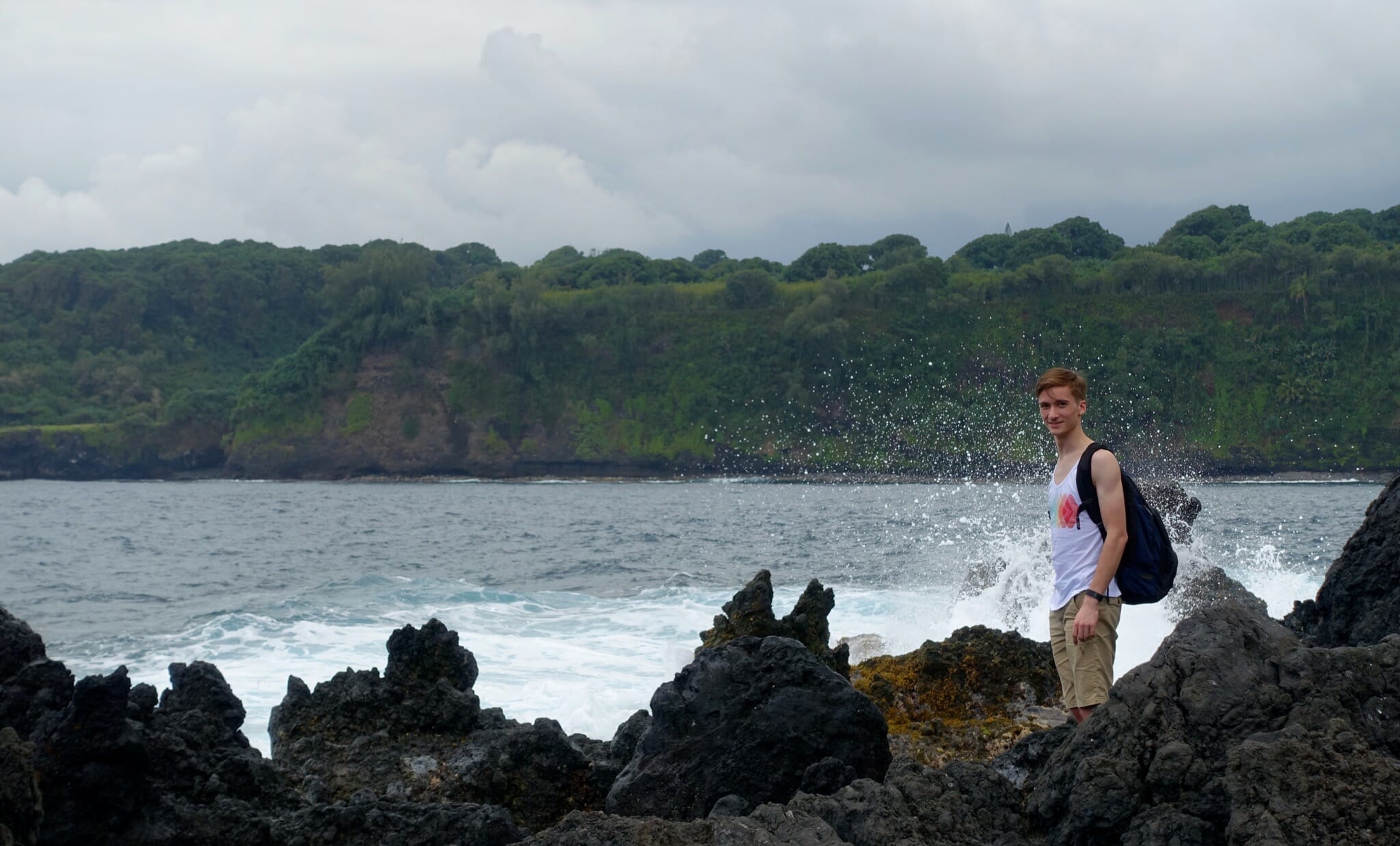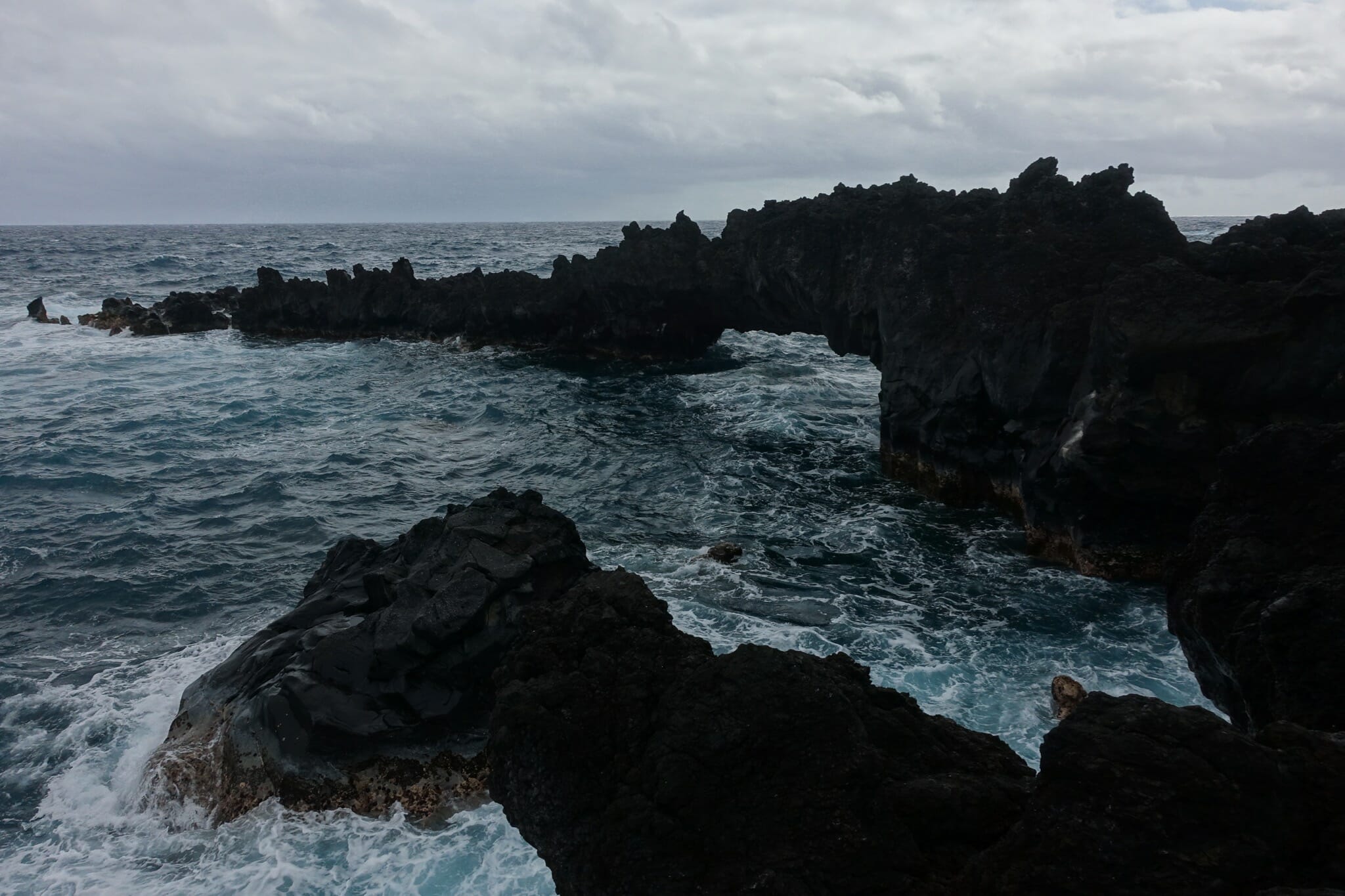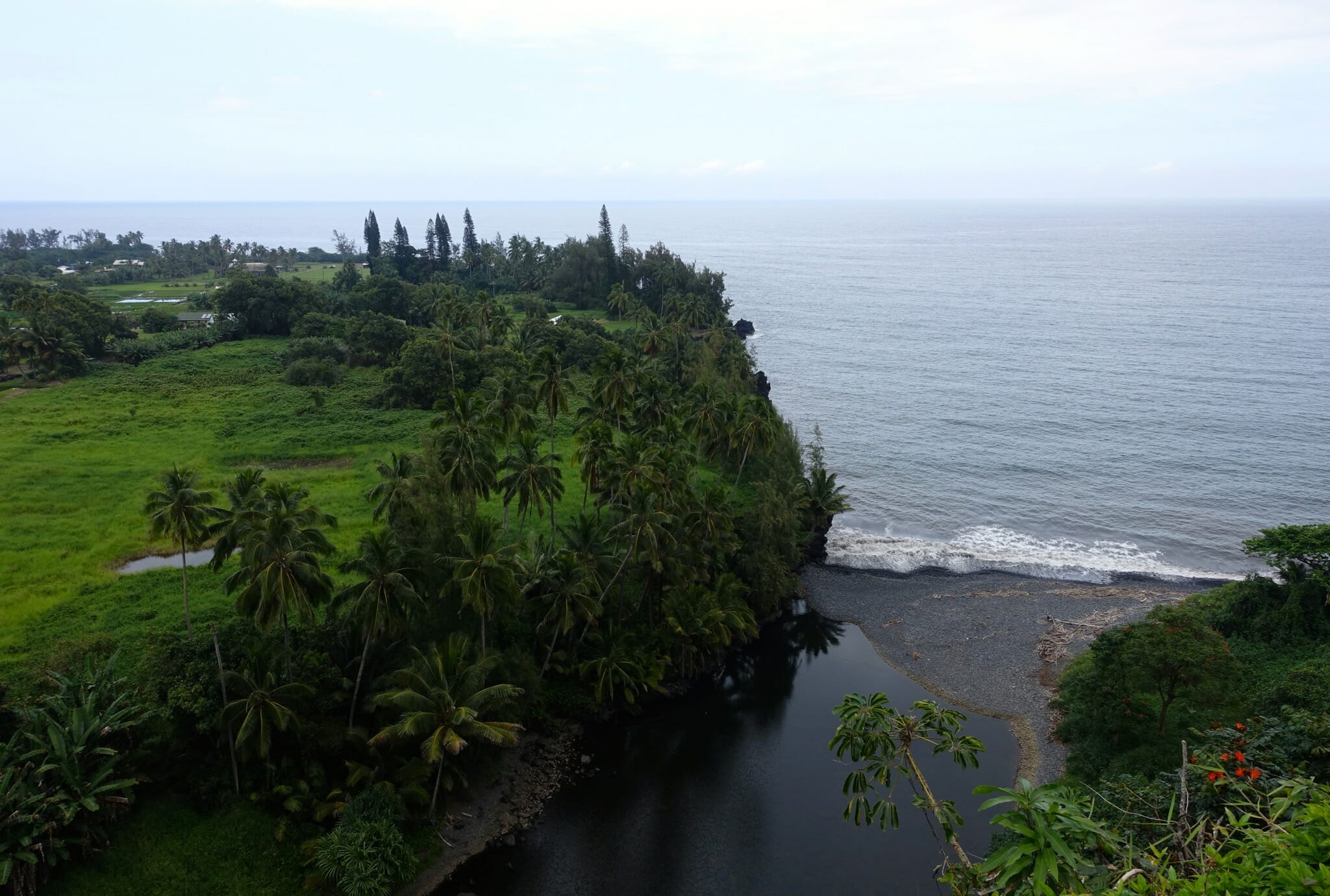 In the morning, we woke up for the return drive. We reached our first stop soon: Wai’anapanapa State Park and Pa’iloa, its black sand beach. The morning was cloudy and grey, but the water was somehow still bright and blue and the plants along the coast a verdant green. On the beach, we also stopped at a lava tube that ran into the ocean. From the beach, we followed a trial inland to two freshwater caves.
