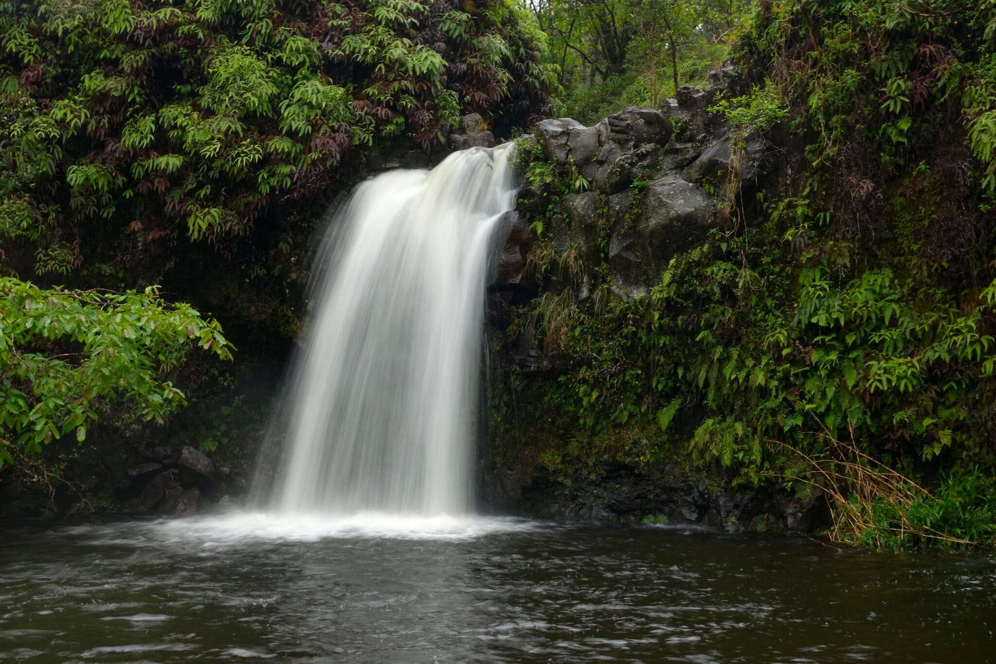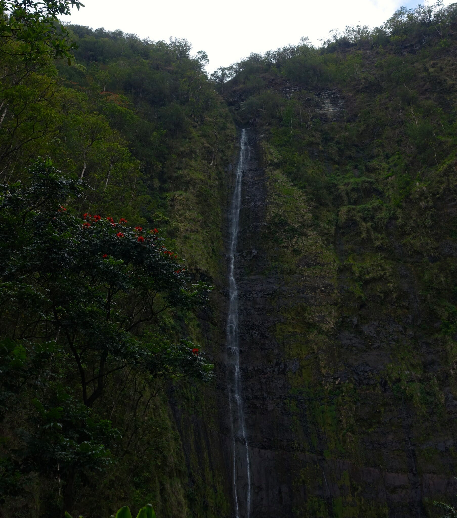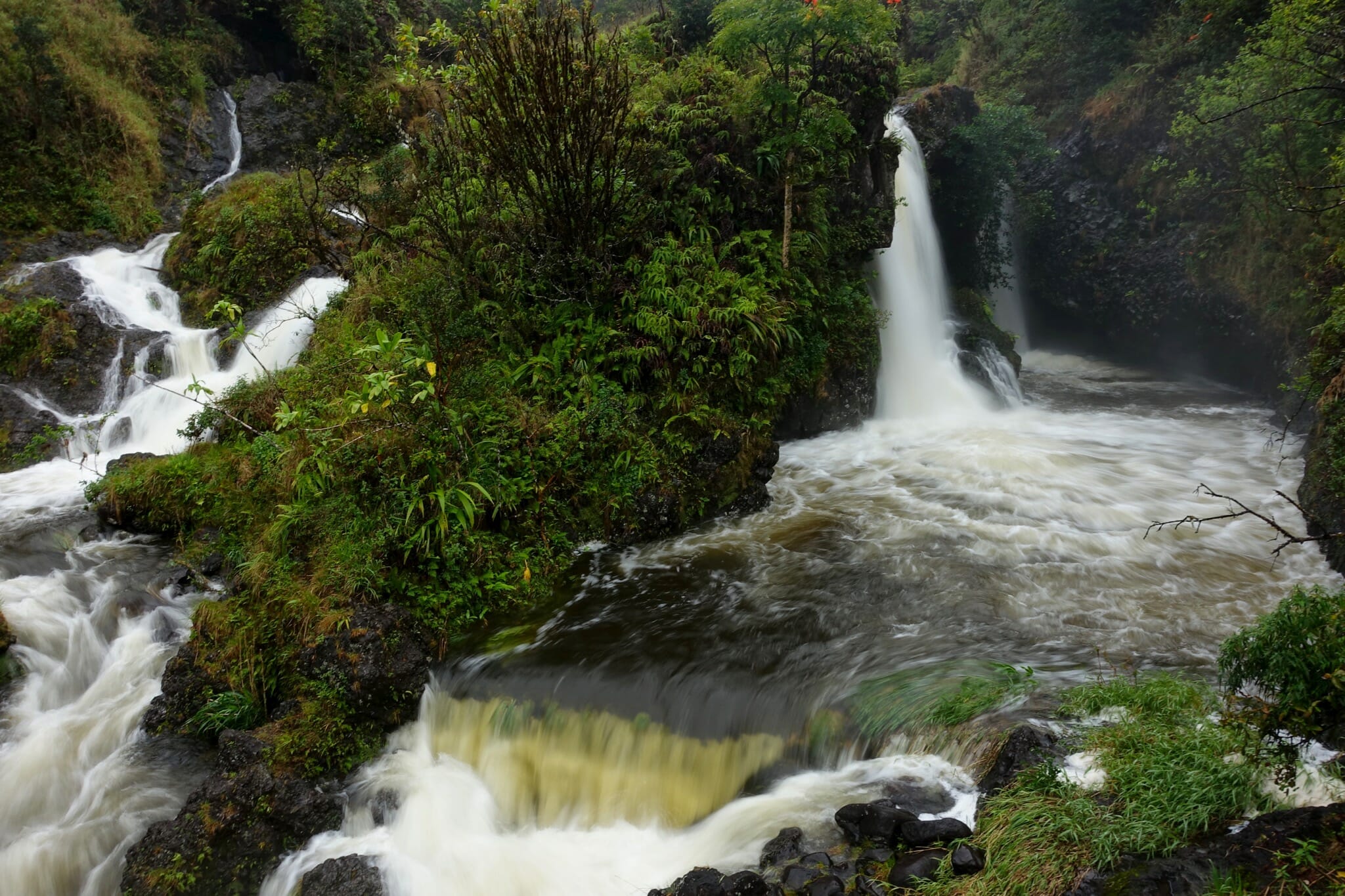 Back at the car, we continued to our next stop. After about 10 miles, we stopped at Hanawi Falls (mile marker 24). By this time, it was raining. That contributed to the 30′ falls flowing even more enthusiastically than we had seen in photos. Two miles later, we again stopped, this time for Pua’a Ka’a Falls and Pools. The rain also contributed to these falls.