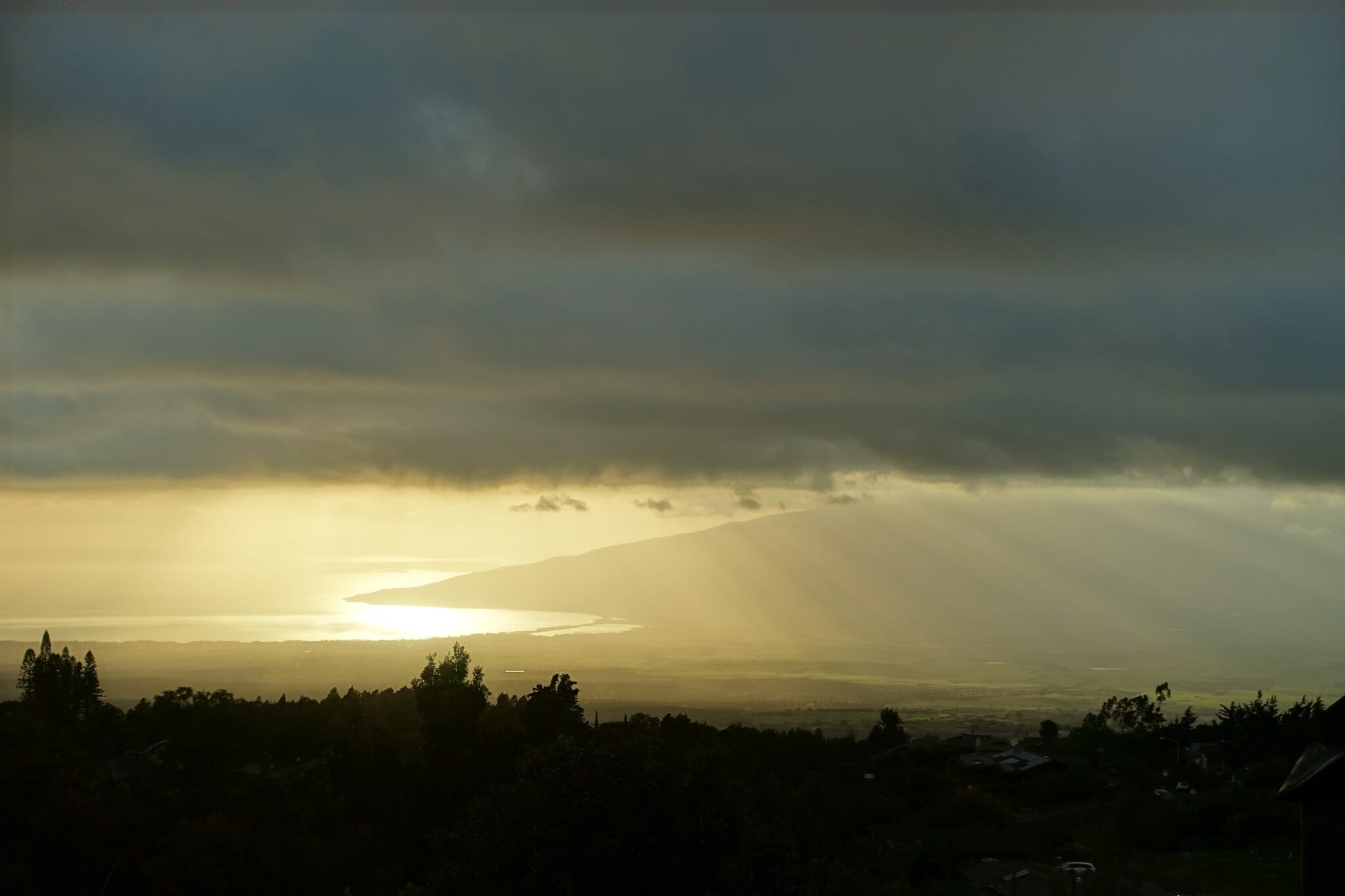 After the garden, we drove up winding Waipoli Road. This area doubles as a paragliding site, so the clear cuts gave us views out over Maui for a cloudy sunset.