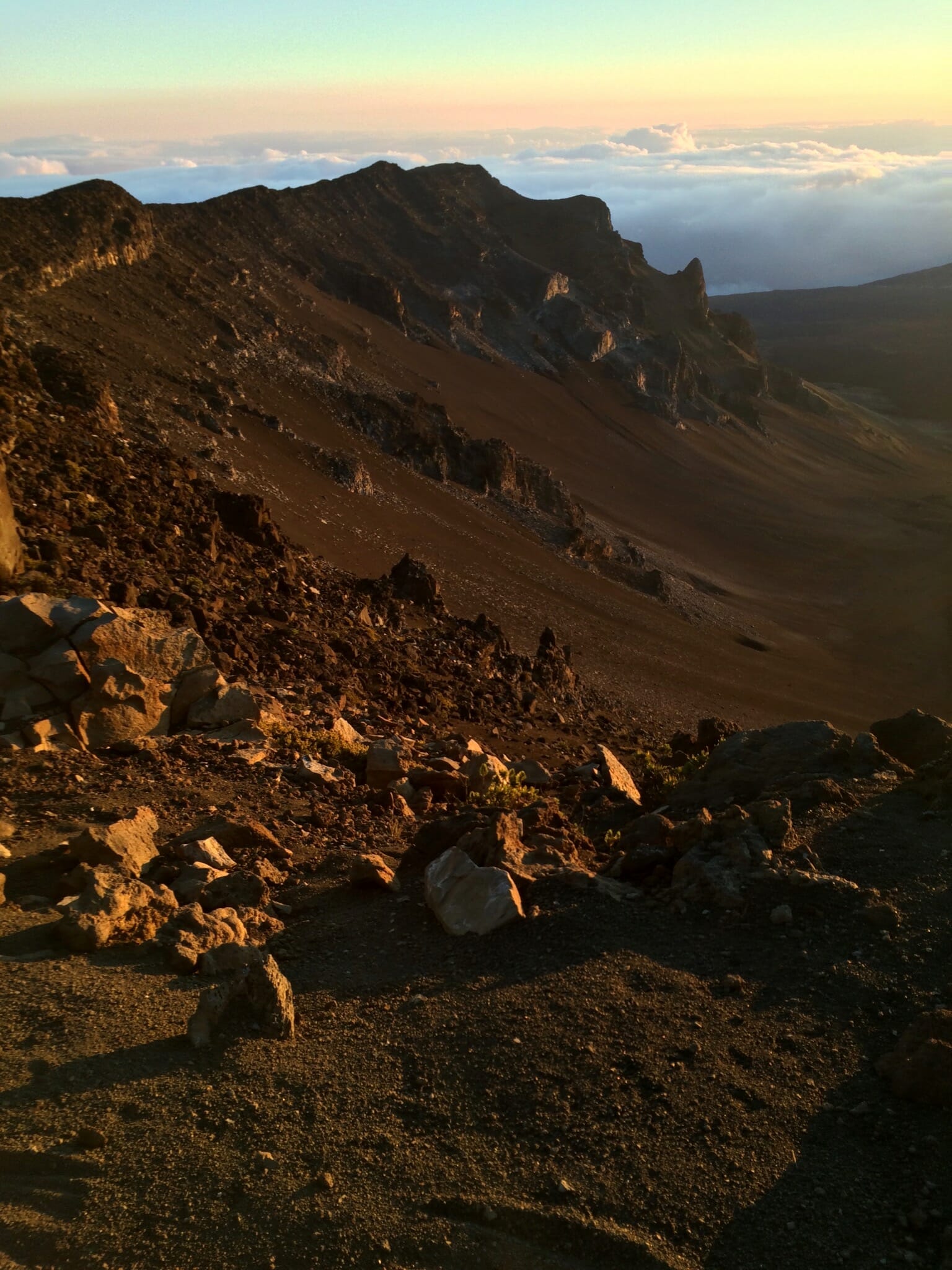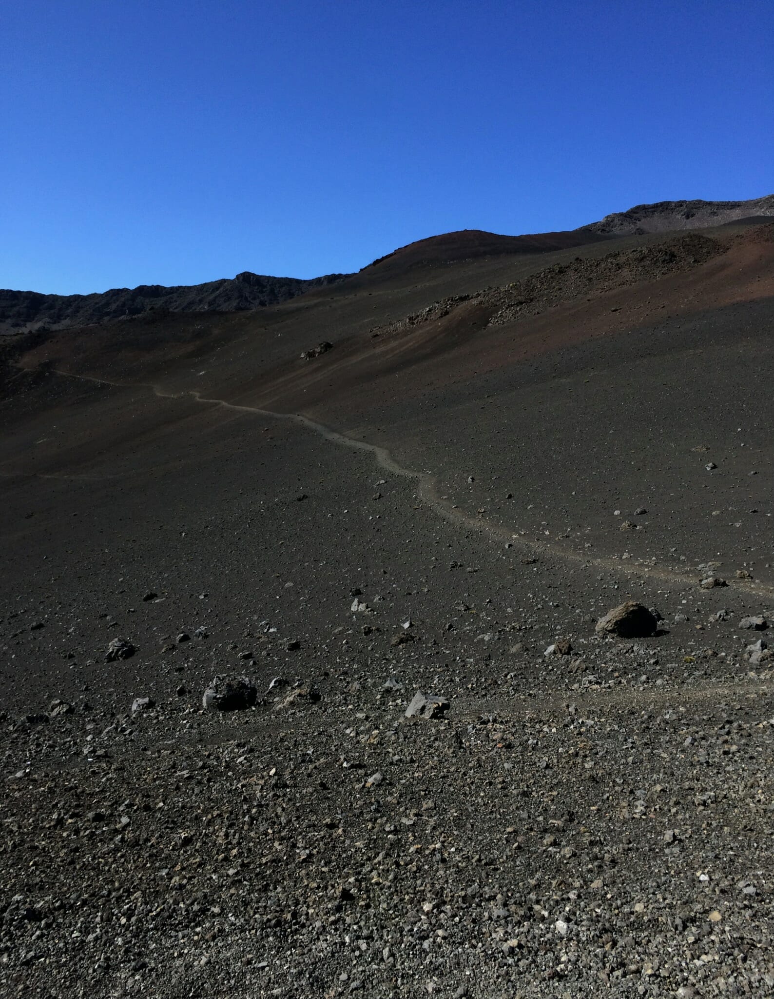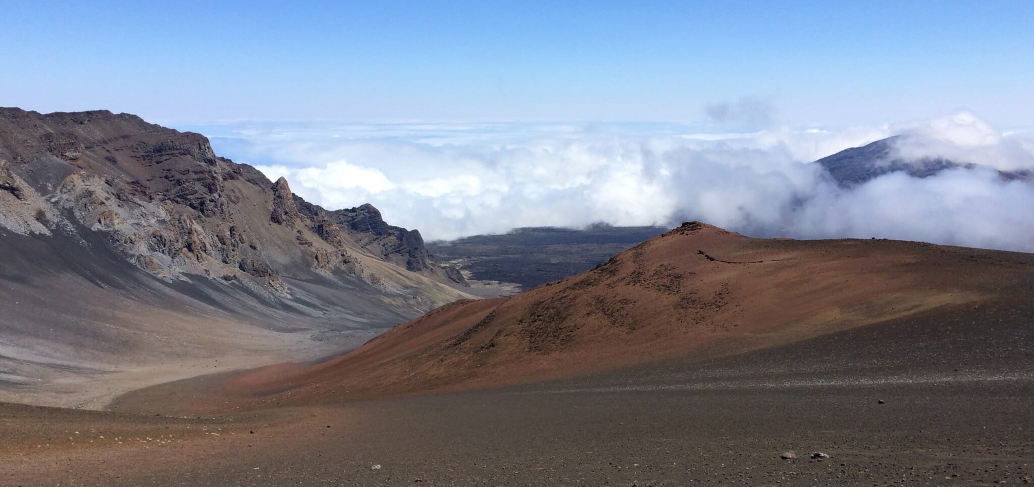 After sunrise, we started down into the crater on the Keonehe‘ehe‘e (Sliding Sands) trail, which leaves from the same overlook from which we watched sunrise. The full trail runs 11.8 miles one way. We followed it just part way down to Ka Lu’u o ka ‘O’o. The crater offers an impressive spectrum of colors of ash. I’d estimate that our route was about 4 miles round trip.