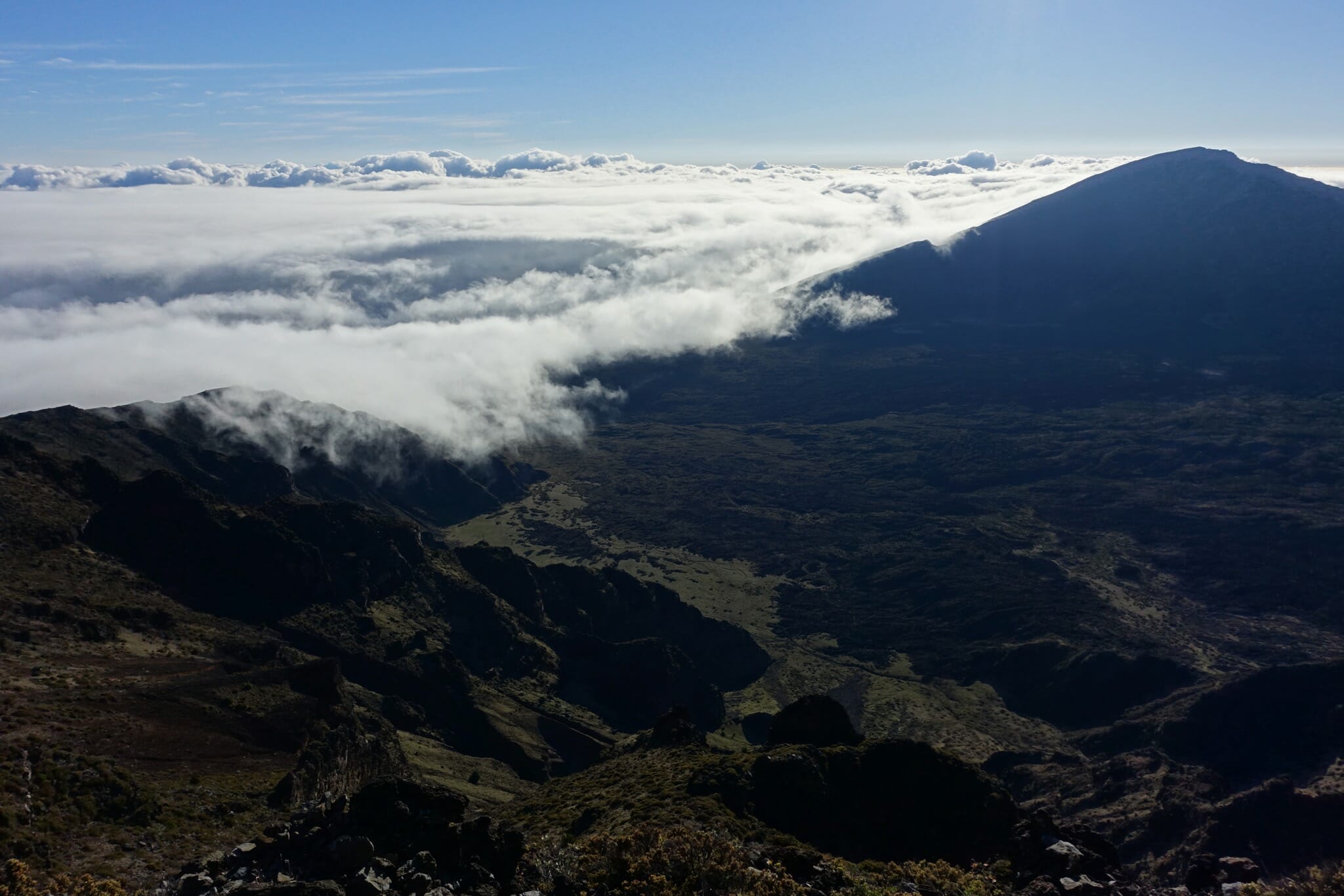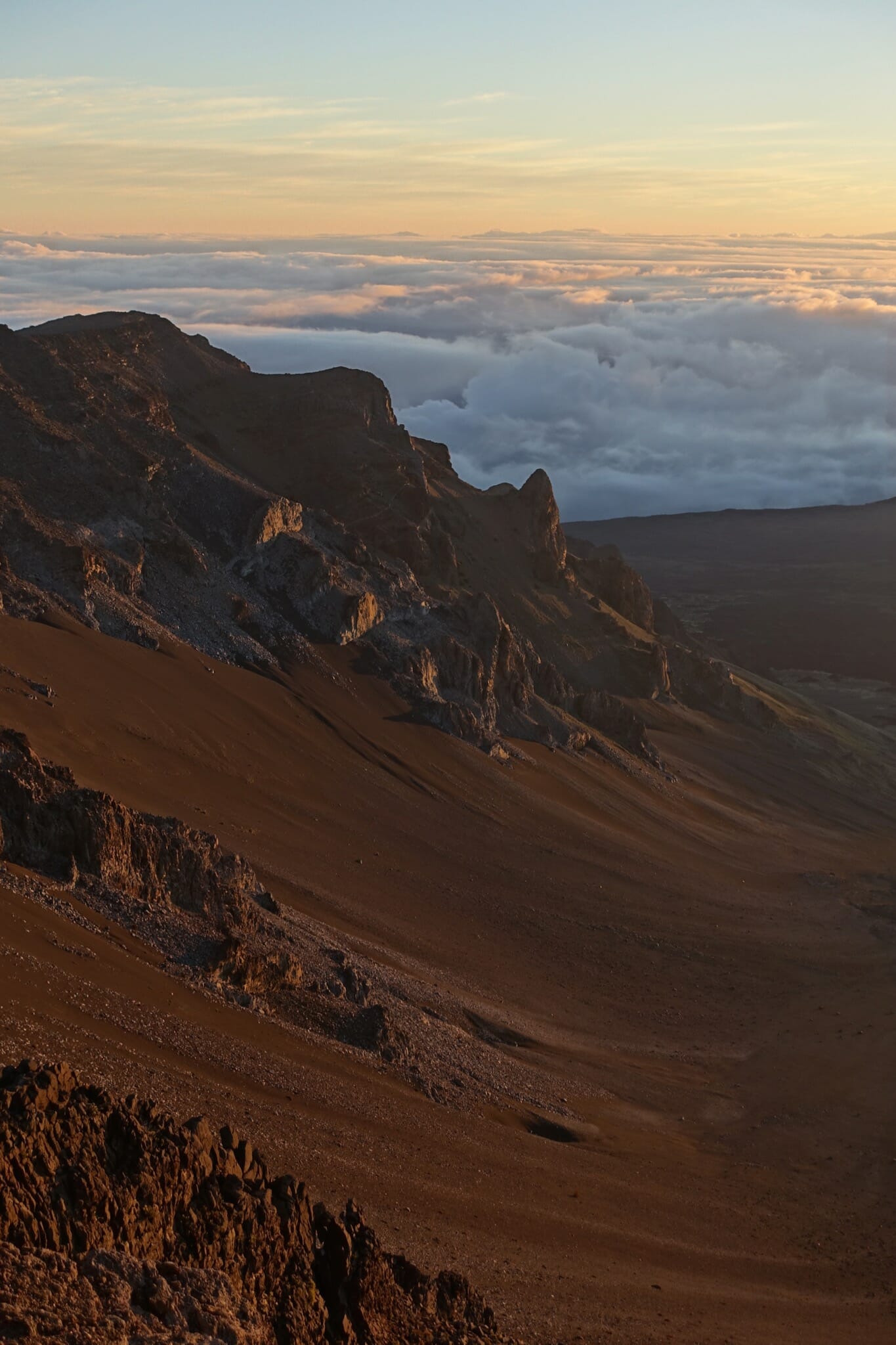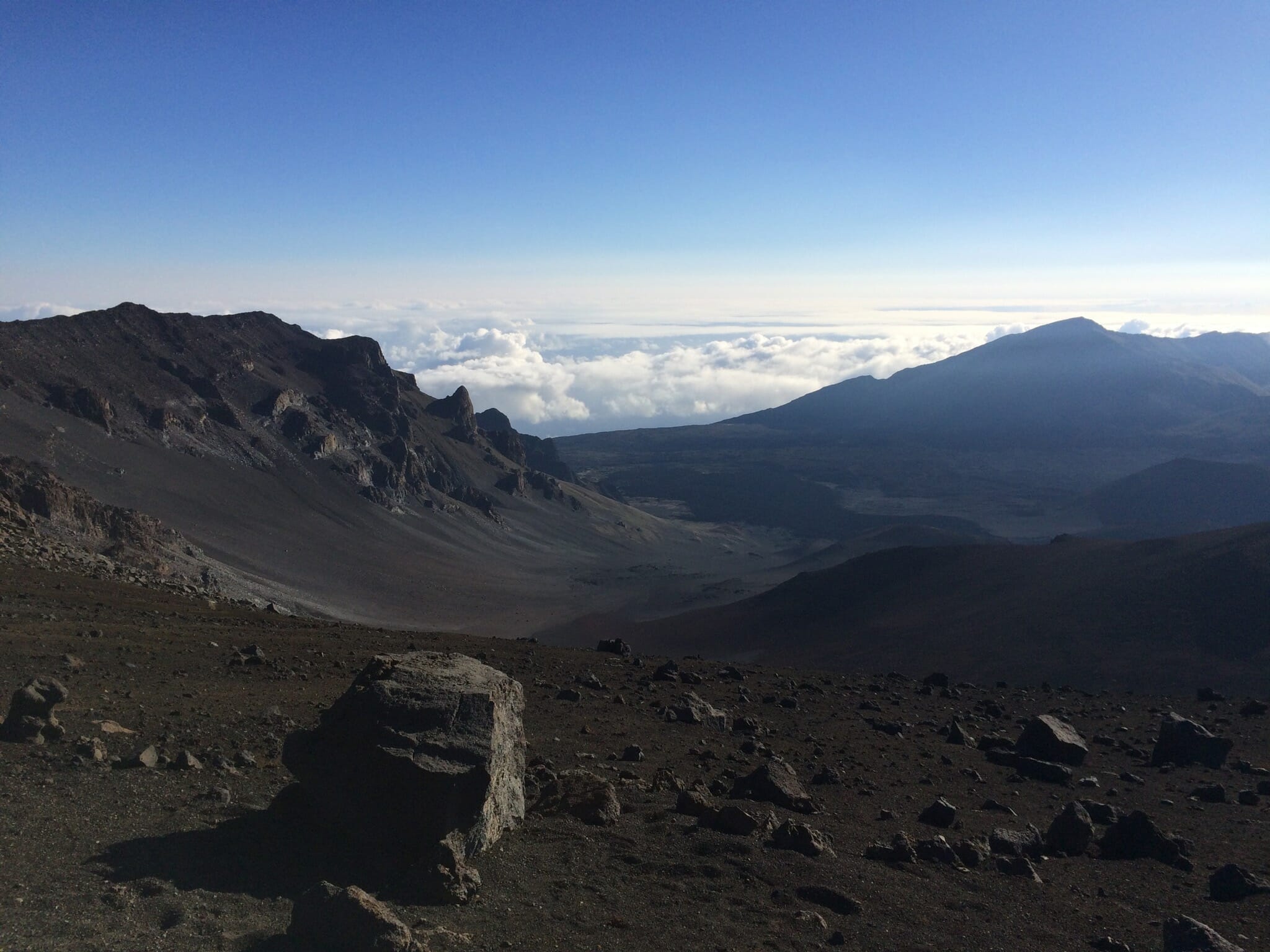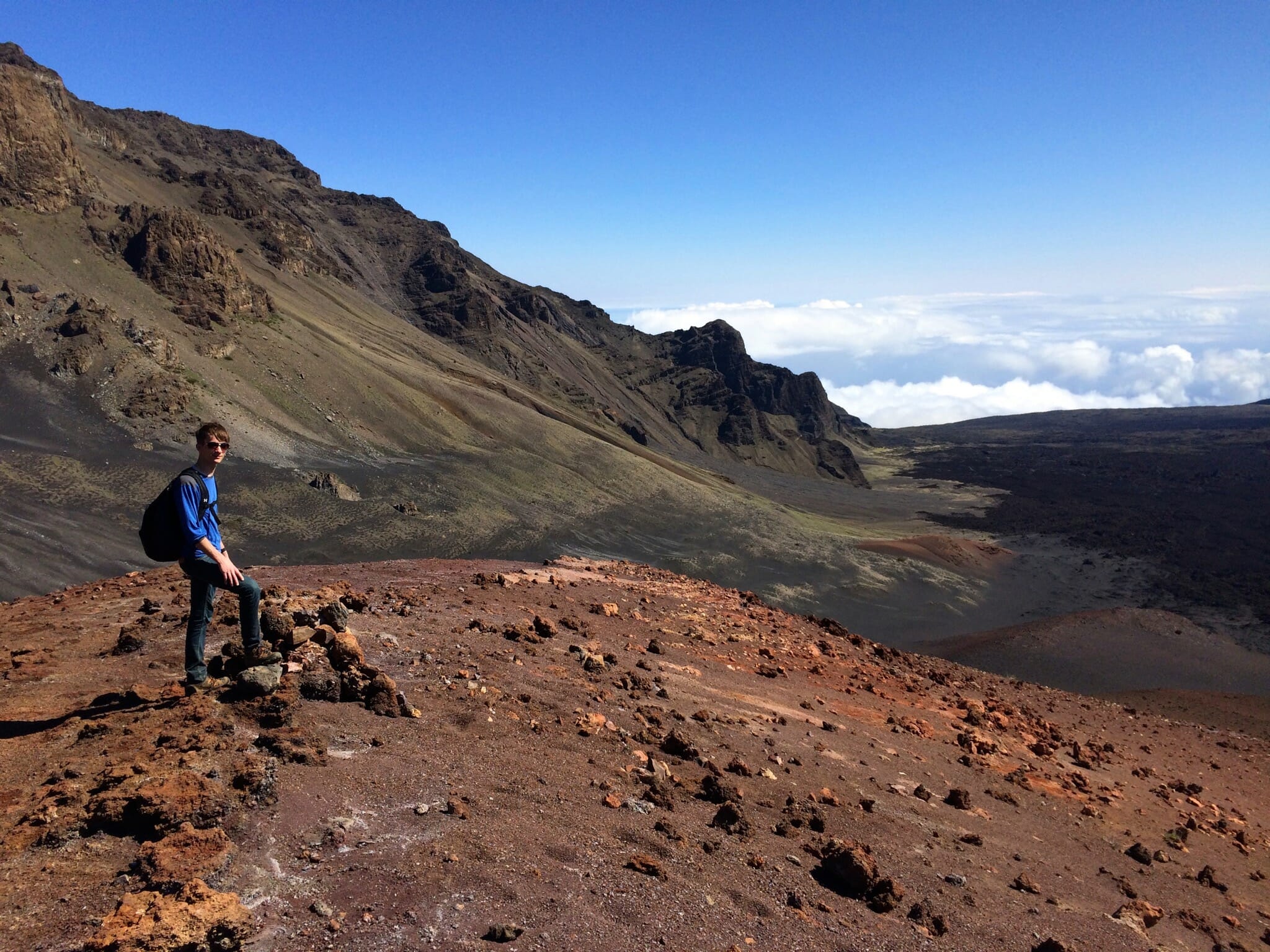 After sunrise, we started down into the crater on the Keonehe‘ehe‘e (Sliding Sands) trail, which leaves from the same overlook from which we watched sunrise. The full trail runs 11.8 miles one way. We followed it just part way down to Ka Lu’u o ka ‘O’o. The crater offers an impressive spectrum of colors of ash. I’d estimate that our route was about 4 miles round trip.