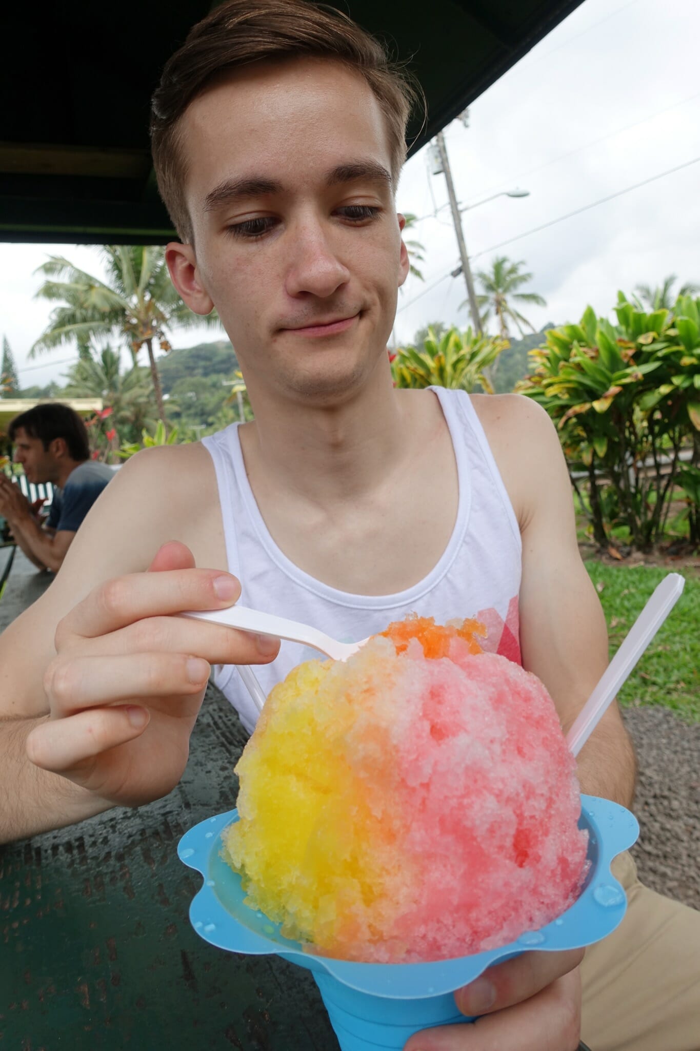From there, we continued on our drive. In Kahului, we stopped at Geste Shrimp Truck for a delicious lunch of shrimp, rice, and crab mac salad. The rain was still coming down, so we ate in the car.