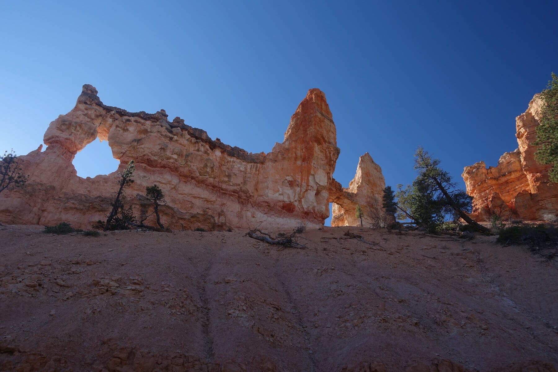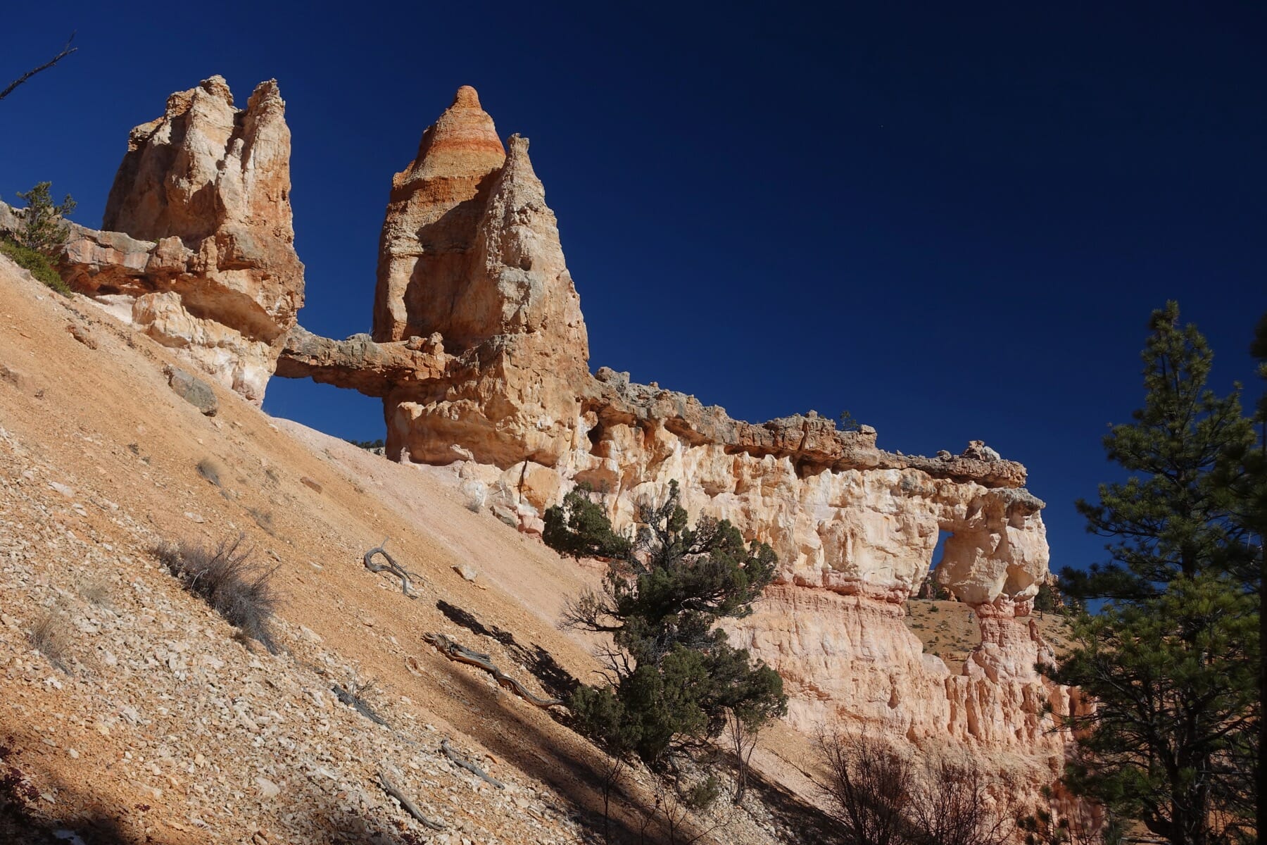 After four miles, we reached a spur trail to Tower Bridge. While we could see Tower Bridge from the main trail, we followed the spur trail around to a better vantage. Tower Bridge features a natural bridge connecting two spires of hoodoos, with an additional arch off to the side. This made a good spot for an early lunch break.