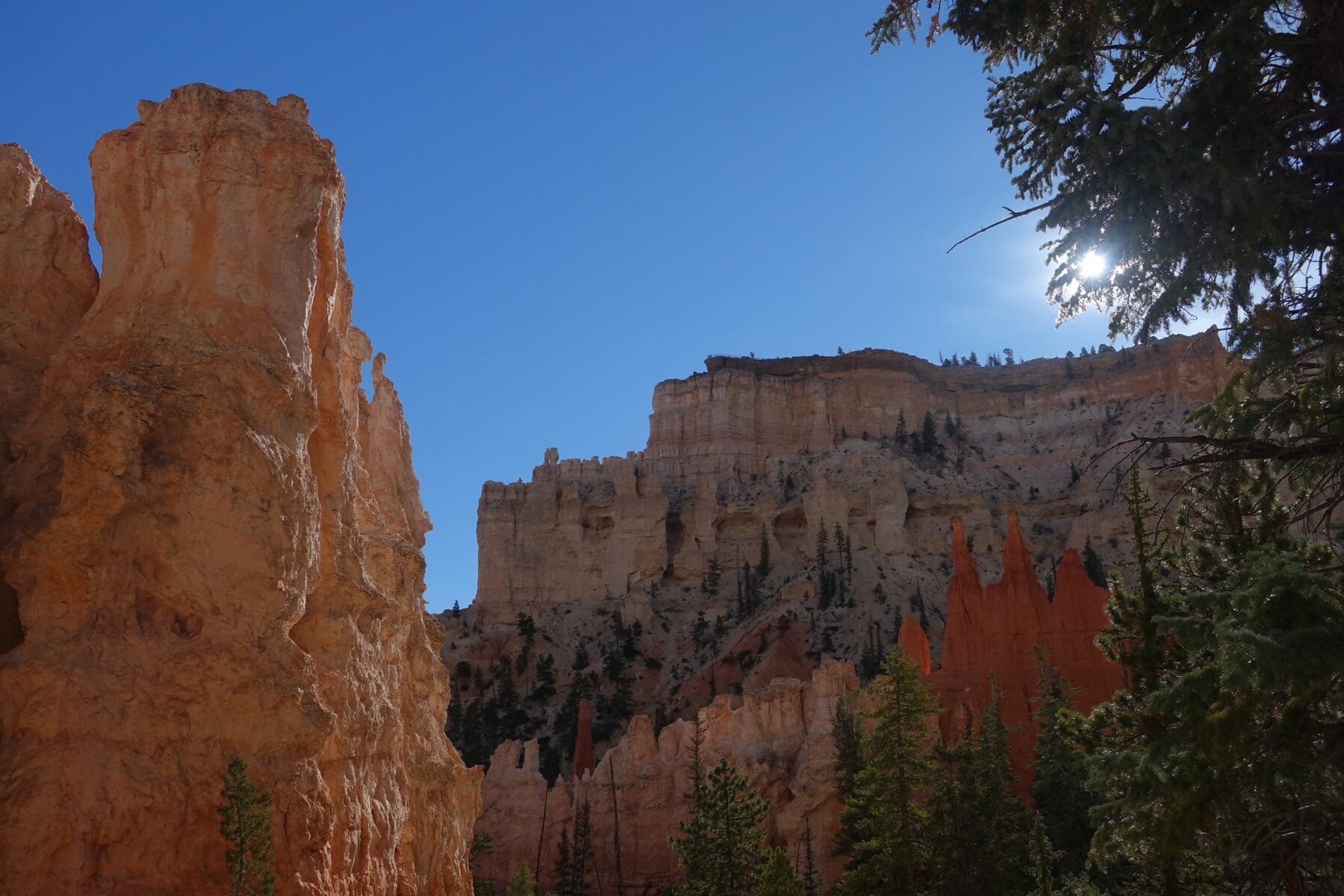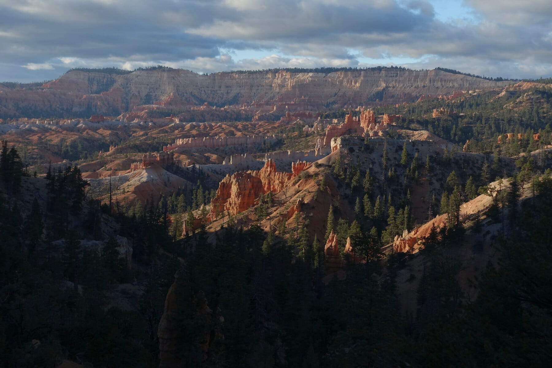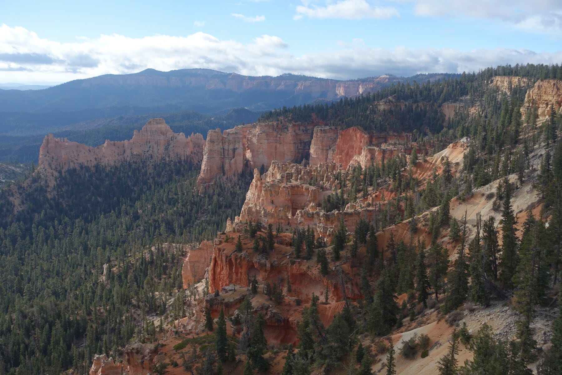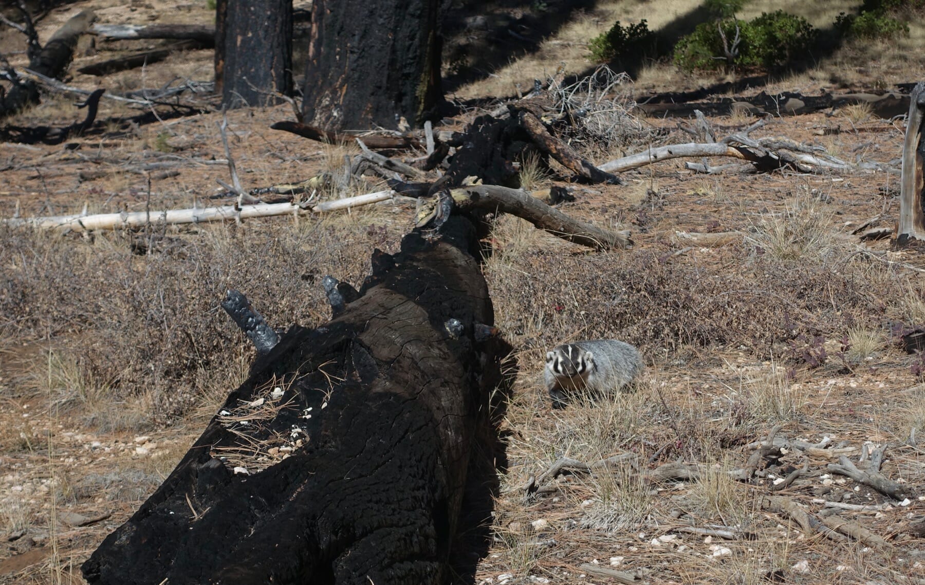 We hiked counterclockwise. This route descends gradually to Yovimpa Pass (8334′), before descending more steeply to Riggs Spring (7514′). Along the way, we passed a badger — I think the first I’ve seen in the wild. Once below the rim, hoodoos in the rim walls towered above us, with a spruce, bristlecone, and fir forest between us and them. As we rounded the bend and began climbing back to the point, we could see back toward the main amphitheater and the Aquarius Plateau in the distance.