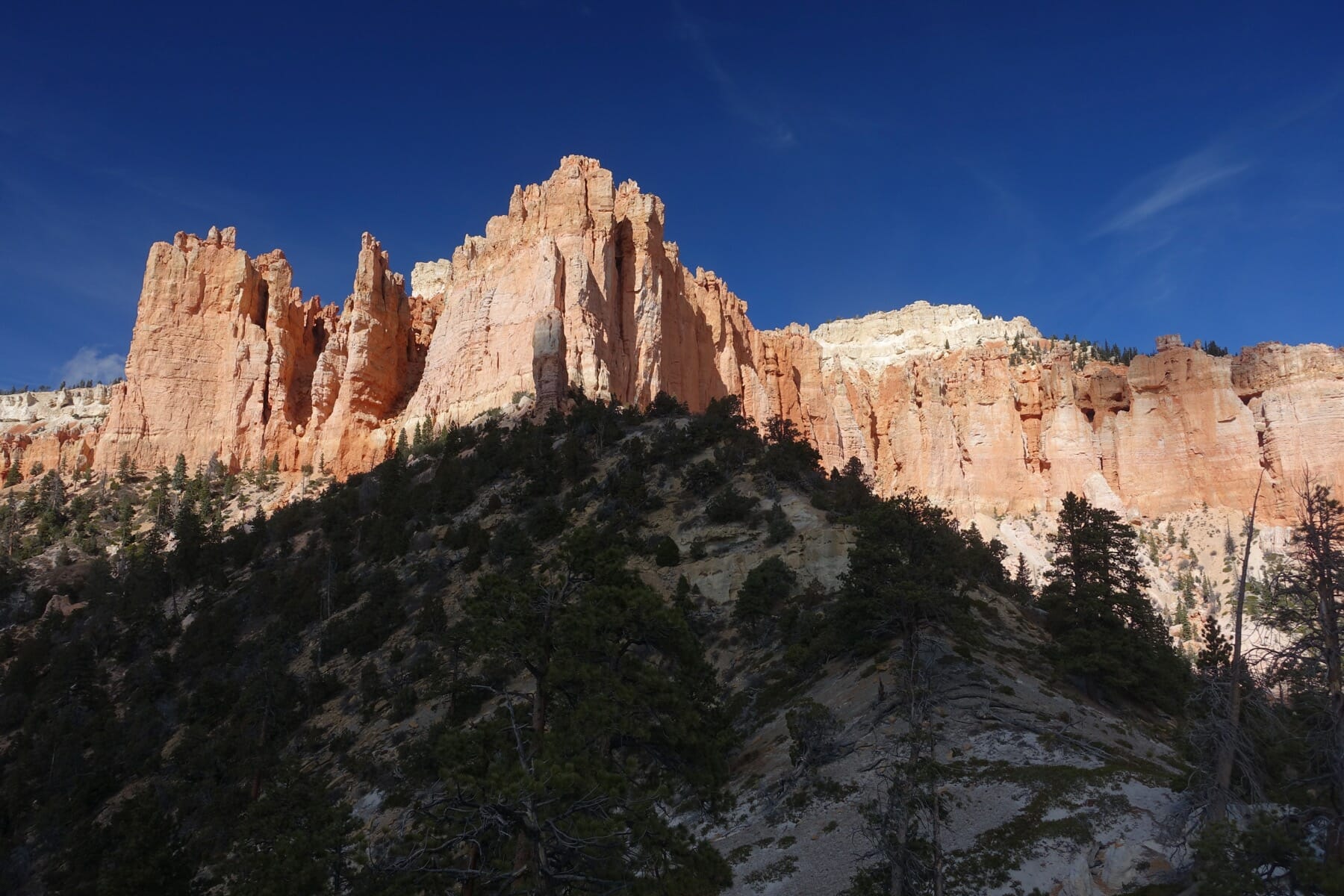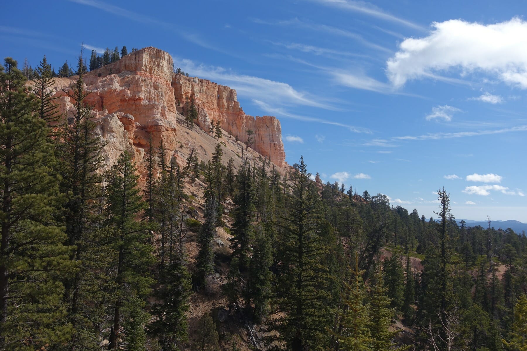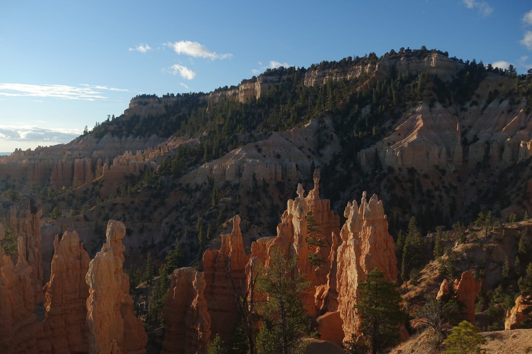 We hiked counterclockwise. This route descends gradually to Yovimpa Pass (8334′), before descending more steeply to Riggs Spring (7514′). Along the way, we passed a badger — I think the first I’ve seen in the wild. Once below the rim, hoodoos in the rim walls towered above us, with a spruce, bristlecone, and fir forest between us and them. As we rounded the bend and began climbing back to the point, we could see back toward the main amphitheater and the Aquarius Plateau in the distance.