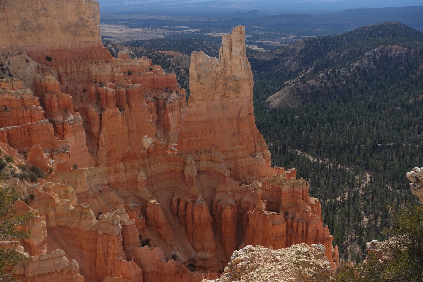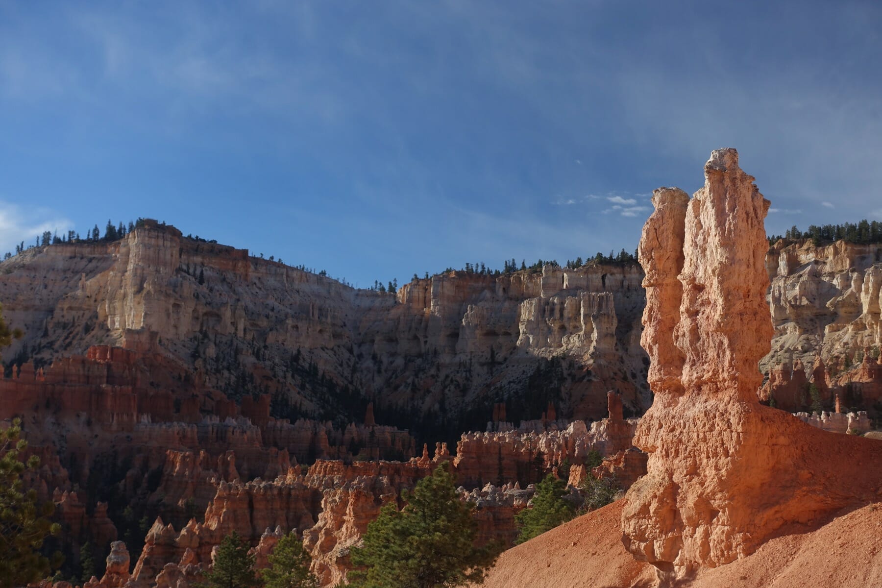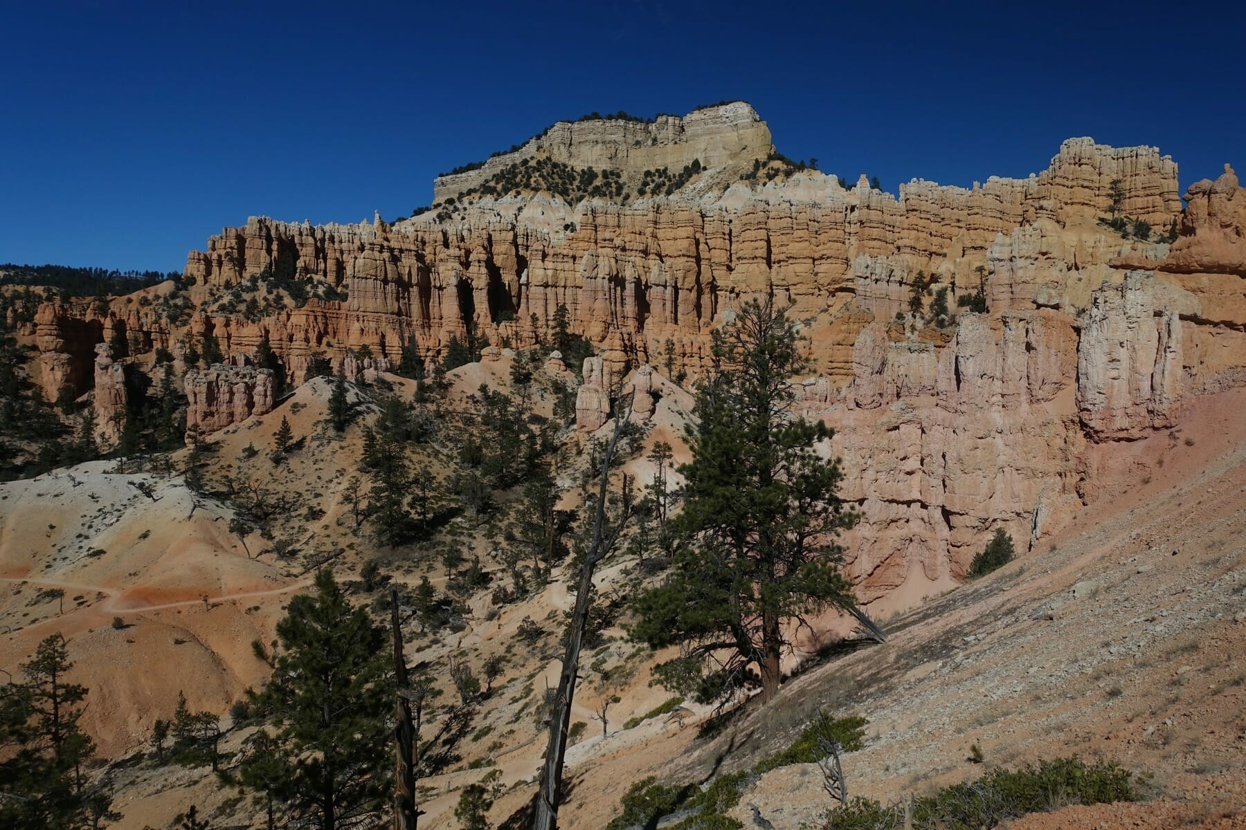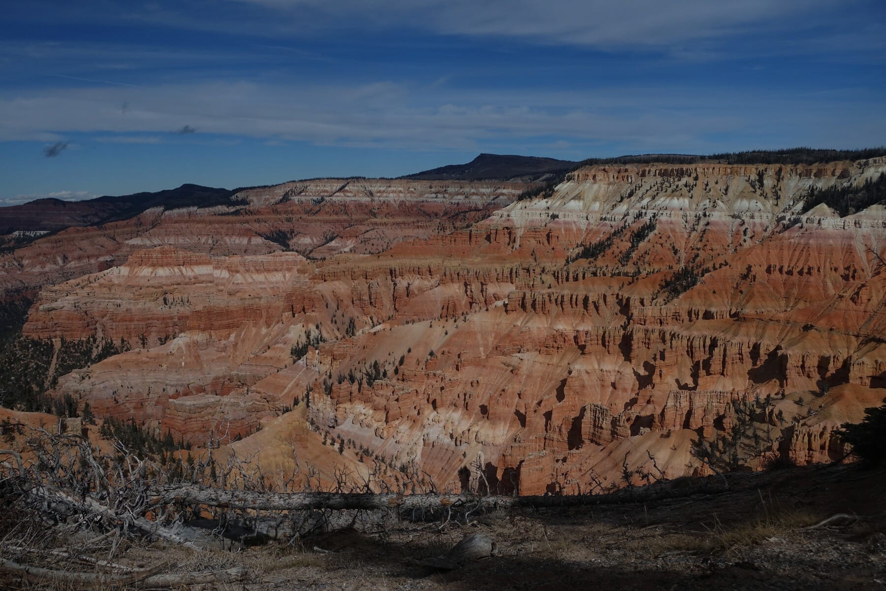 We hiked counterclockwise. This route descends gradually to Yovimpa Pass (8334′), before descending more steeply to Riggs Spring (7514′). Along the way, we passed a badger — I think the first I’ve seen in the wild. Once below the rim, hoodoos in the rim walls towered above us, with a spruce, bristlecone, and fir forest between us and them. As we rounded the bend and began climbing back to the point, we could see back toward the main amphitheater and the Aquarius Plateau in the distance.