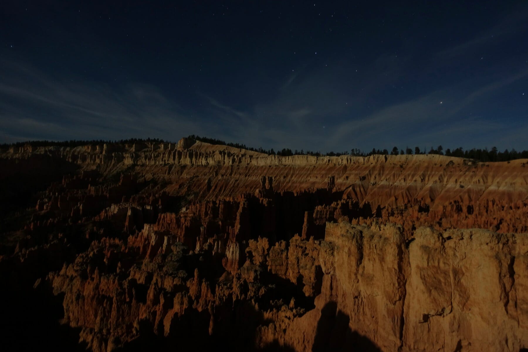 After sunset, we walked to the nearby Bryce Canyon lodge for dinner. We were in luck — it was one of the final nights the lodge would serve dinner for the 2017 season. Dinner was good and filling, though we paid a premium for the location. It was worth it. After we ate, we could walk back out to Sunrise and Sunset Points to admire the stars. A bright moon and high, wispy clouds somewhat obscured the stars, but the moon lit up the rock below beautifully.