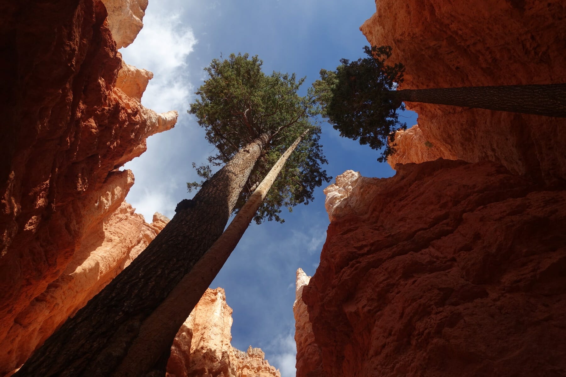 I had such fond childhood memories of the Wall Street section that I encouraged us to choose that route. It’s a gorgeous stretch of trail through a slot canyon. A few trees have somehow climbed up past the canyon walls, becoming towering monuments themselves.