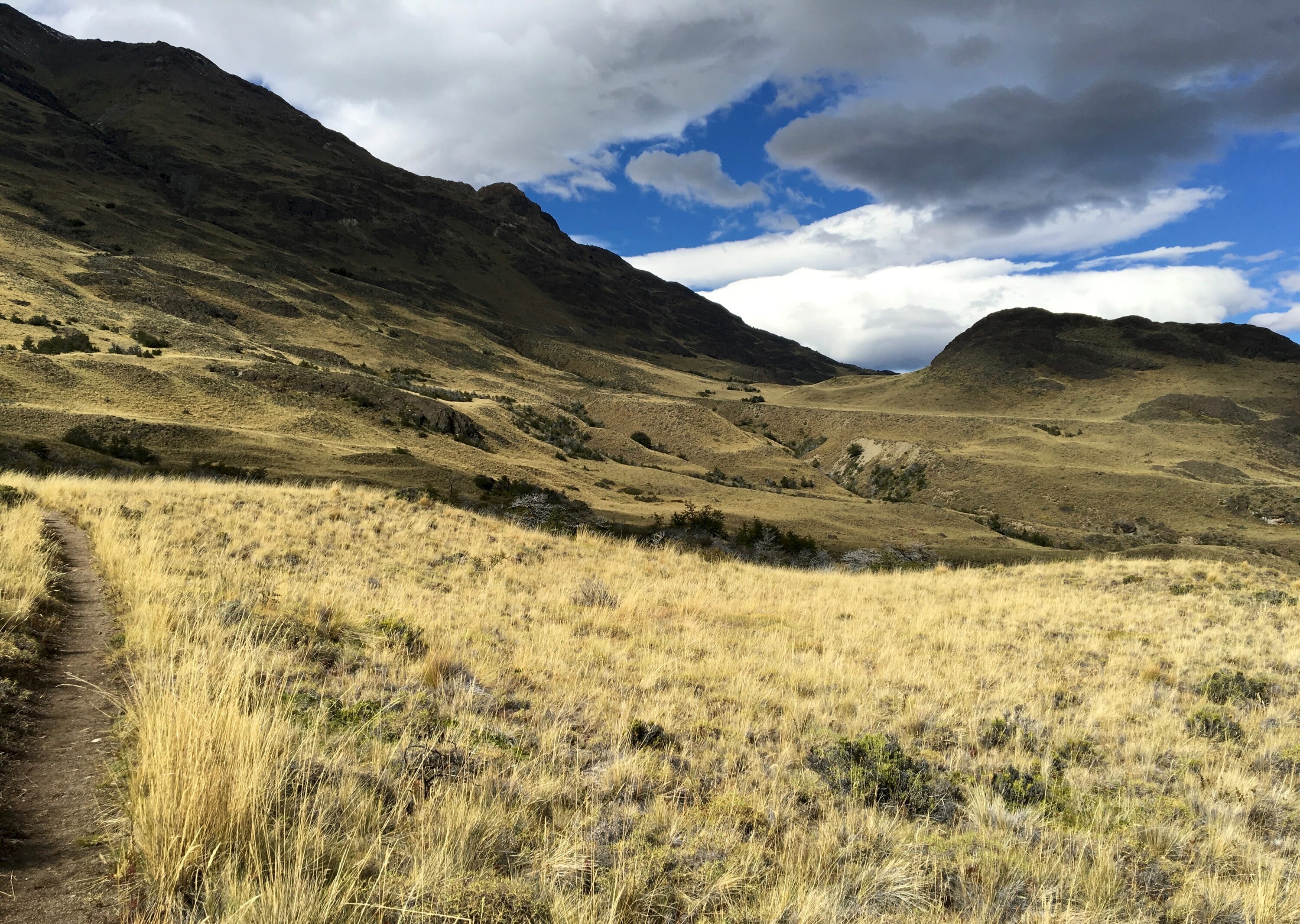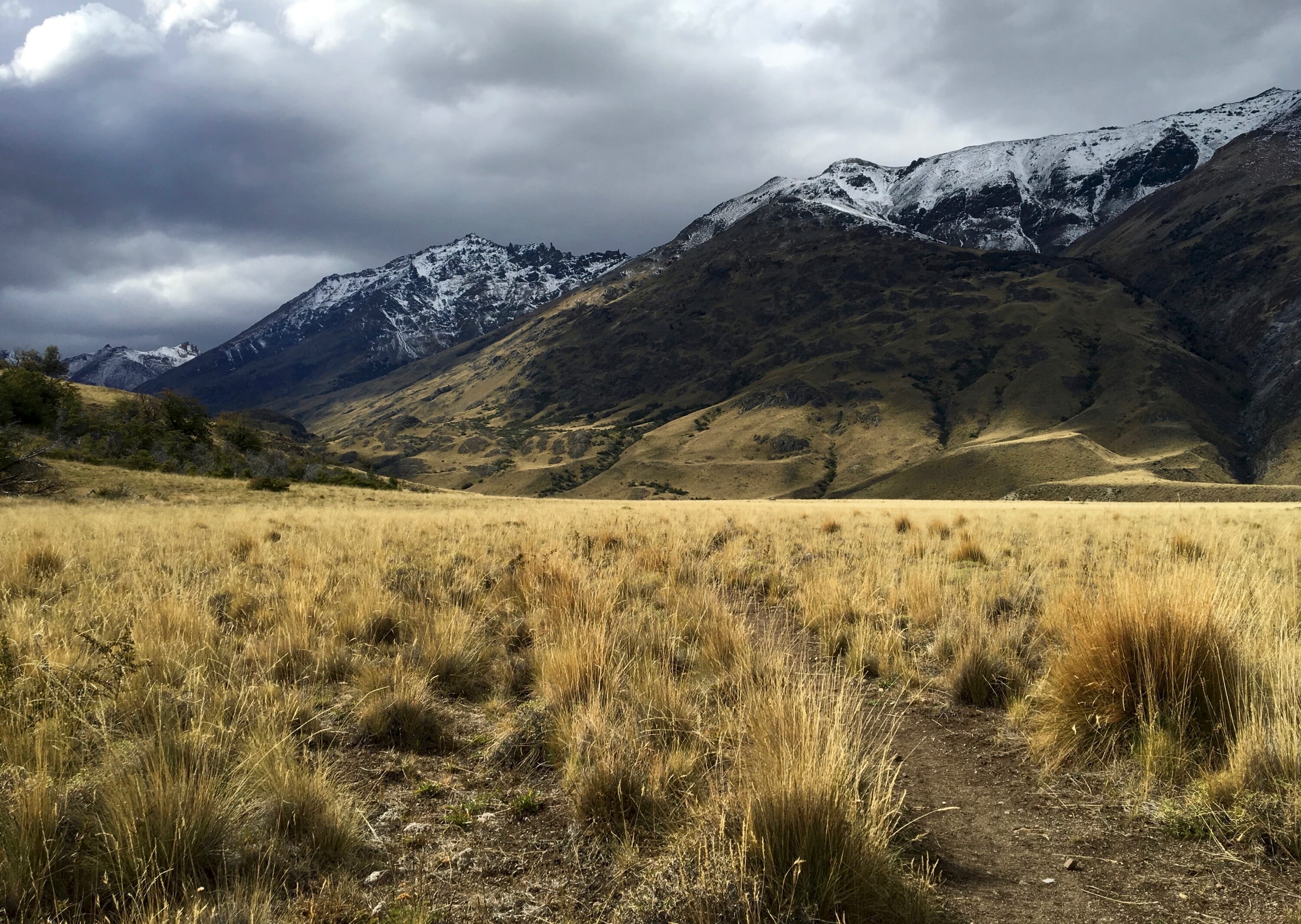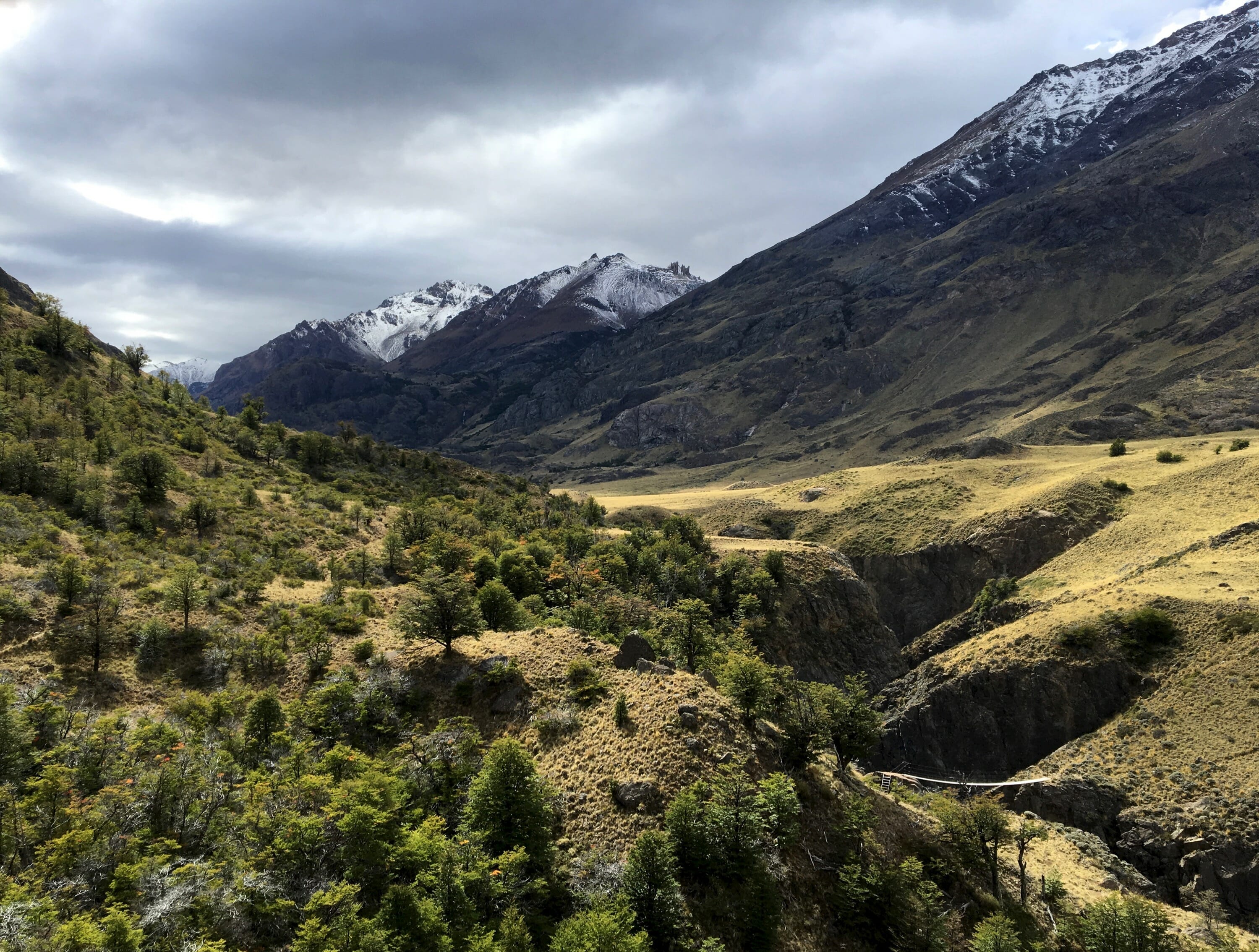 The other (western) side of the valley, at least for me, was the highlight of this hike. For awhile, you have impressive views of the cliff walls surrounding the river. The trail then transitions to the massive plateaus that lead you gently toward the final descent at the foot of the valley. In March, the grasslands on these plateaus were a beautiful golden color that glowed in the sunlight. These contrasted starkly with the ominous, dark clouds over the surrounding mountain peaks — an effect not easily captured in our photos.