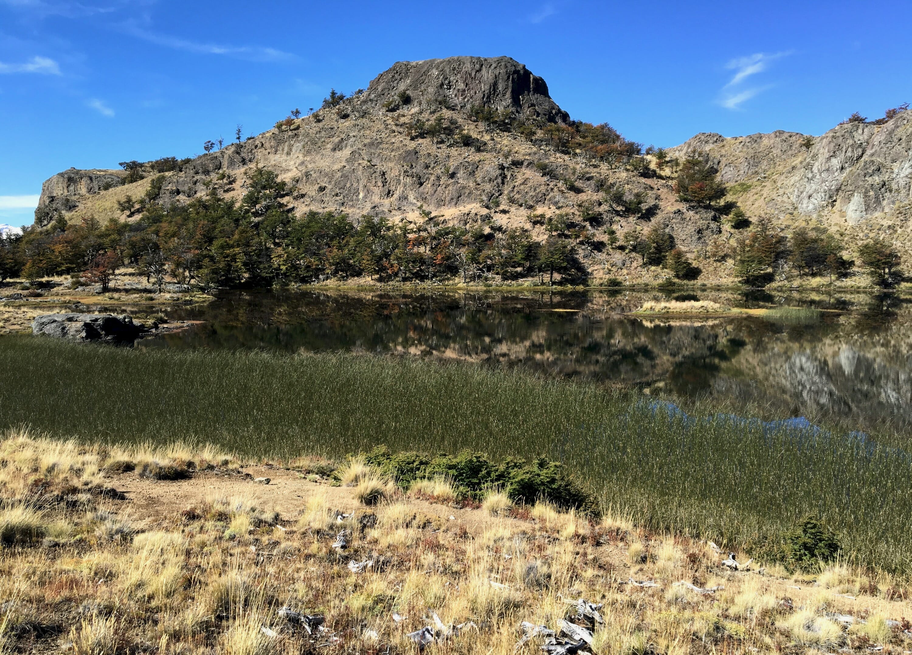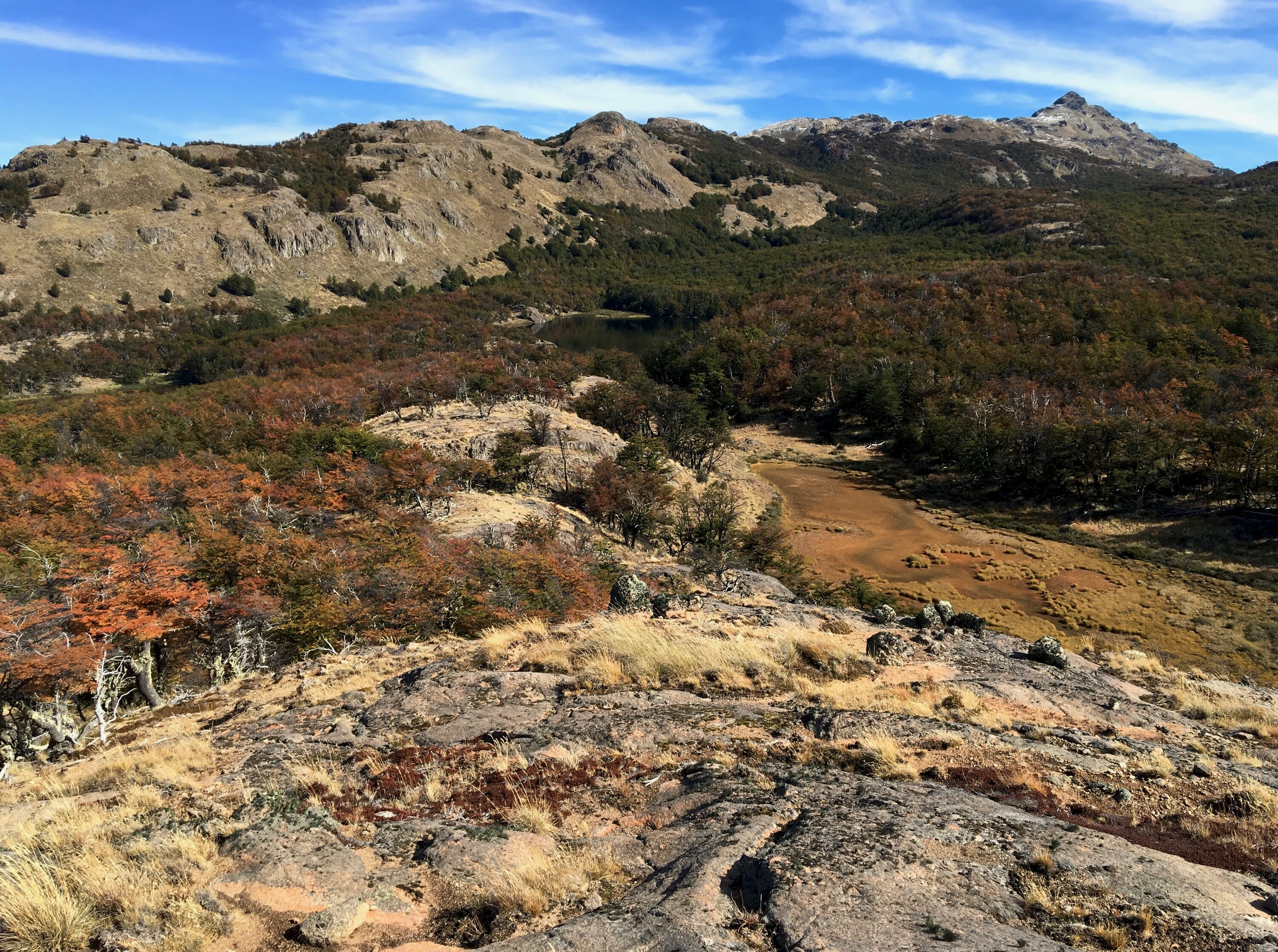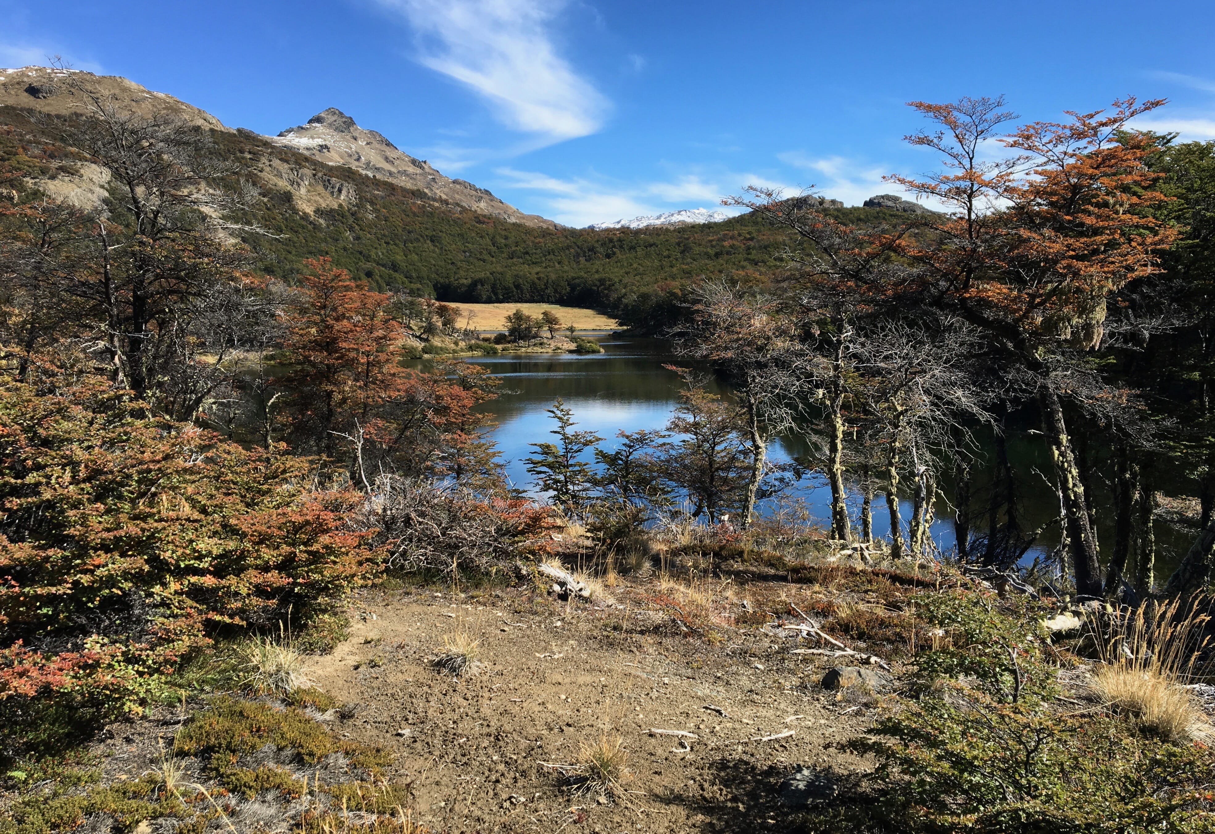 The trail then descends about 40m, presenting a views back toward the visitor’s center and restaurant and eastward toward the Argentina border. (If you skip our earlier detour to the ridge, this is a great spot to pause for photos.) Afterward, the trail winds across the plateau toward a smaller unnamed lagoon and then the larger Laguna Norita. These were less grand than the first, but the smattering of beech forest and fall colors kept things interesting. Up next was an assortment of six lagoons of varying sizes, the largest of which is Laguna Meche. (Note: the trail skirts around Meche, but does not actually take you to its shore. We did not spot an easy off-trail path to it, but if motivated you could probably find one.)