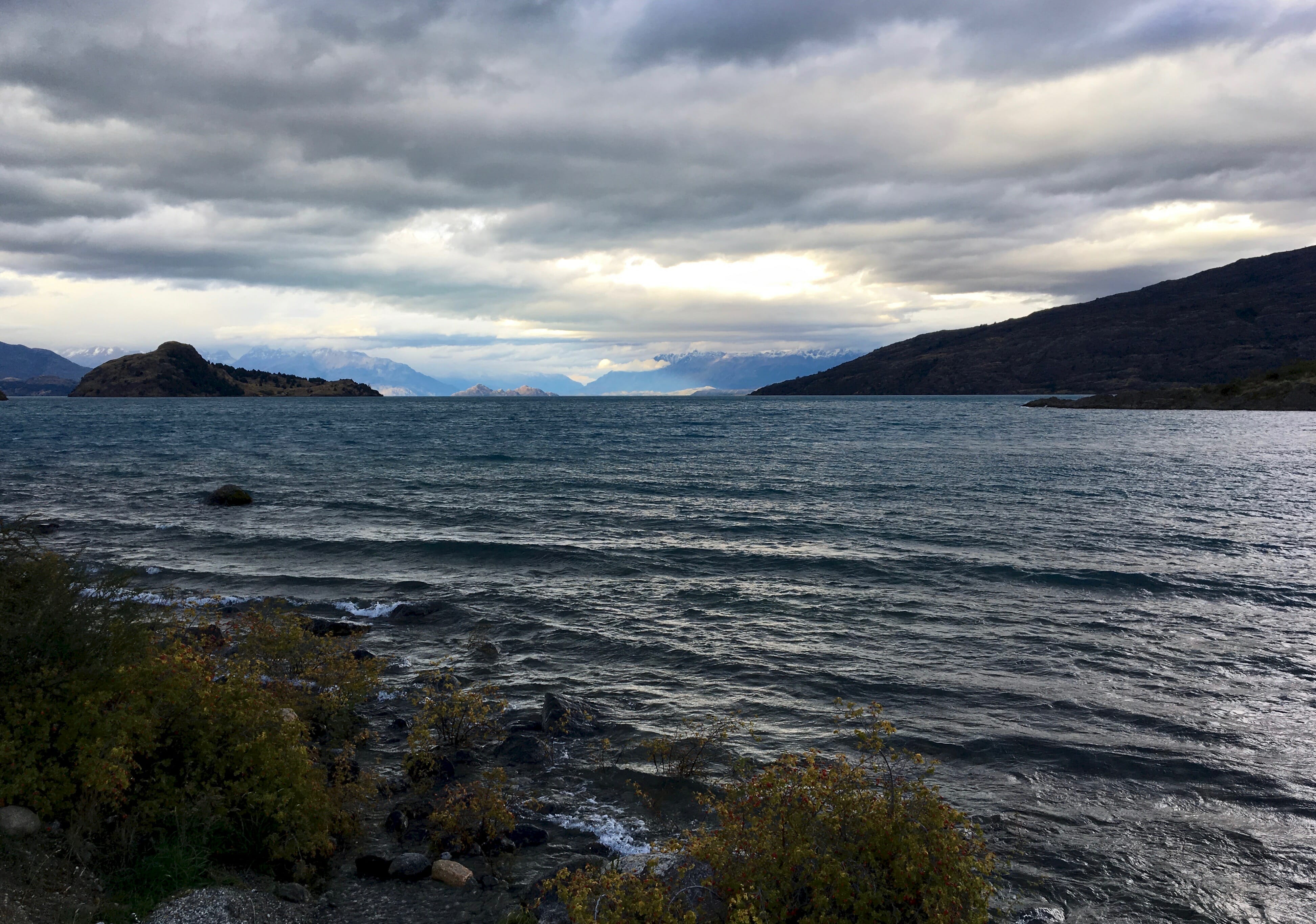 … until reaching the picturesque blue waters of Lago General Carrera at Bahía Murta. Just past this expansive lake lies Lago Bertrand, with the mountains of Parque Nacional Laguna San Rafael on its other side (and looking particularly moody on this afternoon).