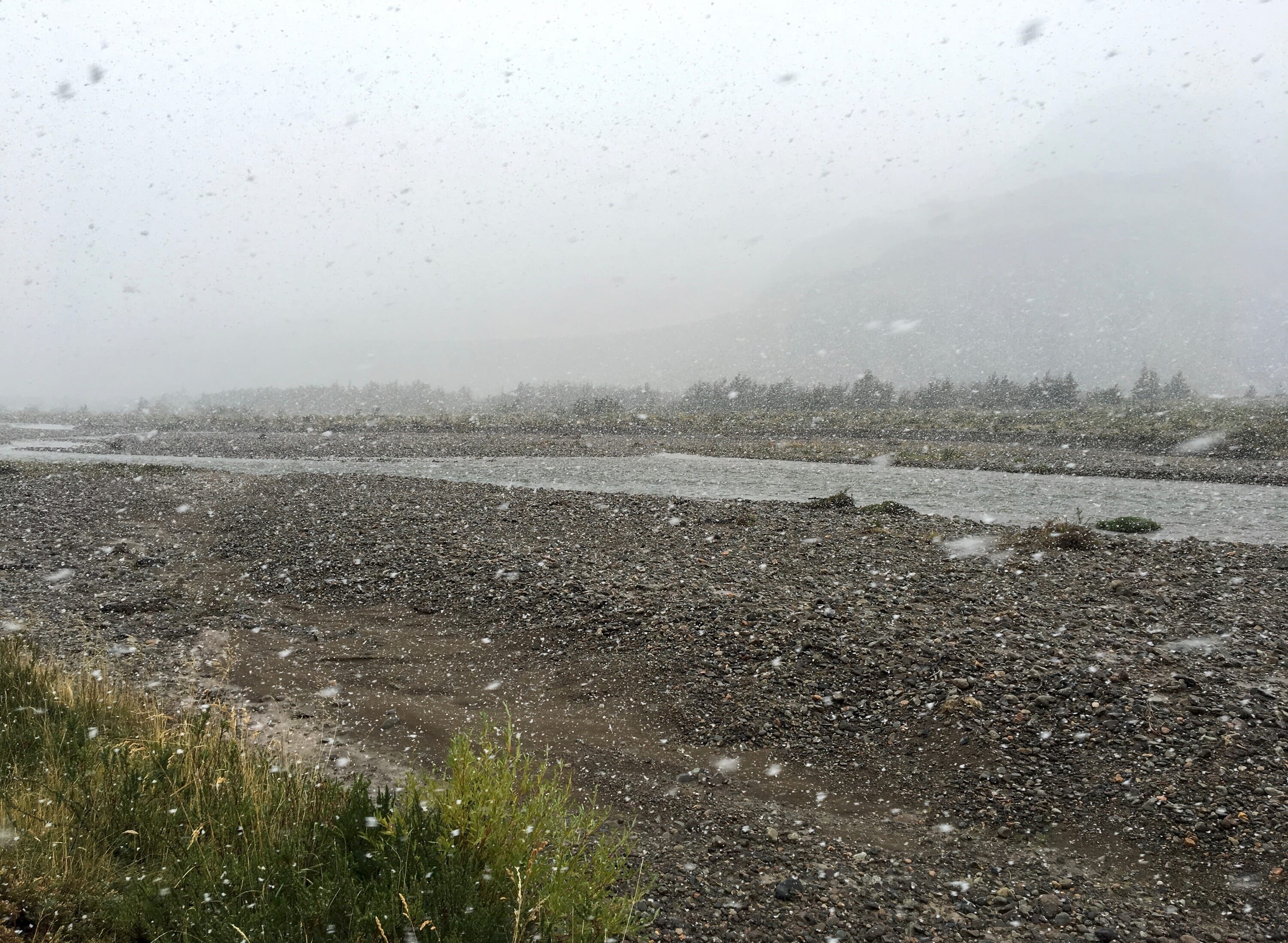 Now armed with information about trail conditions, we noted that the weather was not improving and settled on driving X-83 toward Camping Los West Winds (approximately 45km) to see what we could of the valley. Depending on the weather further up the valley, we would then decide if we wanted to drive toward the Los Gatos and Lago Chico trailheads on that questionable access road. As we slowly worked our way up the valley, we stopped often (but briefly) to snap some photos in the strong wind and clouds. By the time we reached West Winds, it was snowing enough to dust the ground white.